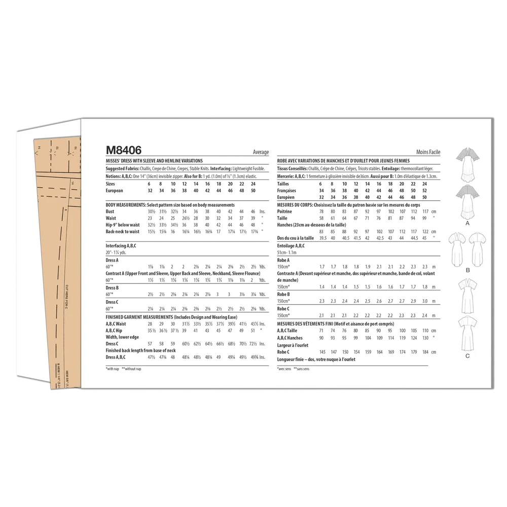 From chic pieces for special occasions to comfy and versatile daily pieces, patterns offer something for every wardrobe or clothing collection - our line even includes patterns for home essentials and play! Empire waist dress with sleeve and hemline variations has shawl collar neckline, narrow hem, bias skirt and invisible side zipper. . Sewing pattern packet comes with sewing templates, fabric recommendations, pattern pieces, sizing guides, and instructions. Can be made to fit misses' sizes 6-8-10-12-14. Proudly manufactured in the United States of America. Sewing pattern packet comes with sewing templates, fabric recommendations, pattern pieces, sizing guides, and instructions These clothing sewing patterns can be made to fit misses' sizes 6-8-10-12-14 Empire waist dress with sleeve and hemline variations has shawl collar neckline, narrow hem, bias skirt and invisible side zipper From trendy looks and casual daily pieces to themed costumes and baby accessories, patterns are the perfect way to personalize your wardrobe while sharpening your sewing skills sewing patterns are proudly designed and manufactured in the United States