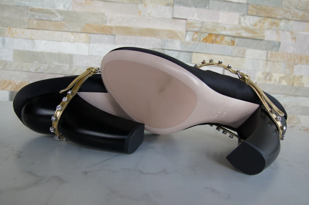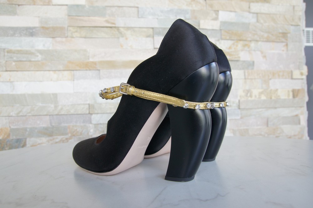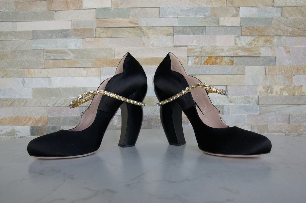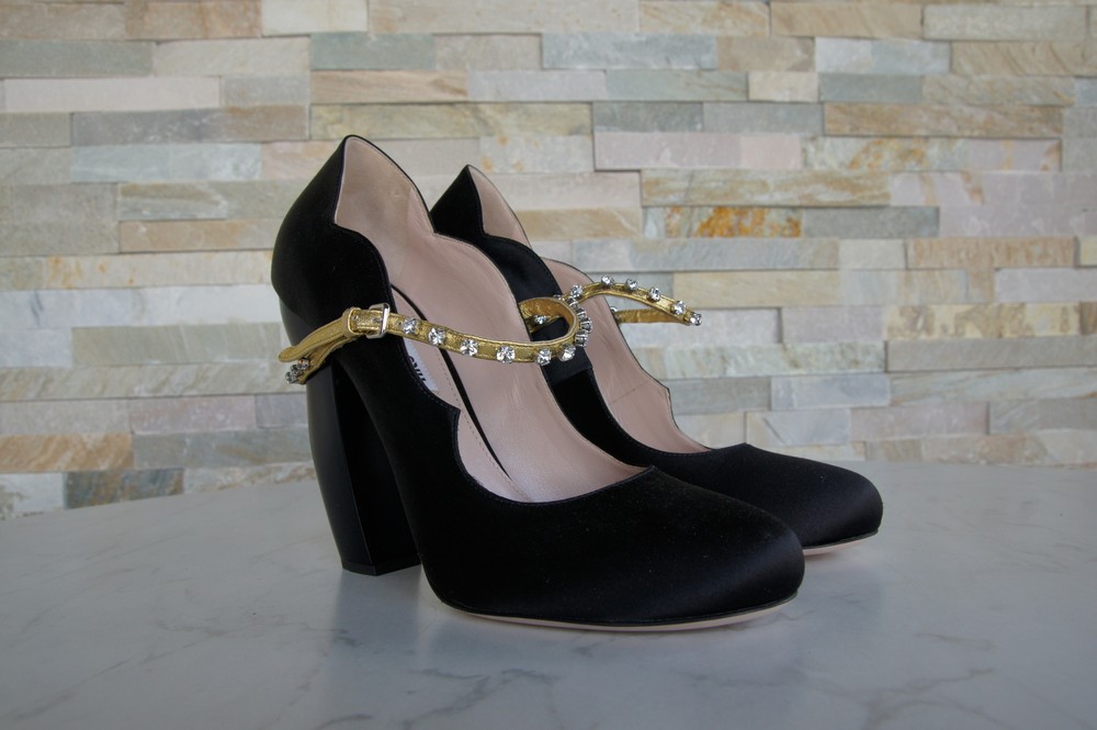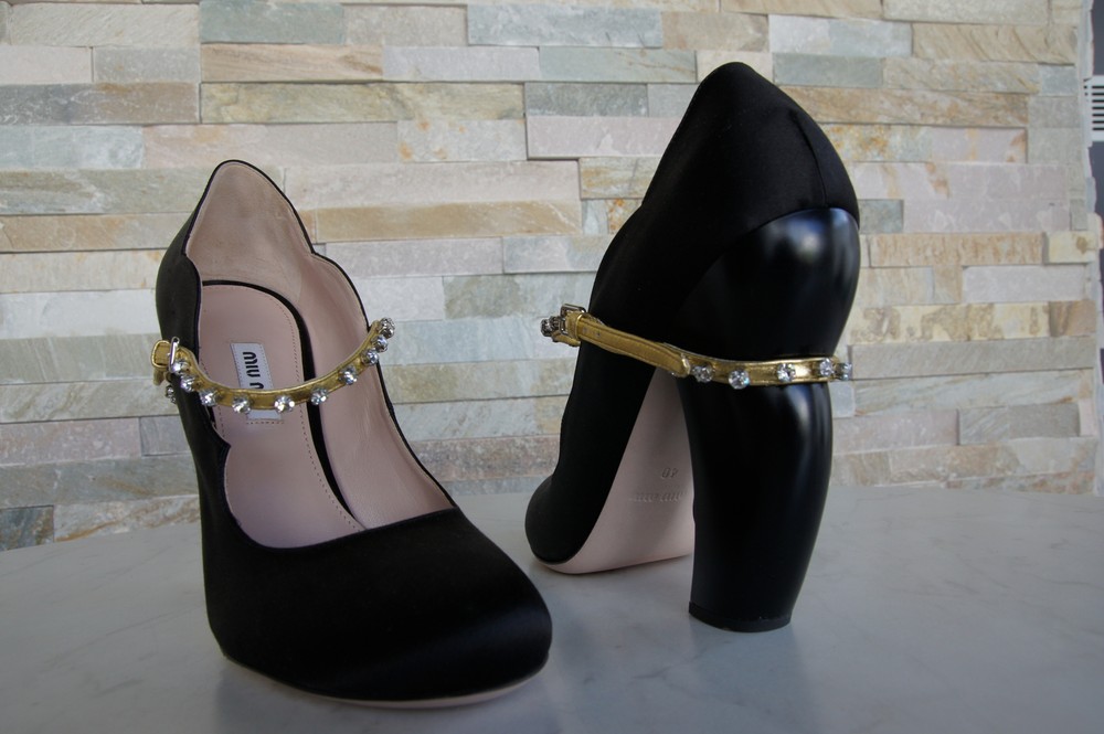 MIU MIU Pumps satin rhinestones black MIU MIU Exclusive pumps / Mary Jane / high heels made of high-quality satin. Golden adjustable leather strap with rhinestones on the instep. Leather and rubber outsole. Inner shoe made entirely of leather. Block paragraph. MIU MIU Lettering on the insole and outsole. Shoes are delivered in the original box with a shoe bag 5I822C RASO 4 NERO + ORO (BLACK + GOLD) Heel height: 12.5 cm MIU MIU Pumps satin rhinestones black MIU MIU Exclusive pumps / Mary Jane / high heels made of high-quality satin. Golden adjustable leather strap with rhinestones on the instep. Leather and rubber outsole. Inner shoe made entirely of leather. Block paragraph. MIU MIU Lettering on the insole and outsole. Shoes are delivered in the original box with a shoe bag 5I822C RASO 4 NERO + ORO (BLACK + GOLD) Heel height: 12.5 cm