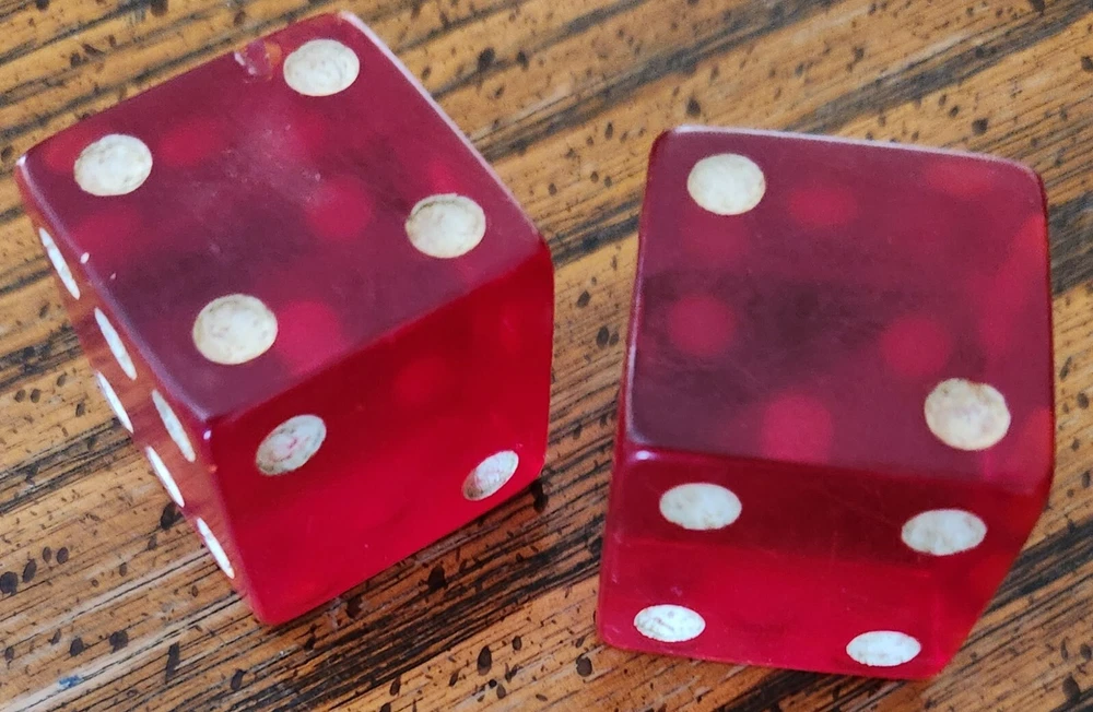 A lot of vintage dice. Made of glass, wood, plastic. Dice of all sizes & colors. Some are faded & the large red dice do have chips from age. I remember them in my Grandma's curio cabinet when I was about 5-years old, back in the early 1950s. Great conversation pieces. You are buying them 'as is'.