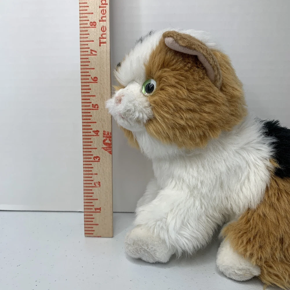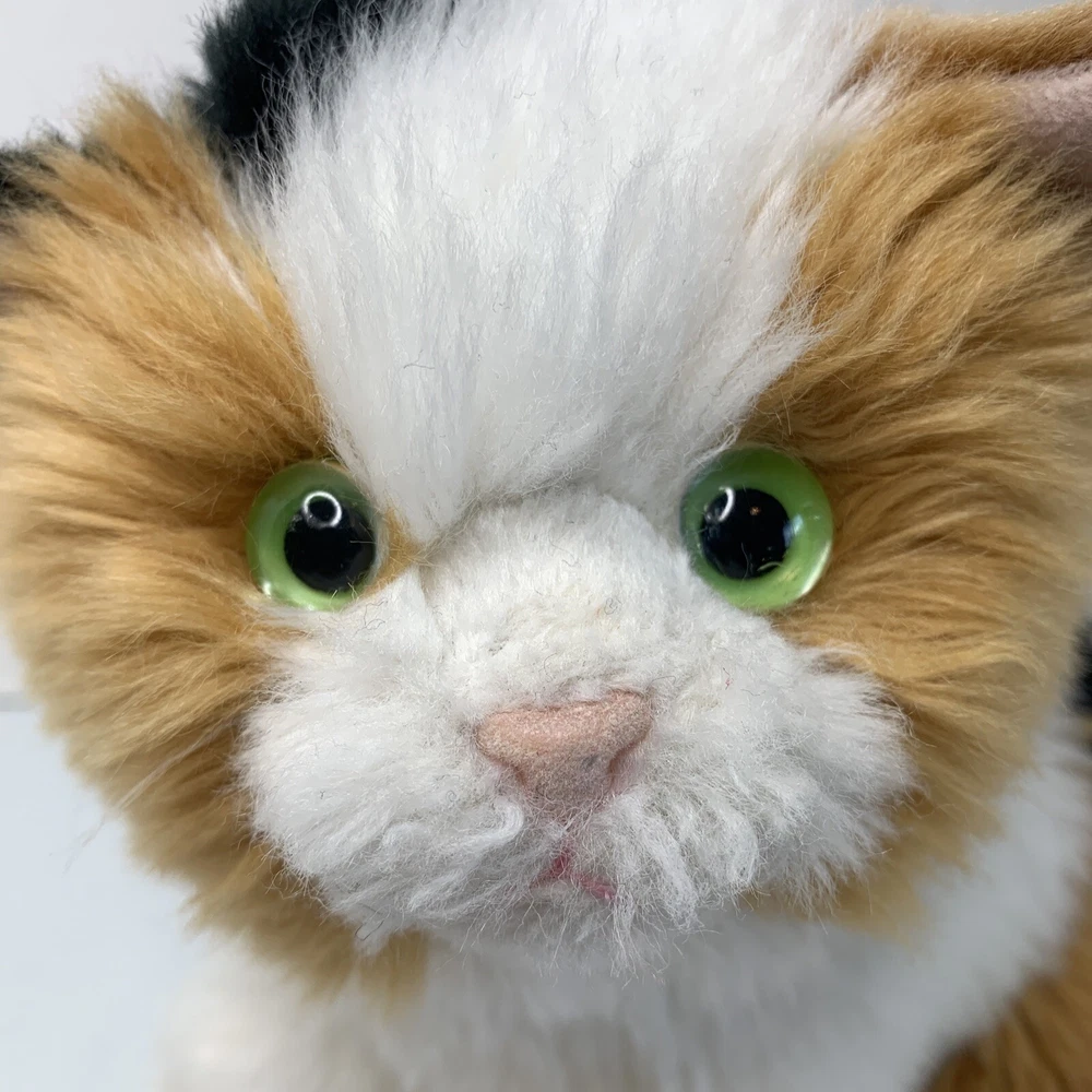 Calico Catitude! Adorable green eyed calico cat by Miyoni. Fluffy and cuddly. Paws have a little wear/discoloration from being playing with or sitting on a shelf. Can be cleaned by buyer if needed.