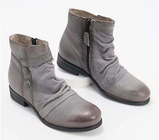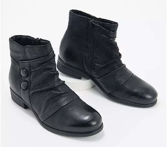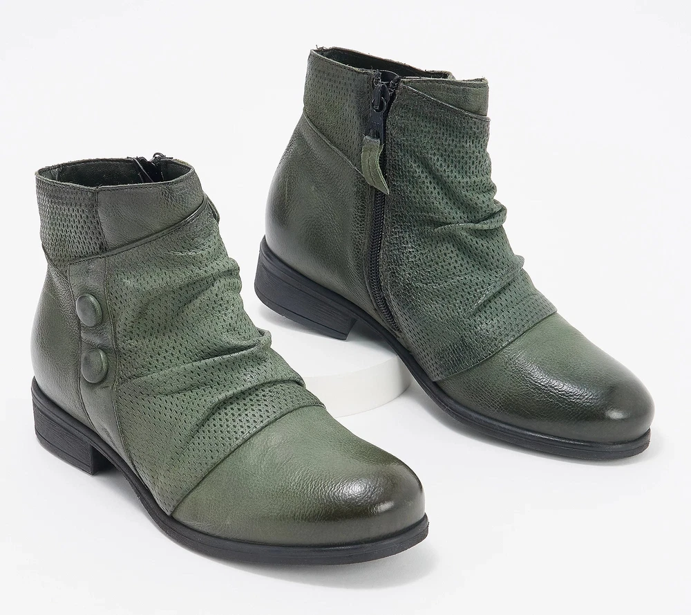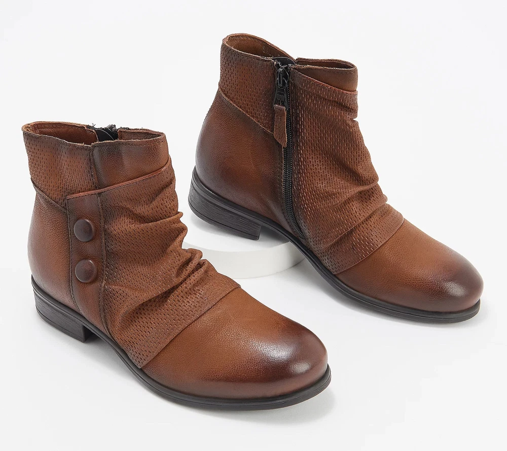 She's the cool girl. You know the one: relaxed and chic with a slightly fun edge. And, of course, always so on trend. She is Sallie. And she's one. cute. boot. Excited to wear boots again? (Us too!) Fashioned in buttery European leather, and smartly styled with bring-on-the-drama deets like a multi-textured wrap and sassy side buttons, Sallie adds that X factor to all your fall (and waaay beyond) 'fits. Here's our rec: hang up the yoga pants and have fun dressing up again. Imagine everything from frayed denim and dusters to floaty floral dresses to chunky sweaters and wide-leg crops -- all teamed with this wear-everywhere pair (oh, the possibilities!). The burnished finish brings on a decidedly downtown vibe (okay, throw those yogas back on for some thrifting!), yet these cutie booties are just as comfortable fitting in with the cappuccino and croissants crew, too. And comfort? Add in a cushioned insole, soft microfleece lining, and rubber-gripping outsole, and these boots were made for walking (and some serious head-turning). From Miz Mooz. Style: Sallie European leather upper, burnished details, multi-textured wrap design, two decorative leather buttons, inside zip entry, slight almond toe Leather/microfleece lining, cushioned insole, rubber outsole Approximate measurements: Heel 1-1/8"H; Sole 1/4"H; Shaft 4-3/4"H; Circumference 10-5/8" Measurements were taken using a Medium size 9; measurements may vary depending on size Fit: true to size Leather upper; leather/man-made lining; man-made outsole Imported