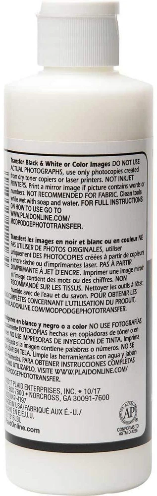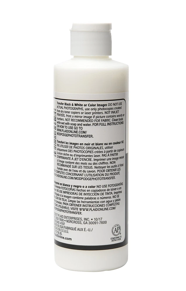 Use Mod Podge Clear Image Transfer Medium to personalize all your DIY projects. Use photocopies of your favorite photos and artwork to create unique arts and crafts on wood, glass, metal, canvas and more with Mod Podge Clear Image Transfer Medium. Photos must be printed on a laser, dry toner printer. This formula is a water-based, non-toxic medium that provides the ability to transfer any photocopied image onto a variety of surfaces without creating a paper halo around the transferred image. For best results, use on hard surfaces. Once your image is transferred, you will be able to clearly see your surface, compared to Mod Podge Photo Transfer Medium that transfers everything, including the background color. This formula works great on light colored surfaces. Mod Podge Clear Image Transfer Medium dries to a clear, matte finish - perfect for all your arts and crafts! Make Mod Podge Clear Image Transfer Medium a must-have formula in your decoupage art supplies. CONVENIENT SIZE – Add this unique clear photo transfer medium in a 8 oz bottle to your art supplies for a simple way to personalize your arts and crafts SIMPLE, SMOOTH FINISH - Apply this creamy formula with brushes or sponges to your photocopy and surface. Use images printed on a dry toner printer USE ON MULTIPLE SURFACES – This formula works on a variety of light surfaces such as wood, metal, canvas, terra cotta, and more - making this a must-have product for all your arts and crafts. For best results, use on hard surfaces EASY TO CLEAN UP – Clean up is easy with Mod Podge! When you’re finished with your decoupage project, simply clean up any extra with soap and water MANUFACTURING – Mod Podge Clear Image Transfer Medium is proudly made in the USA! FORMULA – Mod Podge Clear Image Transfer Medium is a water-based, non-toxic formula great for crafting with all ages. Expand your decoupage supplies with this retro brand!