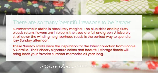 1 Moda Charm Pack SUNDAY STROLL by Bonnie & Camille 42 ~ 5" squares NOTE: All Moda Charm Packs may include some duplicate prints in the line. Pastry Shop Quilts Where Every order is a gift to yourself Generous Cuts packaged with Great Care Pet Free ~ Smoke Free Environment