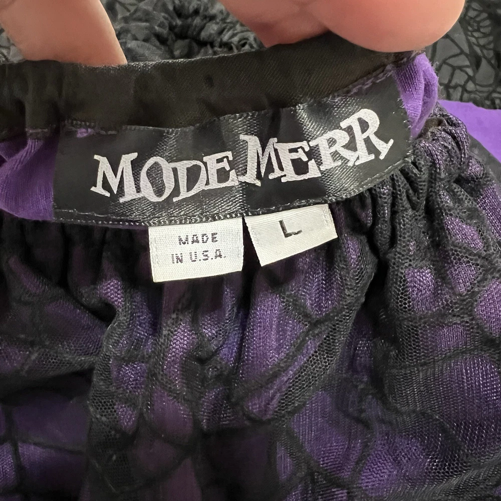 Approximate measurements: Across underarms - 16" Waist - 14" Length - 43" -pullover styling, stretchy fabric, satin fabric to the chest with mesh overlay, elastic neckline and sleeves, velvet spider web detailing to the ruffle trim -tiny spots/marks on the upper back as pictured -Made in USA Great preowned condition