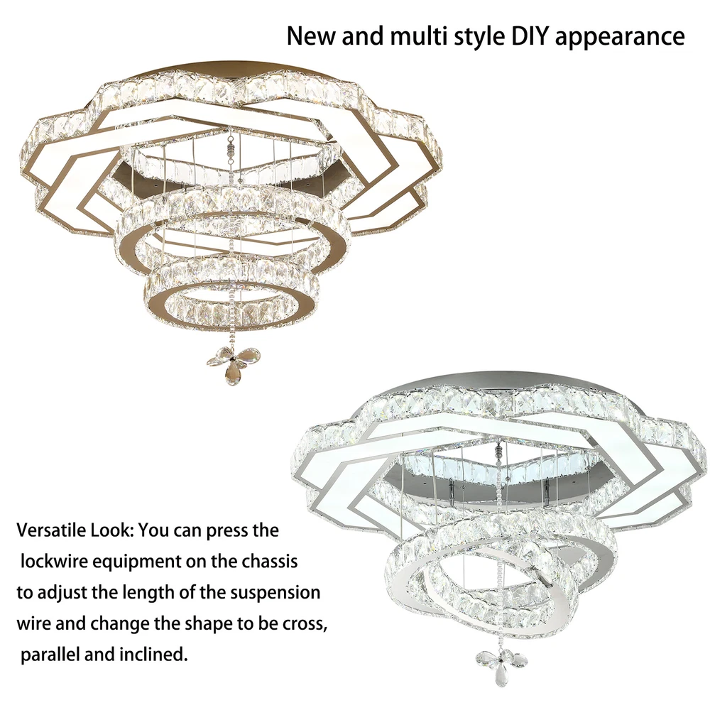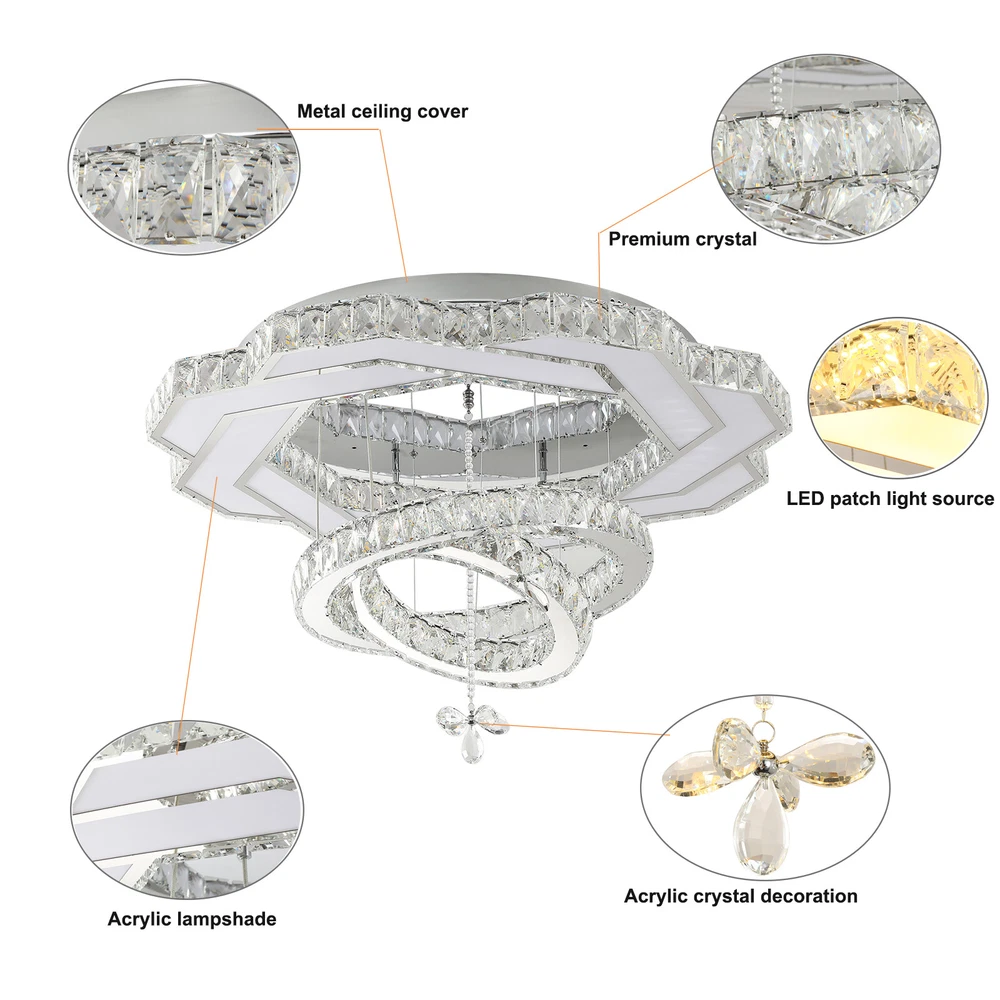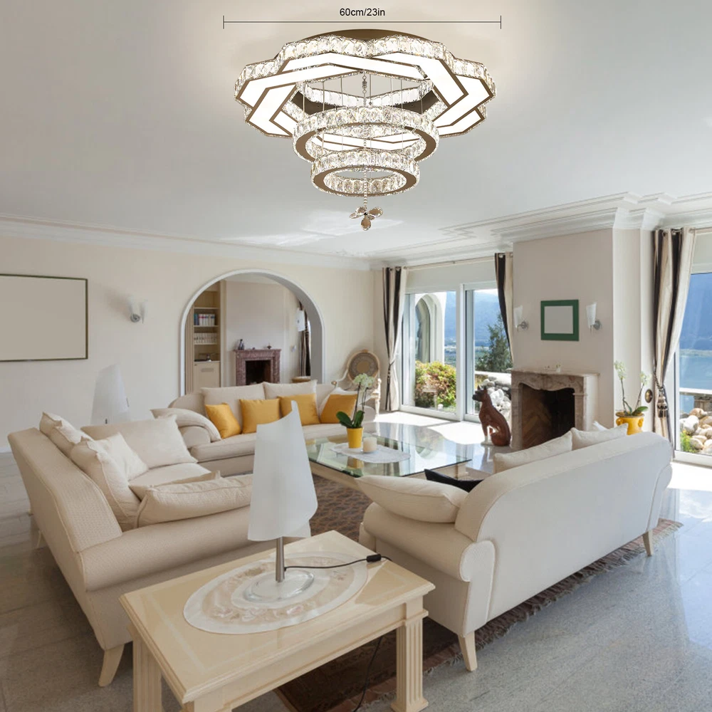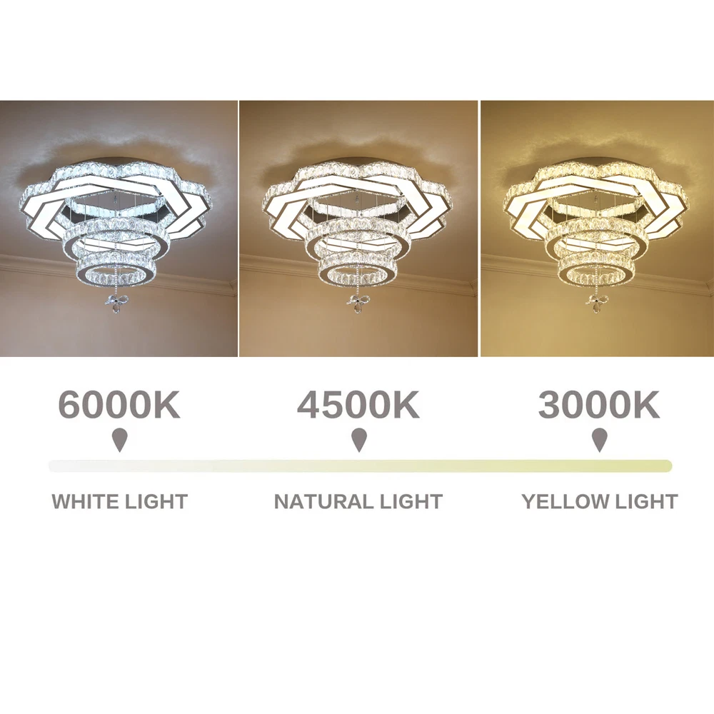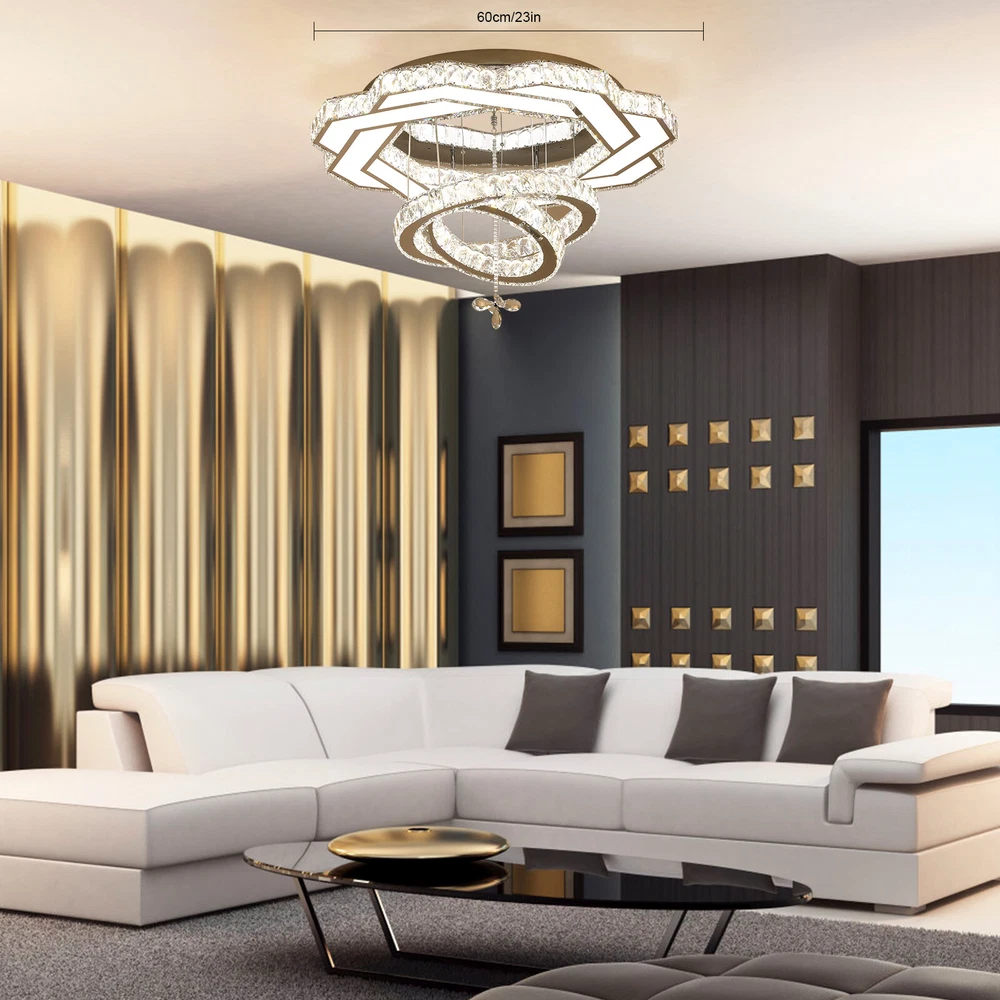 Modern 23.6inches Large Crystal Chandelier Round Ring Dimmable Living Room Lamps Description Bright and colorful lights can bring charm and warmth to your room, and light up your life. Made of premium iron, stainless steel, and crystal, this round crystal ceiling light is strong and durable. With 4 LED lights and a built-in intelligent driver, it can create bright light with great safety. It will be a great addition to your house. Key Features Stylish&Luxious Exterior: The clear crystal and glossy metal complement each other to create a sense of beauty. Meanwhile, the combination of rhombic and annular shapes makes this product look very luxurious, making it a good decorative piece to blend in with different decor styles and add color to the space. Great Durability : The stainless steel is rust-resistant with high strength, good toughness, and good formability. The crystal with high transparency is heat-resistant, strong, durable, and not easy to deform. Versatile Look: You can press the lockwire equipment on the chassis to adjust the length of the suspension wire and change the shape to be cross, parallel and inclined. Adjustable Working Time: You can control its working hours in advance (0.5/1 hour), which can bring you great convenience. Safer to Use: With a built-in intelligent driver, it can provide constant current protection, overload protection, low voltage protection, and short circuit protection, which is safe and reliable. Stepless Dimming: This light has three light colors (White/Neutral/Warm Light) with a color temperature of 3000K-4500K-6000K. Meanwhile, the brightness can be adjusted infinitely from 5% to 100% to meet different light needs. Large Applicable Area: The item can serve an area of 15-25m²/161.46-269ft². So you can feel the illumination over a considerable area. Memory Function: It can automatically memorize the color and brightness of the lamp, and keep consistent when it is used next time, which can avoid frequent settings and save a lot of energy. LED Light Source: The product uses four eye-friendly LED lights with a CRI of more than 85 and high brightness, which is energy-saving without dazzling and flashing, and allows you to experience more natural and bright colors. It can be used for about 30000 hours, saving your use cost. Excellent Gift: The beautiful appearance and good practicality make it a great gift for parents, friends, and lovers on birthdays and holidays. Protective Packaging: This product comes in a custom foam that resists compression and falls to prevent product damage in transit. Guaranteed Customer Service: We aim to provide quality products and services. If you have problems, please feel free to contact us. We will reply and solve the problem for you as soon as possible. Details Remote Control: It allows you to remotely control the timing, brightness, light color, etc within 3m/9ft, saving you lots of effort. Round Base: It increases stress area, and can make the ceiling light fixed firm without falling easily. Application It is suitable for the living room, dining room, study bedroom, small bedroom, conference room, and other places of 15-25m²/161.46-269ft². Specification Model: YL091 Color: White, Clear Material: Iron, Stainless Steel, Crystal Style: Modern Shape: Round Rated Voltage: 110-240V Rated Power: 80W Plug Type: US Standard Light Source Type: LED (Included) Light Color: White, Neutral, Warm Light Color Teperature: 3000K-4500K-6000K CRI: >85 Timing: 0.5h/1h Service Time: About 30000h Luminous Flux: 4550 Lumen Efficiency: A+ Brightness: From 5% to 100% (Stepless Adjustment) Battery Type: 2* AAA Batteries (Not Included) Control Method: Remote Control Mount Type: Ceiling Mount Applicable Area: 15-25m²/161.46-269ft² Maximum Remote Control Distance: 3m/9ft Number of LED Lights: 4 Assembly Required: Yes Product Height: 60cm/23.6inch Product Length: 60cm/23.6inch Package Included 1* Round Crystal Ceiling Light 1* Remote Control 1* English Manual All Accessories for Installation Notes Please check the dimensions of the product before ordering to ensure it fits your home. Please wear electric insulation gloves and avoid scratching the surface of the lamp plate and the electric wire when installing. Please make sure that the power supply has been cut off before installation, and conduct a power test before installation. Please note that the remote control distance is 3m/9.84ft, please aim at the ceiling lamp when using it. Please use the lamp within the applicable voltage range and clean lamps regularly. Please cut off the power supply when you clean the light or replace light bulbs. Please note that the batteries for the remote control are not included in the package, you need to prepare two AAA batteries yourself. Please read the manual completely before installation, pay particular attention to the safety instructions included, and use the product in strict accordance with the instructions. Please allow the slight color difference caused by the shooting light and 1-3cm error due to manual measurement, and make sure you do not mind before ordering. Payment Delivery details Terms of sales About us Contact us Payment We accept ebay payment 。 Fees such as import duties, taxes are not included in the item price or shipping costs. These charges are the buyer's responsibility. Delivery details Shipping: 2-9 working days to: USA Terms of sales We maintain high standards of excellence and strive for hundred percent customer satisfaction. Feedback is very important to us. We hope that you contact us immediately before you give neutral or negative feedback, so that we can address your concerns. It is impossible to address issues if we do not know about them! About us Your satis faction is our ultimate goal. We work hard to earn your trust and future business. Our certified technicians have tested each item before shipping. The unit comes with 1 year limited warranty on all manufacturing defects. a) If you receive a defective item, you may