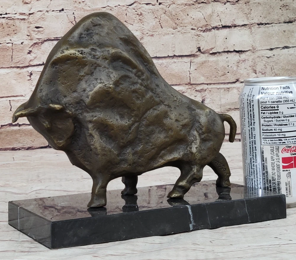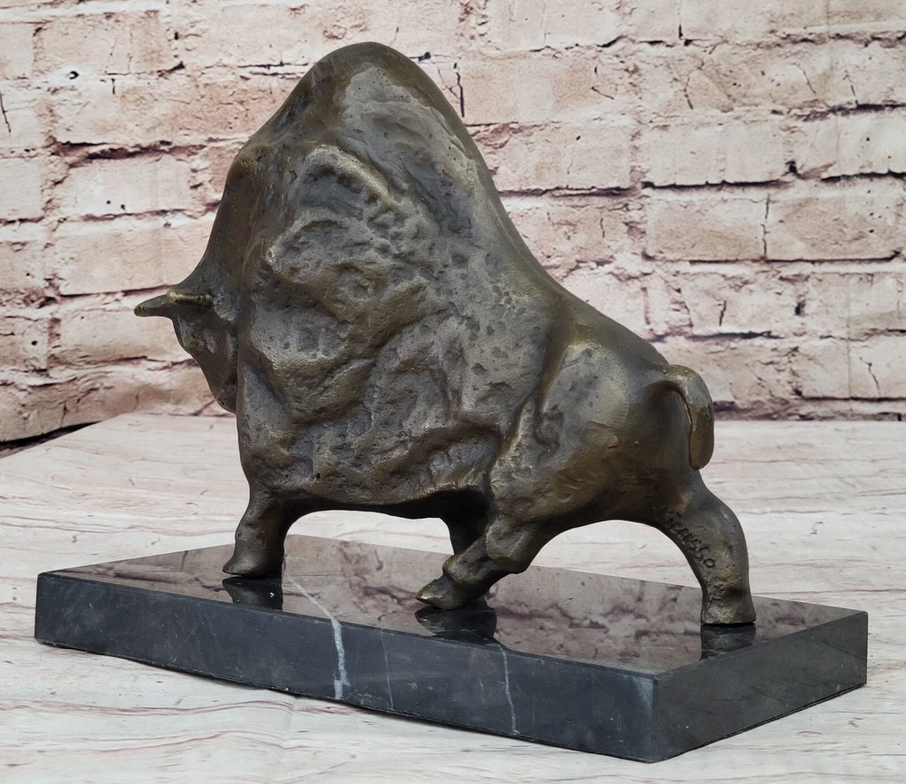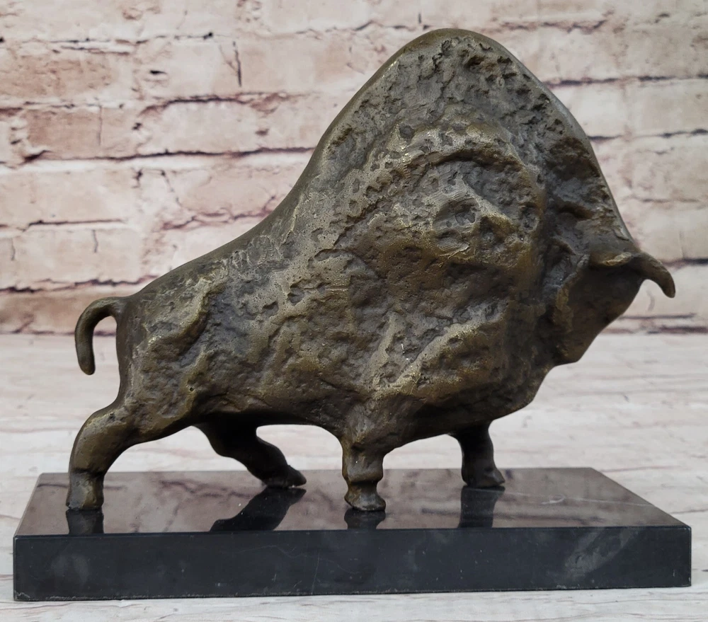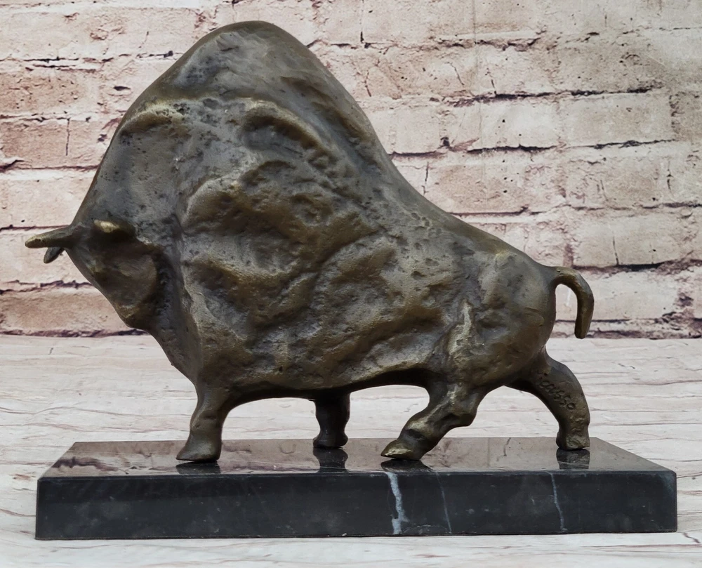 Condition: This sculpture is in perfect condition Bronze Dimensions with Marble Base: Height 8"" X Width 8.5"" Marble Dimensions:8.5"" X 5"" Height without base:7"" Weight:9 LBS Inventory:31YCN0434216 Introducing an exquisite animal bronze sculpture inspired by Pablo Picasso's modern art - the chubby abstract bull. This detailed artwork portrays the bull with a motive full of strength and fighting spirit, symbolizing victory against adversaries. The bull is also known as a symbol for increasing stock levels, making this sculpture a unique addition to any space. Crafted with utmost precision, the bronze cast is of the finest quality, capturing the intricate details of the original artwork. This impressive and fantastic art object was initially created for an exhibition, appealing to art enthusiasts and collectors of modern art.Hand-cast in our own foundry, this bronze exhibit undergoes strict quality inspections throughout the entire fabrication process, ensuring its excellence. Employing the time-honored lost-wax casting method, each sculpture is exclusive and uniquely compounded. The result is a filigree masterpiece that showcases the artistry and craftsmanship behind every creation. Whether displayed in a gallery, home, or office, this animal bronze sculpture is sure to captivate and inspire with its artistic brilliance and symbolic significance. Embrace the spirit of modern art and the timeless allure of bronze with this exceptional piece. 100% Abstract Modern Art Picasso Bull Bronze Masterpiece Hot Cast Sculpture www.bronzhaus.com Video will open in a new window Using the eBay App? Paste link into a browser window: [isdntekvideo]