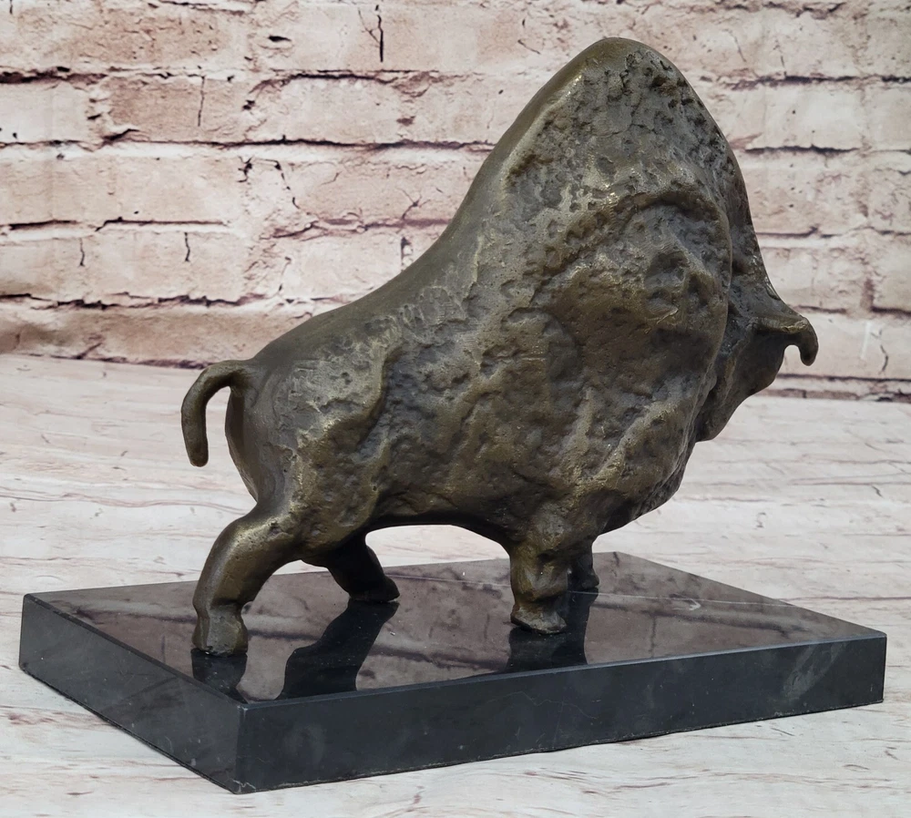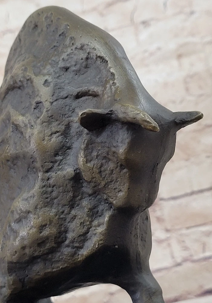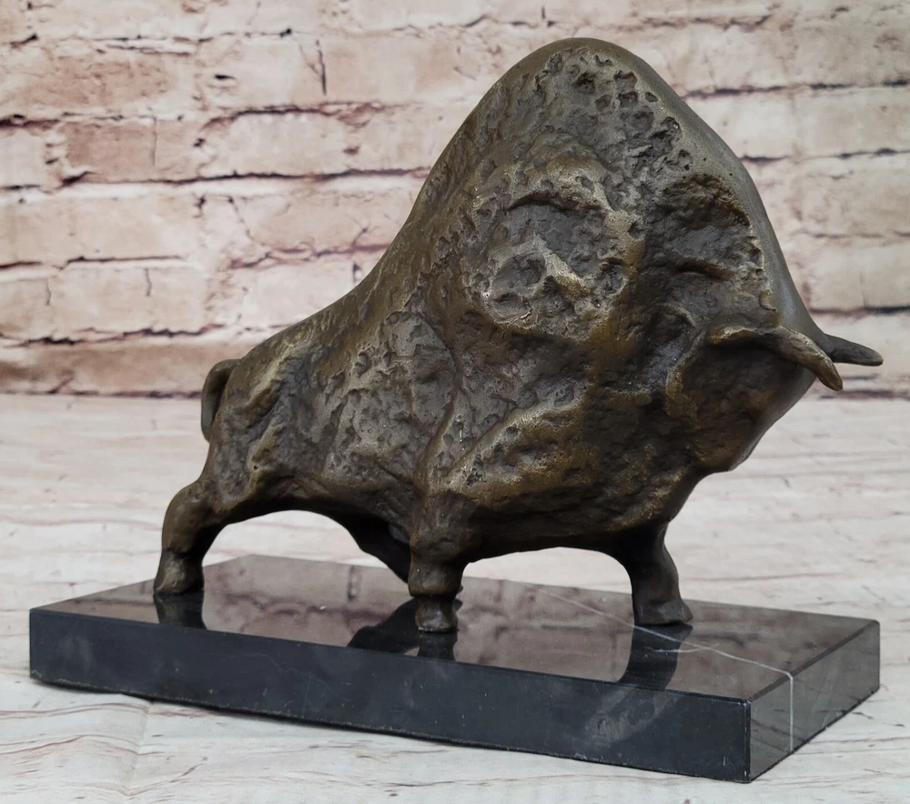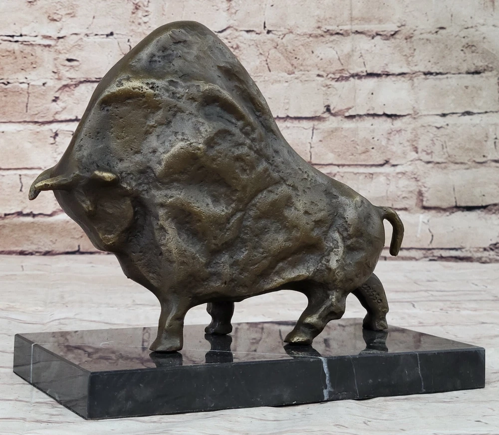 Condition: This sculpture is in perfect condition Bronze Dimensions with Marble Base: Height 8"" X Width 8.5"" Marble Dimensions:8.5"" X 5"" Height without base:7"" Weight:9 LBS Inventory:31YCN0434216 Introducing an exquisite animal bronze sculpture inspired by Pablo Picasso's modern art - the chubby abstract bull. This detailed artwork portrays the bull with a motive full of strength and fighting spirit, symbolizing victory against adversaries. The bull is also known as a symbol for increasing stock levels, making this sculpture a unique addition to any space. Crafted with utmost precision, the bronze cast is of the finest quality, capturing the intricate details of the original artwork. This impressive and fantastic art object was initially created for an exhibition, appealing to art enthusiasts and collectors of modern art.Hand-cast in our own foundry, this bronze exhibit undergoes strict quality inspections throughout the entire fabrication process, ensuring its excellence. Employing the time-honored lost-wax casting method, each sculpture is exclusive and uniquely compounded. The result is a filigree masterpiece that showcases the artistry and craftsmanship behind every creation. Whether displayed in a gallery, home, or office, this animal bronze sculpture is sure to captivate and inspire with its artistic brilliance and symbolic significance. Embrace the spirit of modern art and the timeless allure of bronze with this exceptional piece. 100% Abstract Modern Art Picasso Bull Bronze Masterpiece Hot Cast Sculpture www.bronzhaus.com Video will open in a new window Using the eBay App? Paste link into a browser window: [isdntekvideo]