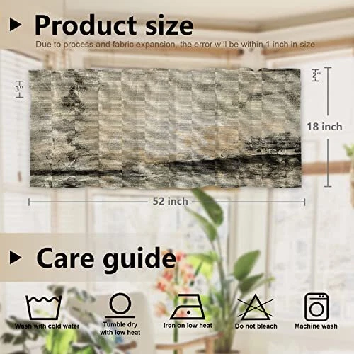 Return Policy Fast Delivery Trusted seller Art Abstract Grey Brown Kitchen Valances Half Window Curtain, Watercolor Oil Abstract in Light Grey and White Blackout Decoration Window Valances Curtains Drapes for Kitchen Bedroom Product Description Dimensions: Standard size 52x18 inch,set of 2 including 2 inch header and 3 inch rod pocket.After the curtain is straightened, it is suitable for windows with a length of 40-44 inches. If you want to make the curtain appear wrinkled, it is recommended to use the curtain for windows with a length of 26-35 inches. Material: The valance is made of 2 layers of high quality polyester fabric with a black shading layer in the middle. High-definition laser-printing pattern is lively, vivid.Due to the black shading layer in the middle of the curtain, the overall tone is slightly gray. Production Characteristics: Different pattern is perfect for protecting privacy and reducing light.Cozy and flowing, just enough to soften a stark window frame without blocking natural light, Colorful valance is also a beautiful decoration and brings fun to your house. Care Guide:Easy to clean. Machine washable,aslo wash your hands gently with cold water and dry only in the shade. Wash with cold water and gently circulate. Dry at low temperature and do not bleach. You can easily iron at low temperatures. Special Reminder: T will be creases after the curtain is packaged, and the texture of the crease will become larger when it is unfolded, but it can be restored after it is flat. The surface of the curtain is smooth, and contact with sharp objects will scratch the fabric. Shipping Returns Payment Shipping Shipping is FREE to all addresses other than APO/PO boxes in the lower 48 states. All our stock ships from US-based warehouses. Shipped via USPS or UPS (depending on location and package weight) Unless stated otherwise, all orders will ship within 24-72 hours of your payment being processed. Check our feedback to see the great reviews of FAST shipping we offer. Returns Seller does not accept returns Payment We currently accept payment via eBay managed payments only. Once payment is cleared, we will dispatch your shipment within 1-3 business days. Please refer to the "Shipping" tab for more information regarding shipping speed to your destination.