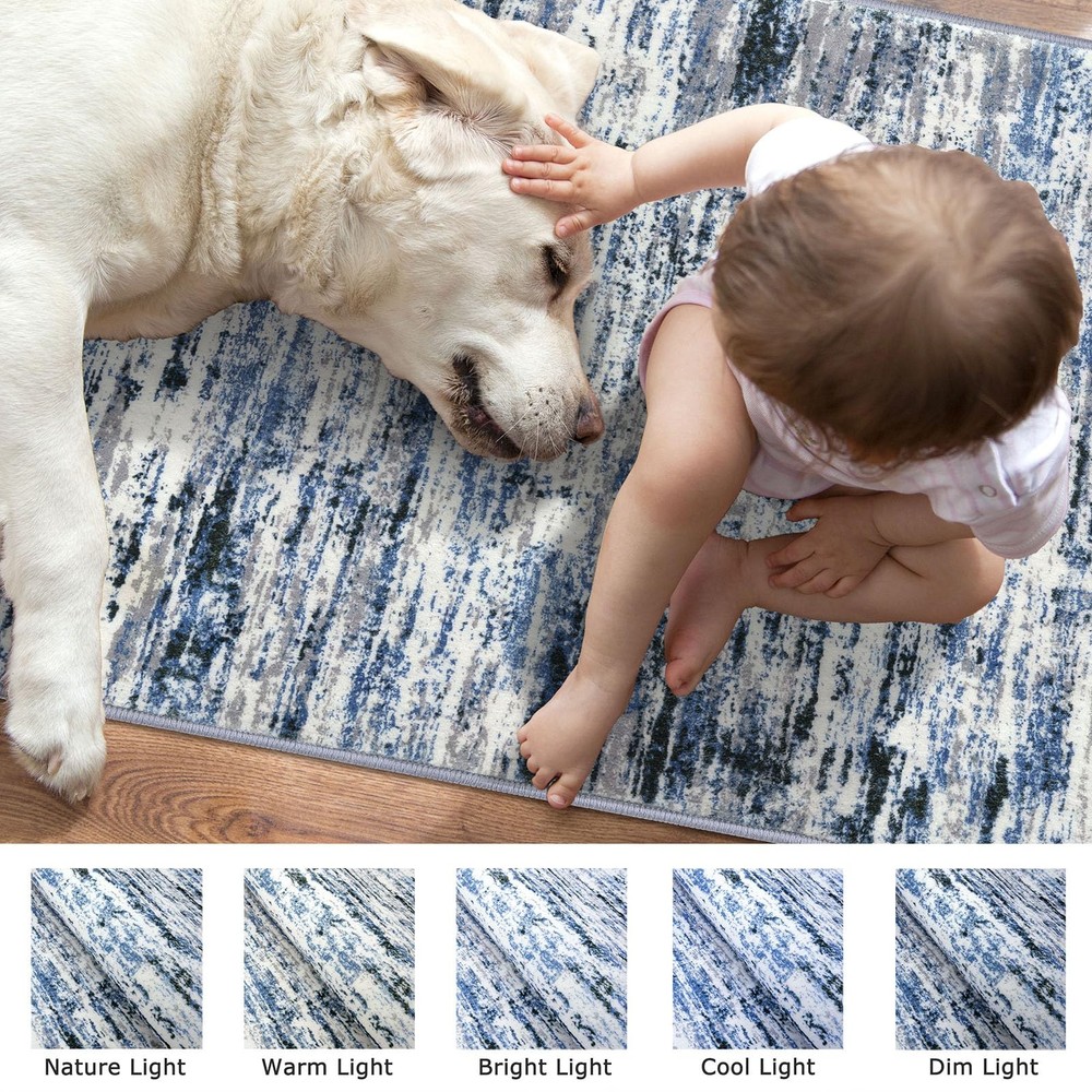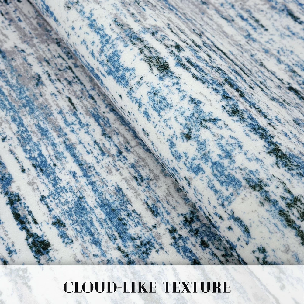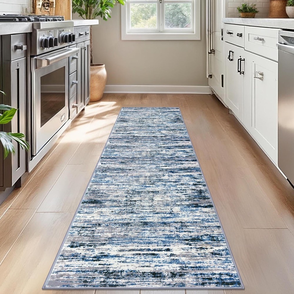 This kitchen mat adds a to any room. Perfect as a bedside rug, bedroom rug, kitchen rug, or living room rug, its versatile style blends seamlessly with any interior design. The hallway runner rug features a captivating Modern Ombre pattern, which brings a vintage charm to your space. Non-Slip This washable rug runner is designed to be non-slip, ensuring it stays in place on hardwood floors. The front door rug is also washable, making it a practical choice for high-traffic areas. Versatile This entryway rug is not just for indoors, but it can also be used as a small outdoor rug, perfect for your patio or balcony. Note on Appearance: Due to shipping folds, the rug may have temporary wrinkles. Don't fret, it'll regain its shape soon. For a quicker fix, roll it in reverse,place it upside down, or use weights to press it flat. Alternatively, a quick iron on a low setting will do the trick. Care Instructions: For longevity, wash on a delicate cycle using a mild detergent. Note: Like most dark cotton items, it may shrink up to an inch. Air dry to prevent added shrinkage. If needed, gently stretch or iron on low to restore its form. Key Reminder: To smooth out creases, first add a wet towel on the back and iron on a low heat setting; Next, reverse fold and roll it for up to a week; Then, place weights evenly if needed; Finally, lay it flat in an open space; Note: Slight color variations may occur under different lighting, making it appear brighter than in photos Rug Specs: Size: 2x7 Feet (24x84 Inches); Thickness: 0.32 inch; Color: Grey Blue White; A vibrant blue mixed with gray streaks, providing a fresh and modern appeal; Ideal for hallways, entryways, or along kitchen counters, adding soft and style to narrow spaces Machine Washable and Vacuuming Tips: Sweep or wipe the hallway runner for daily upkeep; Use low-speed vacuuming to prevent movement or bunching; For deeper cleaning, machine wash in cold water and avoid bleach to preserve colors Non-Slip Backing: This hallway runner rug features a TPE rubber backing that keeps it securely in place, preventing movement and protecting floors from heavy traffic Ultra-Soft and Safe: This abstract rug runner is soft, durable, and fade-resistant; The ombre print of 2x7 runner rug blends with any decor, making it a versatile addition; Ideal for hallways, it combines luxury with practicality Kid and Pet Friendly: This washable rug runner is ideal for kids and pets; Its low-pile surface prevents pet hair buildup and is easy to clean; Durable construction resists chewing, scratching, and snags, making it a safe, practical choice for any home Foldable and Versatile: The hallway rug runner is foldable for easy storage, great for those who frequently change decor; This 2x7 rug serves as a bedside rug or kitchen rug; It enhances your home's beauty while being practical