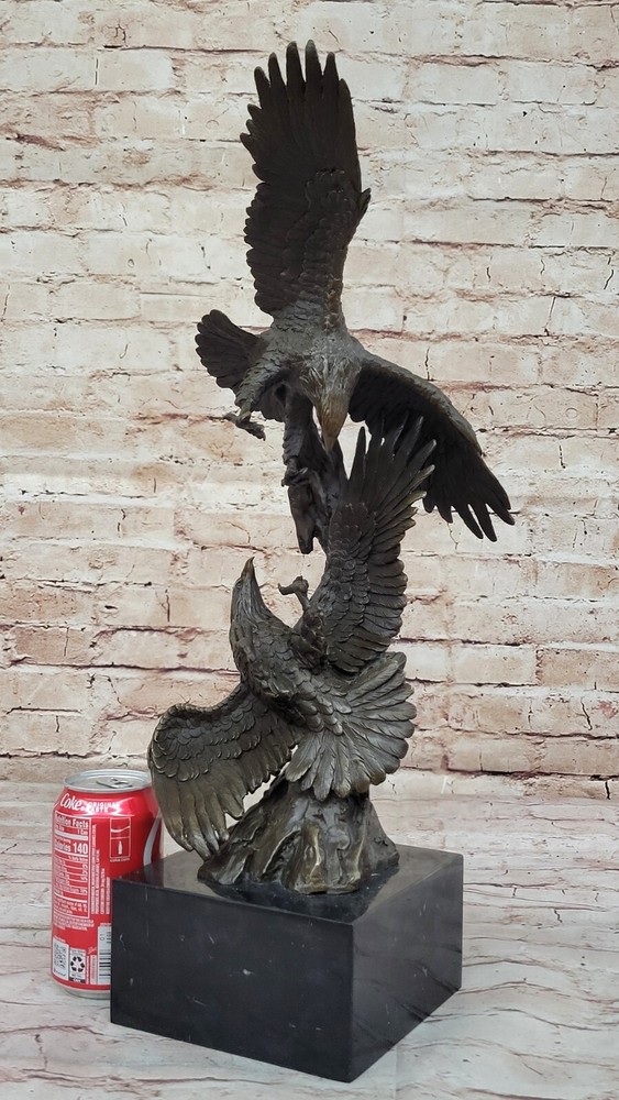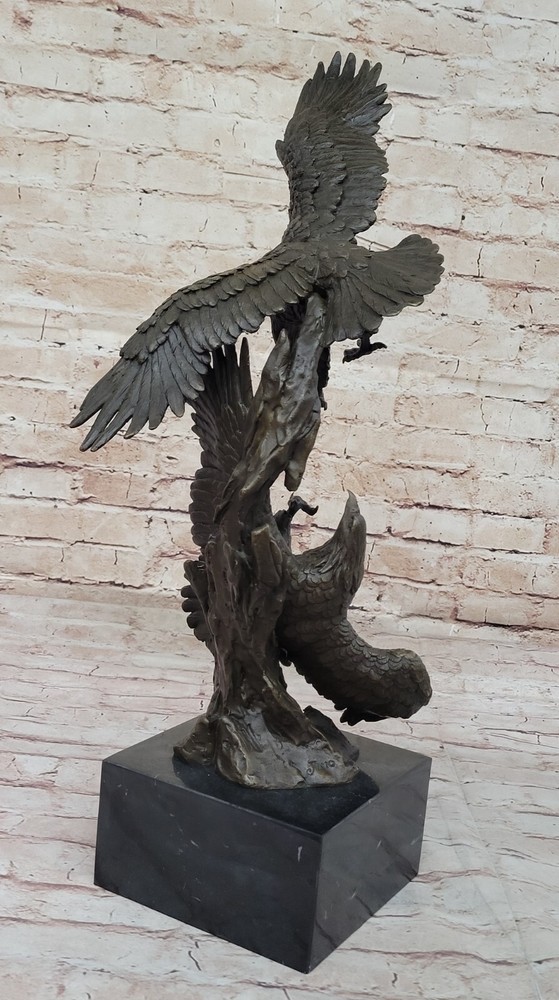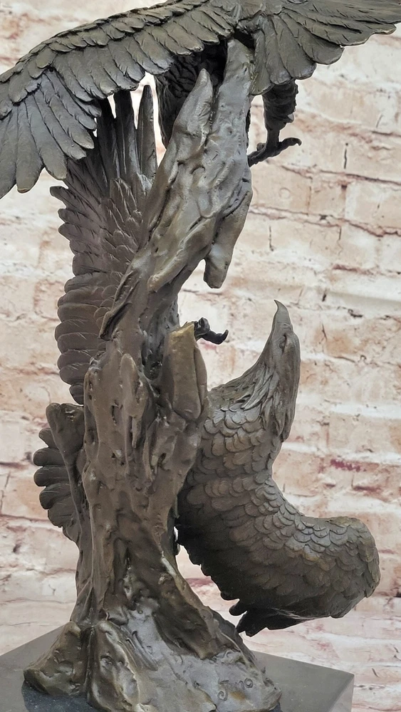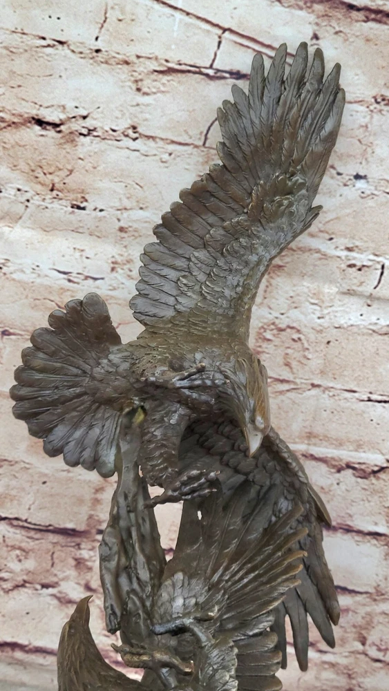 Condition : This sculpture is in perfect condition. Bronze Dimensions with Marble Base: Height 23" X Width 8" Marble Dimensions:6" X 6" Height without base:20" Weight:20 LBS Inventory:34AL32510243 Presenting an awe-inspiring bronze sculpture that captures the intense battle between two majestic eagles. This magnificent piece showcases an unparalleled level of detail, with each feather, beak, and talon meticulously crafted to perfection. The highly polished beaks and talons create a striking visual contrast against the rest of the sculpture, emphasizing the fierce nature of the encounter. Renowned for its captivating appeal, this wildlife sculpture has become a favorite among art enthusiasts. Its commanding presence and intricate craftsmanship make it a captivating centerpiece for any room or outdoor garden. Whether displayed indoors or outdoors, this sculpture adds a touch of grandeur and elegance to its surroundings. Crafted with utmost care and precision, this sculpture is handmade using the traditional lost-wax casting process, a technique renowned for producing exceptional bronze artworks. This ensures not only its aesthetic beauty but also its longevity and durability, making it an heirloom piece that can be cherished for generations to come. Resilient to the elements, this sculpture is designed to withstand the test of time with minimal maintenance required. To further authenticate its value, this remarkable piece is signed by the acclaimed artist Juno, adding prestige to its artistic merit. As a collector's item, this sculpture is a testament to the mastery and artistic vision of its creator. Immerse yourself in the captivating world of nature and art with this extraordinary bronze sculpture. Whether you are a seasoned art collector or an admirer of wildlife, this piece is sure to make a stunning addition to any art collection. Don't miss the opportunity to own this symbol of strength, beauty, and the eternal struggle of nature. Abstract Modern Art Two Fighting Eagles Birds Wildlife Bronze Sculpture Statue Video will open in a new window Using the eBay App? Paste link into a browser window: [isdntekvideo]