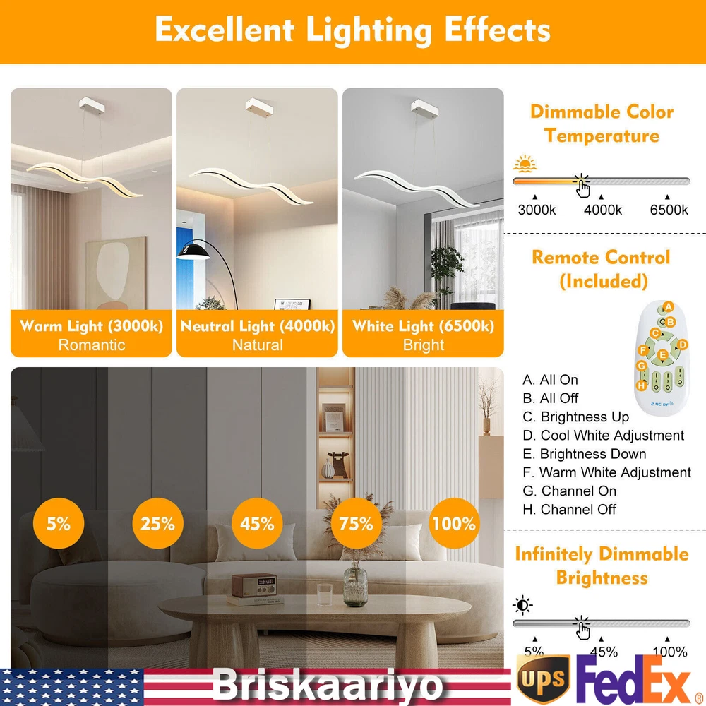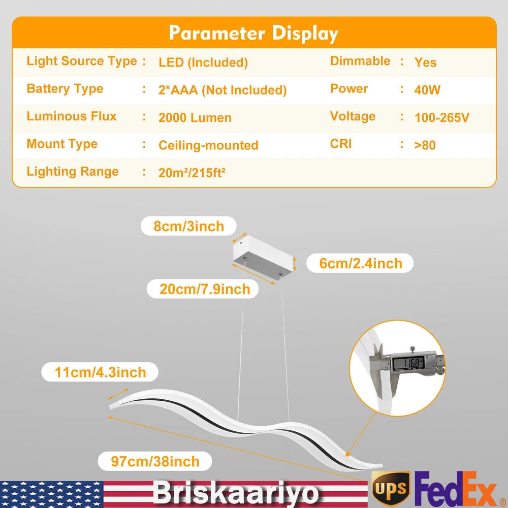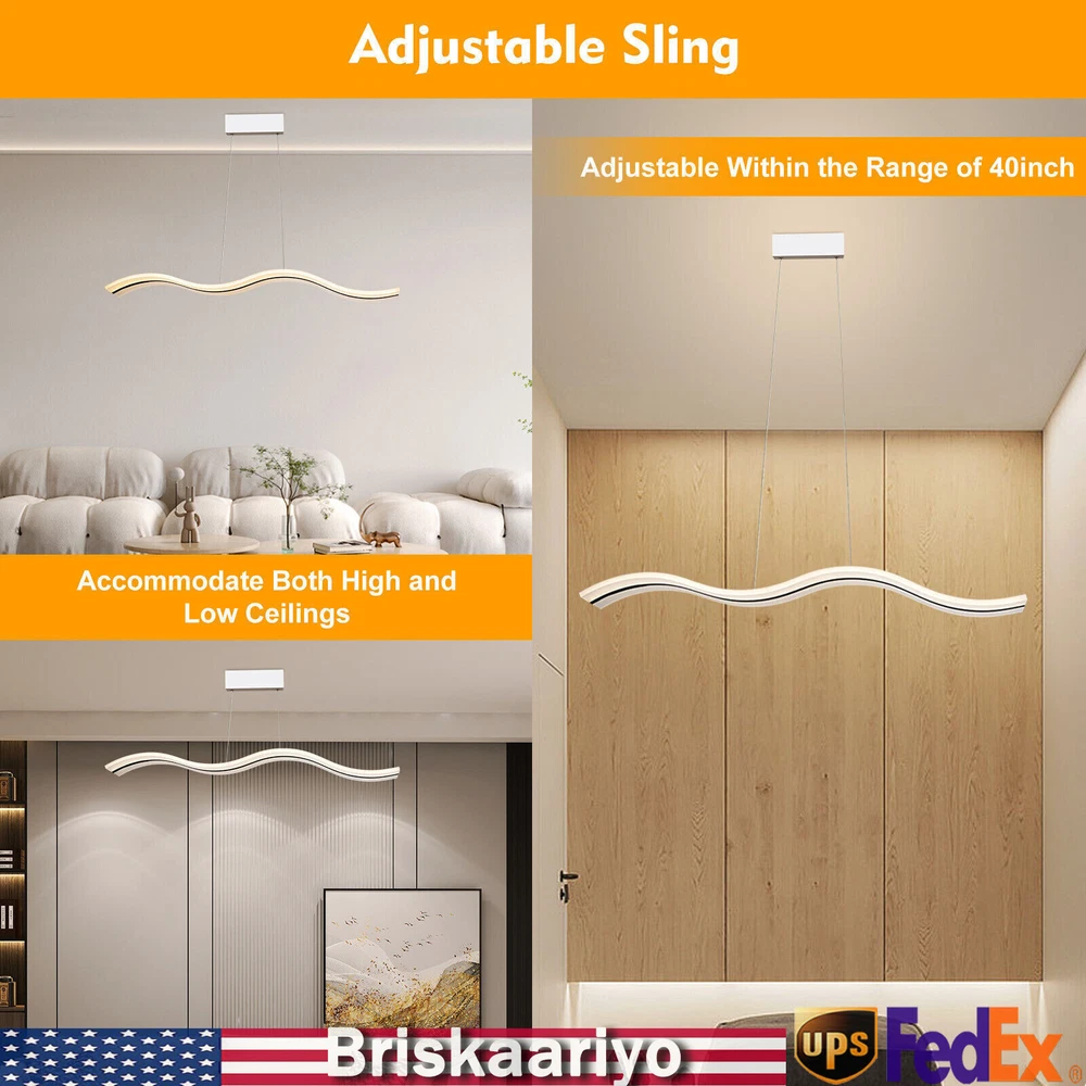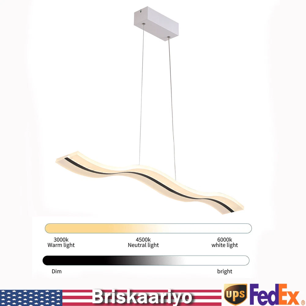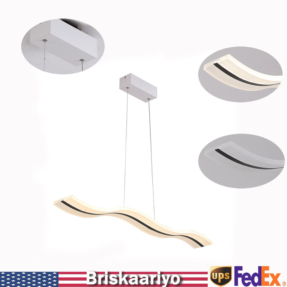 Specification Material: Acrylic Color: White Light Type: LED (Included) Light Color: Warm White, Neutral White, Cold White Color Temperature Adjustment Range: 3000-6500K Power: 36w Voltage: 110-240v, 50/60Hz Lighting Range: 6-10 ㎡/64.5-107.6ft2 Package Size: 102*23.75*12.35cm/40.2*9.3*4.9in Board Size: 20*8*6cm/7.87*2*1.6in Chain Length: 100cm/39.4in Light Size(L*W): 100*12cm/39.4*4.72in Gross Weight: 4kg/8.8lbs Net Weight: 3.5kg/7.7lbs Package Included 1*LED Pendant Light 1*Remote Control 1 Set* Screws 1*English Instruction Modern Acrylic Chandelier LED Ceiling Lamp Pendant Light Linear Wave Shape 38W Modern Acrylic Chandelier Wave Shape LED Ceiling Light Pendant Lamp Remote 36W Description Elegance is not only a temperament but also a life attitude. Let this LED pendant light bring you the charm of natural light and add fashionable and elegant texture to your home. It is a creative design with the shape of waves, adding a bit of fun to the environment. It adopts the reinforced wire suspension line to make sure safety. Its different light colors can make you feel different comfort, and it will be gorgeous no matter in the day or at night. Key Highlights Creative Design : The modern luxury wave design of the LED pendant light makes you feel like you are on the sparkling seaside, blooming the natural charm of light, and adding fashion to your home! Great Durability : It is made of advanced acrylic, which has good waterproof and dust-proof performance. At the same time, the steel wire suspension line of this lamp is specially reinforced, which makes it of high load-bearing capacity, meanwhile ensuring safety during use. Easy to Install : You don't need to buy additional tools to install it, just connect it directly to the reserved wire and start using it. Infinite Dimming : According to different scenes, you can use the remote control to adjust the color temperature (3000-6500K), and there are different modes for you to switch (warm white, neutral white, cold white). Infinite dimming can well control the brightness and protect your and your family's vision. Energy-saving and Environmental Protection : It has a built-in energy-saving chip, which has a good refraction effect, making the light more uniform and stable, so it is energy-saving and environmental protection. High Brightness: Compared with ordinary lampshade, acrylic lampshade has better light transmission. In addition, it uses high-quality LED lights, so high-brightness lights can be more evenly and softly lit. Easy to Clean : It uses acrylic lampshade, which has excellent hardness and scratch resistance, so you can use a soft cloth to wipe it, which is very convenient for cleaning and maintenance. Quality Service: We stand behind all our guests and look forward to assisting you with your purchase. It is our pleasure to answer your confusion and questions. So please feel free to contact us if you have any problems with the product. Details 39.4inch Light Length: The whole light is 39.4inch long, so it has a wider range of illumination than ordinary household lamps. Remote Control : This is a pendant light that can be remotely controlled, so you can switch and adjust the brightness without leaving the warm quilt. Application It is suitable for residential and commercial applications such as cafes, restaurants, bars, offices, living rooms, bedrooms, and kitchens to provide lighting and decorative functions with an illuminated area of about 64.5-107.6ft 2 . Specification Material: Acrylic Color: White Light Type: LED (Included) Light Color: Warm White, Neutral White, Cold White Color Temperature Adjustment Range: 3000-6500K Power: 36w Voltage: 110-240v, 50/60Hz Lighting Range: 6-10 ㎡/64.5-107.6ft 2 Package Size: 102*23.75*12.35cm/40.2*9.3*4.9in Board Size: 20*8*6cm/7.87*2*1.6in Chain Length: 100cm/39.4in Light Size(L*W): 100*12cm/39.4*4.72in Gross Weight: 4kg/8.8lbs Net Weight: 3.5kg/7.7lbs Package Included 1*LED Pendant Light 1*Remote Control 1 Set* Screws 1*English Instruction Notes Please read the user manual carefully before use and pay special attention to the safety precautions included. Please allow the slight color difference caused by the shooting light and 1-3cm error due to manual measurement, and make sure you do not mind before you place the order. Payment Delivery details Terms of sales About us Contact us Payment We accept ebay payment 。 Fees such as import duties, taxes are not included in the item price or shipping costs. These charges are the buyer's responsibility. Delivery details Shipping: 2-9 working days to: USA Terms of sales We maintain high standards of excellence and strive for hundred percent customer satisfaction. Feedback is very important to us. We hope that you contact us immediately before you give neutral or negative feedback, so that we can address your concerns. It is impossible to address issues if we do not know about them! About us Your satis faction is our ultimate goal. We work hard to earn your trust and future business. Our certified technicians have tested each item before shipping. The unit comes with 1 year limited warranty on all manufacturing defects. a) If you receive a defective item, you may return it or ask for a discount. Please contact us within 14 days after you receive the package. b) What you returned must be intact and in its original packaging as re? u. Customer is responsible for shipping costs of the returned item. c) We will cover the cost of shipping back t with the shipping rate indicated in the registration page. We will send you a new unit or refund the full payment you paid. Thank you. Contact us Business Hour Business Hour: Monday To Friday: 8:30 AM to 5:00 PM (Beijing China time) Due to time zones, our reply to your questions may not be immediately. But within above working time, we will reply your email within 24 hours. If it's non-workdays, please kindly be patient and wait till Monday. Please contact us with ebay message. Please feel free to contact us if y