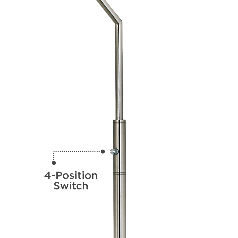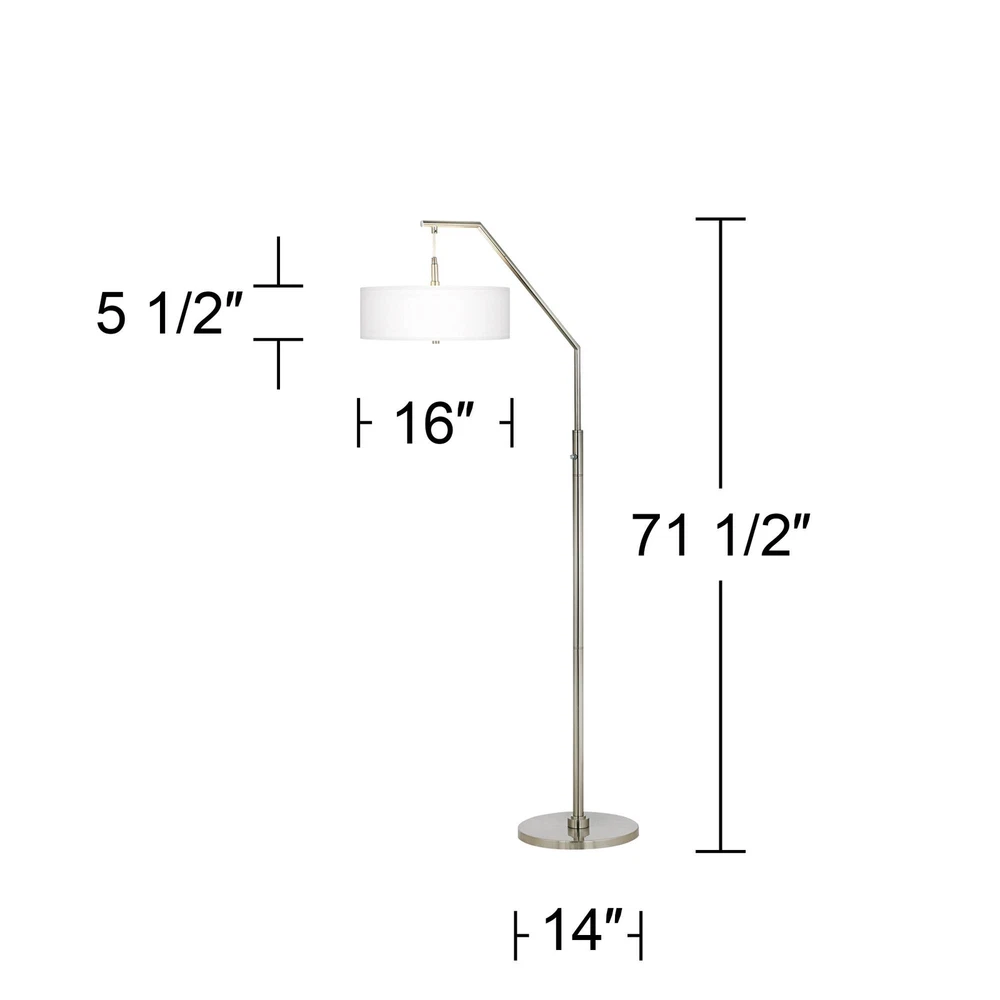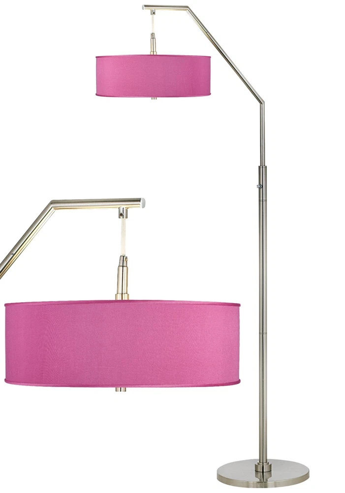 Shop Sale > Chandeliers Ceiling Lights Lamps Wall Lights Outdoor Lights Fountains Ceiling Fans Furniture Decor Possini Euro 71 1/2" Pink Orchid Faux Silk Shade Modern Arc Floor Lamp Style #81C98 PRODUCT DETAILS: 71 1/2" high overall. Shade is 16" wide x 5 1/2" high. Uses two maximum 100 watt standard-medium base bulbs (not included). 4-position stem column switch: right bulb on, left bulb on, both on, both off. Modern arc floor lamp from the Possini Euro Design brand of lighting. Hand assembled Pink Orchid textured faux silk shade, with an acrylic diffuser at the bottom. Shade fabric is constructed from polyester material. Brushed nickel finish. Metal construction. DESCRIPTION: This floor lamp's contemporary good looks are matched by its practical design. The custom-made Pink Orchid textured faux silk lamp shade is hand-assembled by artisans in California, and features a plastic diffuser at the bottom to prevent glare. The base features a sleek, brushed nickel finish. By Possini Euro Design®. From Possini Euro Design Collection A line of modern lighting for today’s home, featuring cutting-edge materials, LED technology, and European-inspired forms and profiles. *Free Shipping applies only to orders shipping to the 48 continental United States that qualify and meet the minimum purchase requirement; standard shipping only and select products excluded, including freight and oversized items. Free Returns valid on select items in United States only; does not apply to freight, clearance, Daily Sale, designs with giclee art shades, Color Plus and Tiffany Color Plus brand items, or certain items with designer shades.