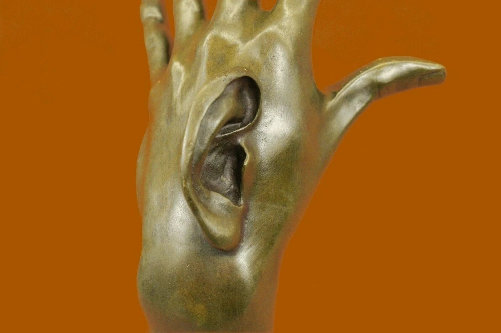 . . Condition : This sculpture is in perfect condition. Bronze Dimensions with Marble Base: Height 13" x Width 5" Marble Dimensions: 5" X 5" Height without base: 9" Weight: 9 LBS Inventory: 28DS3464282 This work of art is fantastic down to the last intricate detail. Every line is crafted to perfection, from the fingers to the fingernails and the subtle hand cuts. What makes this sculpture truly unique is the ear sticking out of the statue's hand, adding an intriguing and unconventional element to the piece. The figurine was cast using the ancient "Old Lost Method" and is stained with a brown patina finish to ensure its preservation. It is 100% handmade and 100% bronze, showcasing the artist's dedication to quality and traditional craftsmanship. Mounted atop a black marble base, this sculpture is a striking and one-of-a-kind addition to any art collection. Its meticulous detailing and unusual design make it a captivating and conversation-starting piece, reflecting both artistic skill and creative vision. Surreal Bronze Sculpture Hand w/ Ear Statue Modern Art Abstract Signed Original 13" x 5" DS-346 Video will open in a new window Using the eBay App? Paste link into a browser window: [isdntekvideo]
