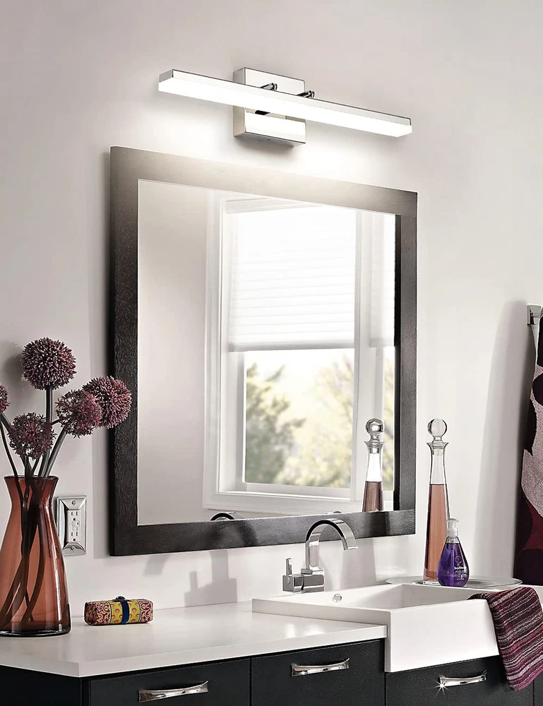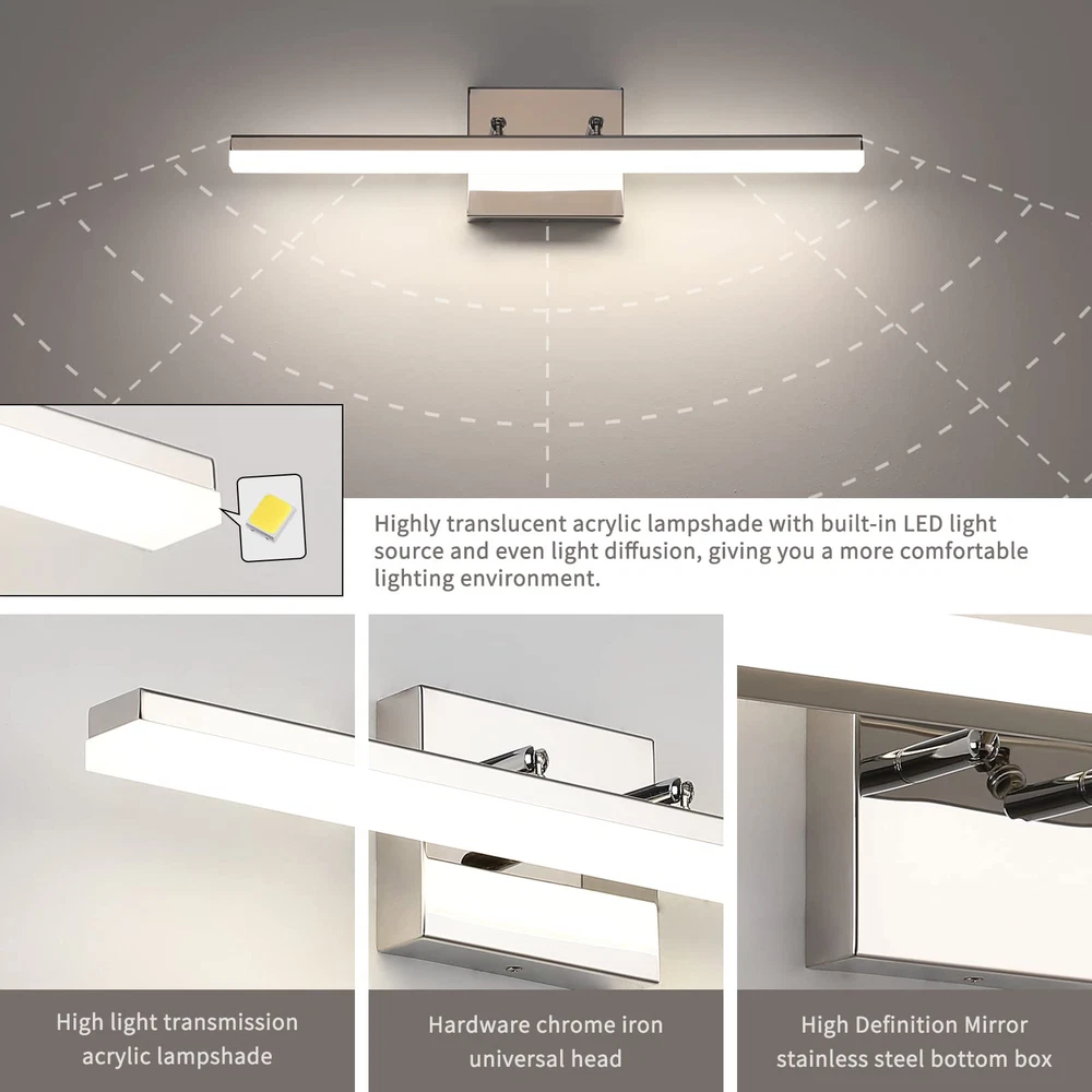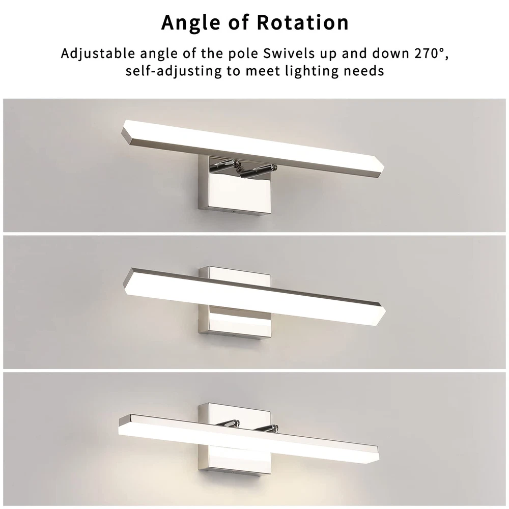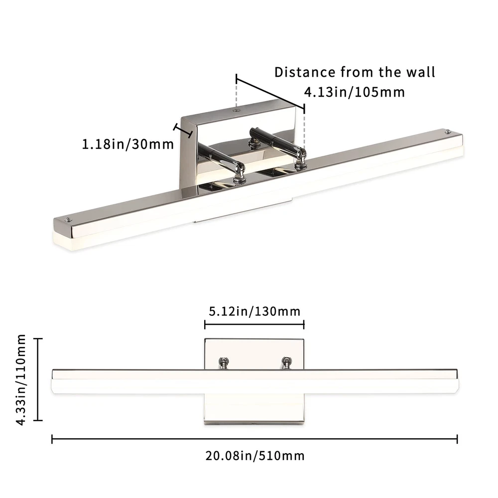 Dimmable Function: This modern chrome LED bathroom vanity light can support dimmable function.Use of ETL certificated LED driver, with most LED triac dimmer for smooth and flicker-free operation,can be adjusted between 5%-99%. Dimmable light source with free dimming range to meet various lighting needs.(Please note dimmer switch is not included) Rotatable Beam Angle Vanity Light Bar: This Chrome LED Bathroom light fixtures with special joint point which you can adjust the wall lights UP and DOWN 270° to your desired accent position. Meeting your sconces wall lighting requirements. Energy Saving: LED vanity lights for bathroom with feature of energy saving, 12W integrated led light source Eqval. to 100W traditional bulb, creates stable and efficient wall light,less power but more lumens, ensure this bathroom vanity light with less power consumption comparatively. Vanity Lighting Fixtures Specifications: This Modern LED Bathroom Vanity Light Chrome Finish Adjustable angle, long 20" inch, high 4.33" inch, distance from the wall(Depth): 4.13" inch, Neutral White 4000K,Composed of a high quality stainless steel base box, a durable iron rod and a frosted acrylic shade.Bring more brilliance to your bathroom with a simple yet luxurious design that shows off your taste. This bathroom light fixtures has 2 applications: is directly installation to the top of vanity horizontally as wall light fixtures or makeup miror lights; The other is installation mirrors side vetically as bright makeup lights for vanity mirror.