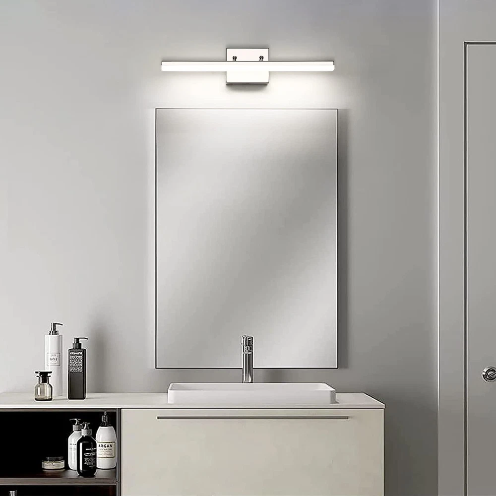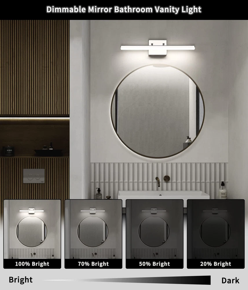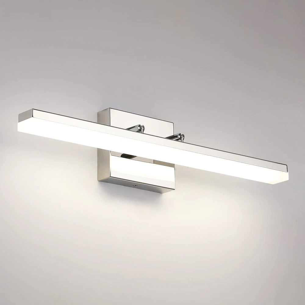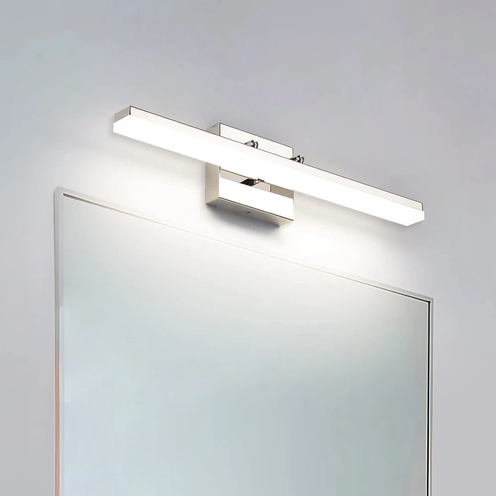 Dimmable Function: This modern chrome LED bathroom vanity light can support dimmable function.Use of ETL certificated LED driver, with most LED triac dimmer for smooth and flicker-free operation,can be adjusted between 5%-99%. Dimmable light source with free dimming range to meet various lighting needs.(Please note dimmer switch is not included) Rotatable Beam Angle Vanity Light Bar: This Chrome LED Bathroom light fixtures with special joint point which you can adjust the wall lights UP and DOWN 270° to your desired accent position. Meeting your sconces wall lighting requirements. Energy Saving: LED vanity lights for bathroom with feature of energy saving, 12W integrated led light source Eqval. to 100W traditional bulb, creates stable and efficient wall light,less power but more lumens, ensure this bathroom vanity light with less power consumption comparatively. Vanity Lighting Fixtures Specifications: This Modern LED Bathroom Vanity Light Chrome Finish Adjustable angle, long 20" inch, high 4.33" inch, distance from the wall(Depth): 4.13" inch, Neutral White 4000K,Composed of a high quality stainless steel base box, a durable iron rod and a frosted acrylic shade.Bring more brilliance to your bathroom with a simple yet luxurious design that shows off your taste. This bathroom light fixtures has 2 applications: is directly installation to the top of vanity horizontally as wall light fixtures or makeup miror lights; The other is installation mirrors side vetically as bright makeup lights for vanity mirror.
