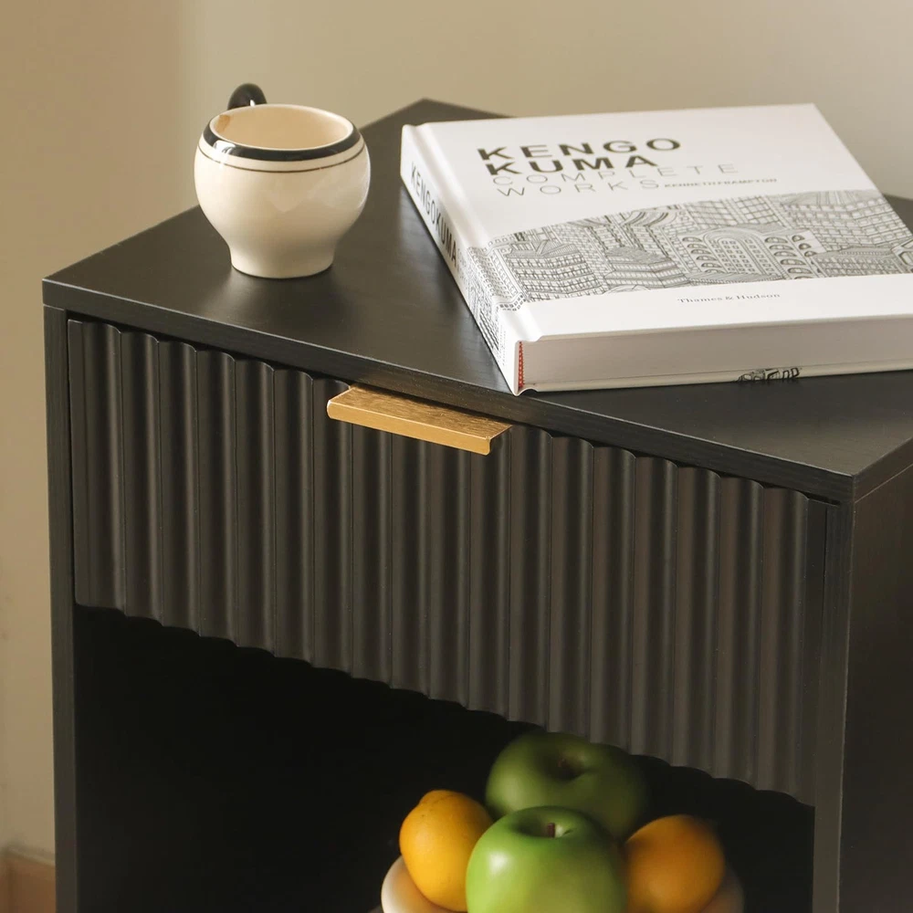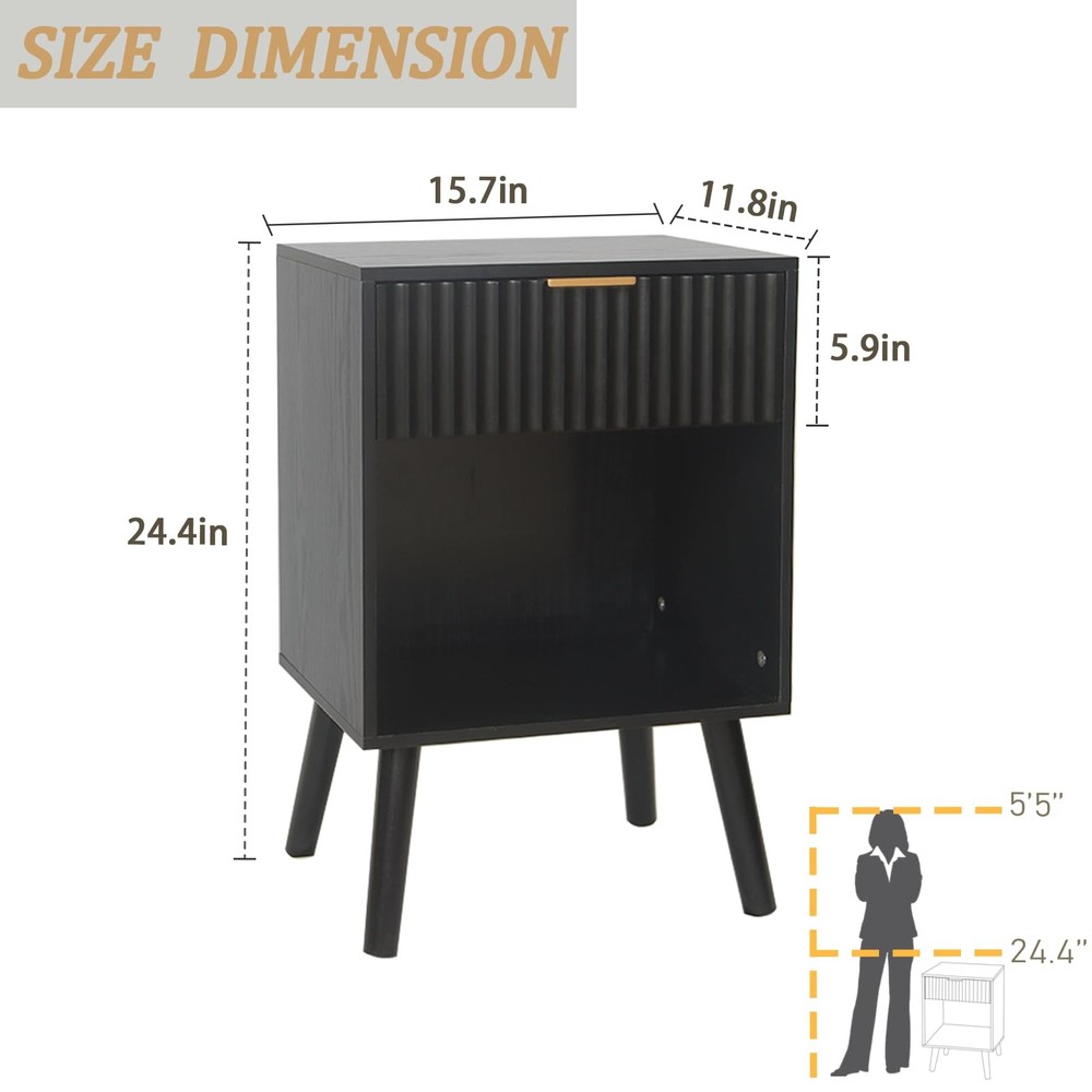 Side table with storage Spacious Storage Space: This nightstand is designed for the home organizer, with a drawer and a large opening storage space, providing roomy storage space for books, fruit, plants, and essential items. Also, the roomy modern nightstand tabletop is a nice choice for displaying photo frame, cup, lamp or alarm clock Superior Quality: This modern nightstand is made from high-density MDF boards and solid wood legs. The four legs of bedside table are designed to be slanted instead of vertical, which provides more area to prevent sliding and tilting, and ensures durability and stability for long-term use Chic Fluted Nightstand: The charming walnut grain, smooth surface, metal handle, and curved drawer create this mid century modern nightstand. The fluted drawer is corrugated, which makes this wood bedside table more unique and stylish, while the metal drawer handle matches natural legs, and exudes a vibe of elegance Multipurpose Nightstand: The demensions of the nightstand: 11.8''D×15.7''W×24.4''H. This bedside table with curved drawer provides a pefect size to match any variety of furniture. It is pefect as a coffee table, bedside table, end table, sofa side table living room and nightstand for bedroom Easy to Assemble: This nightstand comes with detailed instrution, clear marks and all the necessary parts, ensuring fast and effortless assembly. Quickly, you will get a stylish and practical nightstand at your home. If you have any issues, please don't hesitate to reach out to us – we're here to assist you every step of the way