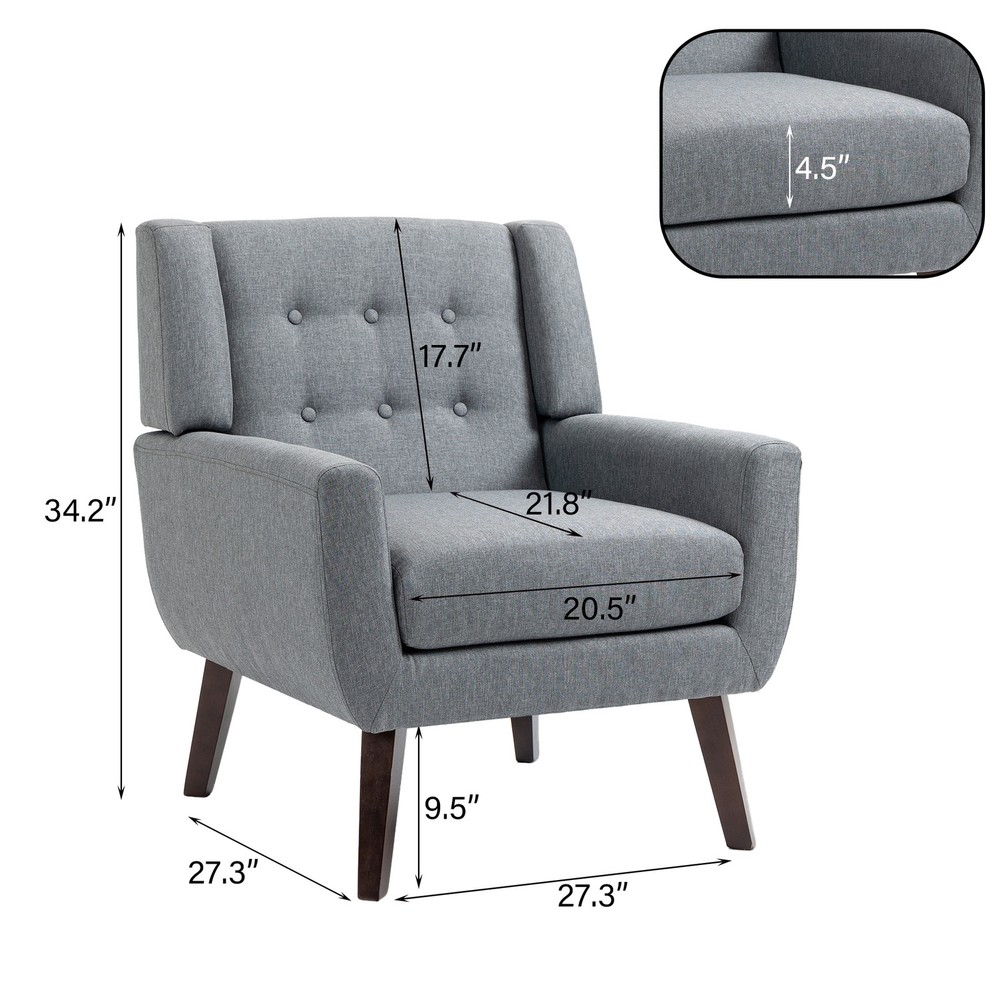 Enhance the comfort and style of your living space with our Modern Accent Chair upholstered in high-quality Cotton Linen fabric. This versatile armchair with solid wood frame and tufted back design is perfect for creating that cozy reading nook, providing extra seating in your living room, or adding a statement piece to any room in your home. With removable cushion covers and solid wood legs featuring a brown finish, these chairs are both functional and stylish.Features: Tufted back design Solid wood frame for durability and stability Cotton Linen upholstery for a comfortable seating experience Removable cushion covers for easy cleaning Solid wood legs with a brown finish add a touch of elegance Product weight: 38.6lbs Product dimensions: 27.3"D x 27.3"W x 34.2"H Weight Capacity: Free Shipping Over $49.99* Details Modern Accent Chair Cotton Linen Upholstered Chair for Living Room Product Description: Enhance the comfort and style of your living space with our Modern Accent Chair upholstered in high-quality Cotton Linen fabric. This versatile armchair with solid wood frame and tufted back design is perfect for creating that cozy reading nook, providing extra seating in your living room, or adding a statement piece to any room in your home. With removable cushion covers and solid wood legs featuring a brown finish, these chairs are both functional and stylish. Features: Tufted back design Solid wood frame for durability and stability Cotton Linen upholstery for a comfortable seating experience Removable cushion covers for easy cleaning Solid wood legs with a brown finish add a touch of elegance Product weight38.6lbs Product dimensions27.3"D x 27.3"W x 34.2"H Weight Capacity440 lb.