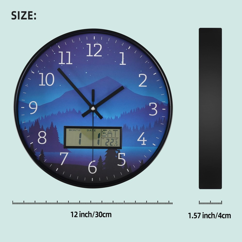 【Wall Clock Battery Powered】-Easy to use. It requires 1 AA battery and 1 "AAA" battery for the LCD display and one for the quartz movement. (Note: Batteries not provided. Do not use alkaline batteries.) Clock comes with hooks and a wide slot on the back for easy hanging 【Widely Used】: This wall clock is 12 inches in diameter, you can hang it anywhere. This wall clock is perfect for outdoor/indoor, living room, kitchen, bedroom, office, library, school decoration. 【Accurate Time & Non-Ticking】The silent wall clock use superior precise quartz movement, and keep the time accurate . It can keep you have a good sleep, study and work environment. It is a great choice in home, kitchen and office decor. 【LCD Display】: The modern wall clock decorative features with a large LCD screen, and displays date, month, day of week and temperature. only need a wall clock can use more functions. 【PERFECT GIFT IDEA 】- wall clocks are the perfect gift for family, partners, and friends. It is also an ideal gift for birthdays, anniversaries, Christmas, Mother's Day, Valentine's Day, Halloween, and Christmas. Modern clock can make your home look more beautiful and personalized.