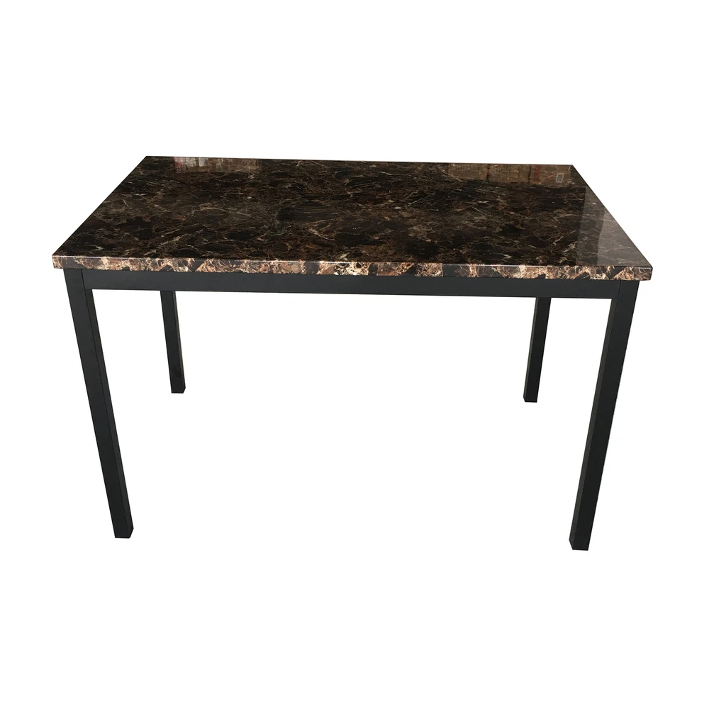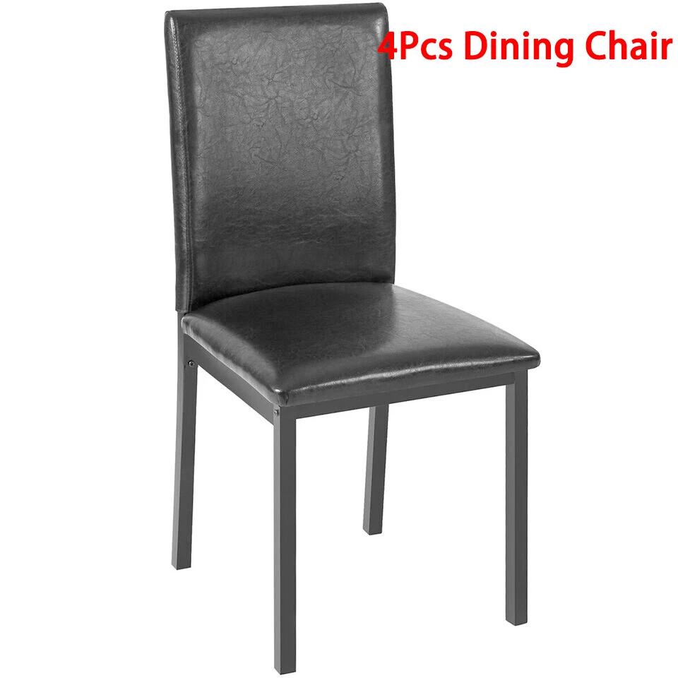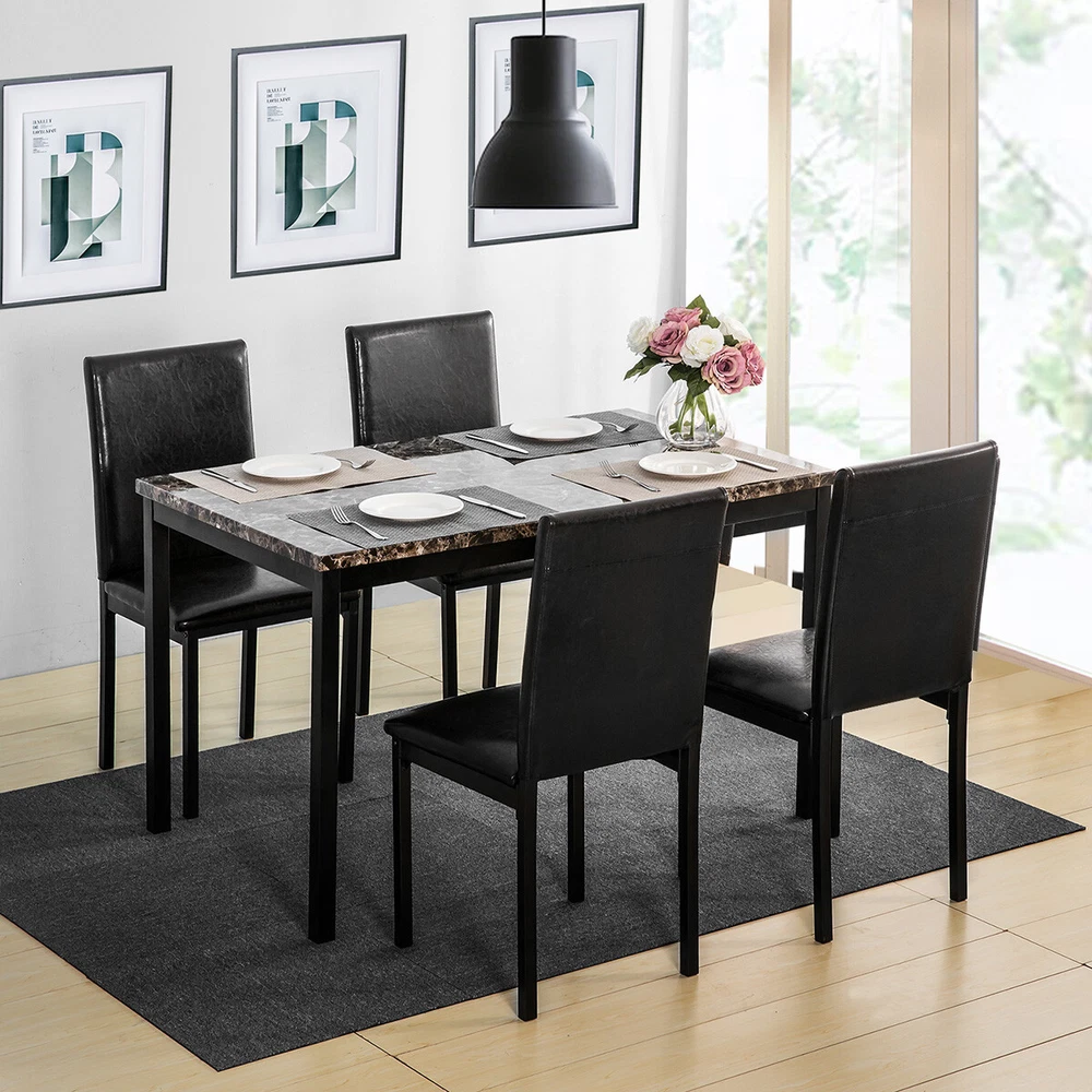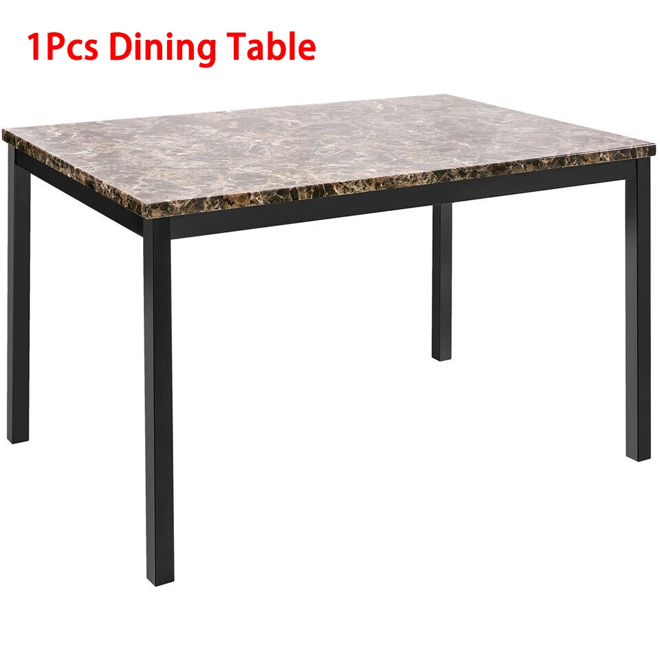 Modern Dining Set Kitchen Room Table Set, Dining Table , 4 Faux Leather Chairs Features: - Sturdy And Durable - Modern And Upscale Furniture - Great Decoration Furniture - Paper Faux Marble Table Top, Smooth And Beautiful with metal legs and apron -4-piece metal frame dining seats: Chairs are upholstered in dark brown bi-cast vinyl (faux leather) - Easy to Assemble, and Assembled in some Minutes. Specifications: TABLE Weight Limit: 100LBS CHAIRS Weight Limit:250LBS Package Includes: 1 x Modern paper Faux Marble End Table 4 x Metal frame dining seats 1 x Manual