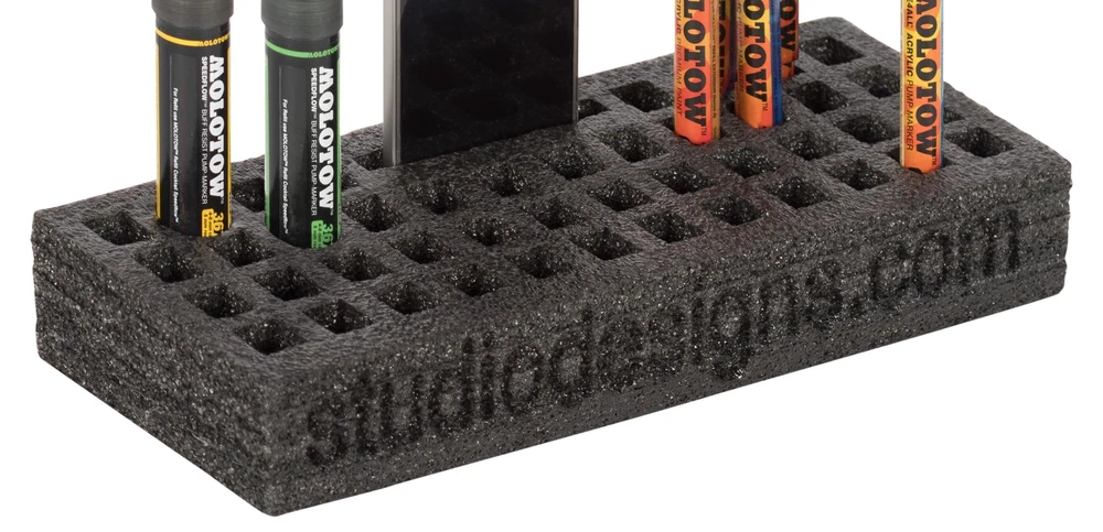 The flexible foam maker organizer by Studio Designs has 44 compartments to accommodate drawing supplies up to 15-mm in diameter. These trays are the latest innovation in art supply storage. They are lightweight, durable and will keep your pencils, brushes and markers neat and handy. We also offer flexible foam organizers in a 24 compartment (item # 12175) or 96 compartment (item 12174) configuration for pens, pencils and markers. Each organizer features a cell slot to keep your clean and close during your projects. Designed to fit into easily into the premier metal art tray (item # 12167, 12168, 12169), they can also stand alone to be used as an office or craft supply drawer organizer Overall dimensions: 11.75W x 4D x 2H 44 slots for pens, pencils, markers, and brushes: 15mm slot for mobile or other supplies: 3.5W Can also be used as a desktop organizer Sold as a 2-pack in a Hanging box