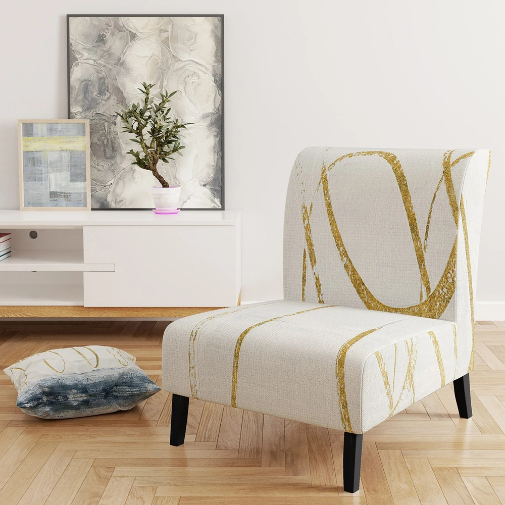 Use Designart's modern upholstered chair to bring a glamorous accent to your contemporary aesthetic. The sleek armless design makes this side chair ideal for smaller spaces, and the strong hardwood frame provides sturdy support. Rich shades of gold and grey stay vivid thanks to the use of high-density Italian inks in the printing process. Soft polyester fabric, a semi-firm foam-padded seat, and a high back combine in this 'Gold Abstract Geometric Shape' chair to create a comfortable place to unwind and relax at day's end.Features:1 Accent chair includedFoam Filled SeatingSide Chairs : 32.5in high x 22.5in deep x 27.5in wideSlipper Chair : 32in high x 21in deep x 25in wideArm Chair : 32in high x 23in deep x 23in wide Free Shipping Over $49.99* Details Designart "Gold Abstract Geometric Shape" Upholstered Modern Accent Chair - Arm Product Description: Use Designart's modern upholstered chair to bring a glamorous accent to your contemporary aesthetic. The sleek armless design makes this side chair ideal for smaller spaces, and the strong hardwood frame provides sturdy support. Rich shades of gold and grey stay vivid thanks to the use of high-density Italian inks in the printing process. Soft polyester fabric, a semi-firm foam-padded seat, and a high back combine in this 'Gold Abstract Geometric Shape' chair to create a comfortable place to unwind and relax at day's end. Features: 1 Accent chair included Foam Filled Seating Side Chairs 32.5in high x 22.5in deep x 27.5in wide Slipper Chair 32in high x 21in deep x 25in wide Arm Chair 32in high x 23in deep x 23in wide