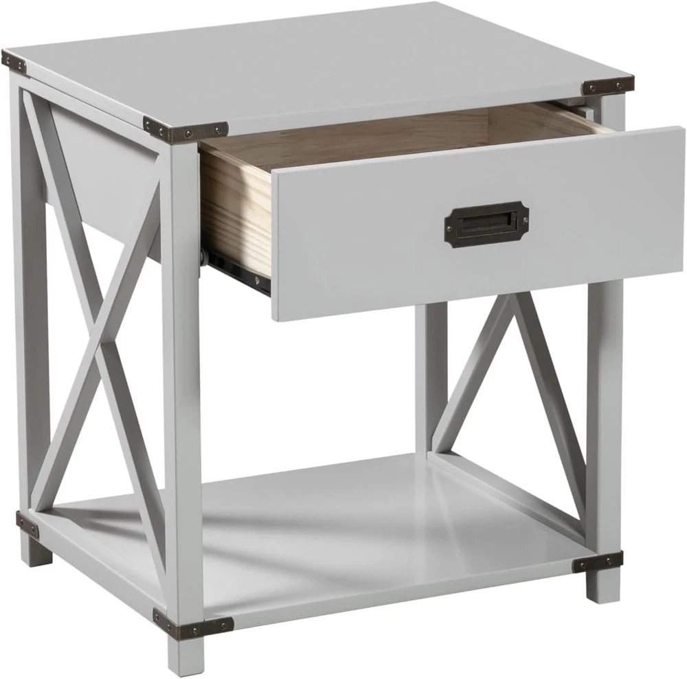 From The Tree offers a stylish and versatile addition to your living and family room. Made from engineered wood for durability, this contemporary end table pushes the boundaries of modern farmhouse decor with its gray finish. Perfect for any living room, this table offers plenty of storage space with two layers: a drawer perfect for accessories and bedside items and an additional floor shelf for storing books, TRIVs or decorative items. Keep all your favorite reads in one place! This well-crafted nightstand shelf will complement any space while remaining lightweight enough to easily move from room to room or even outside if needed. Using a contemporary design language with traditional wood construction techniques combined with modern materials, our end table incorporates unique details that enhance and add more value than a typical end table. Whether you're looking for a space-saving solution for tight spaces or an accent piece to spruce up a secondary living area, this side table has everything you need. The open feel of this tiered end table allows it to blend seamlessly into any home's decor. An interesting geometric design gives it personality without detracting from other pieces in the area – the perfect combination of function and form. With durable construction designed for years of daily use. Give your home the treatment it deserves and purchase our From The Tree contemporary gray end table today - you won't be disappointed!