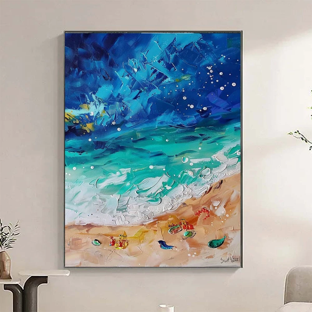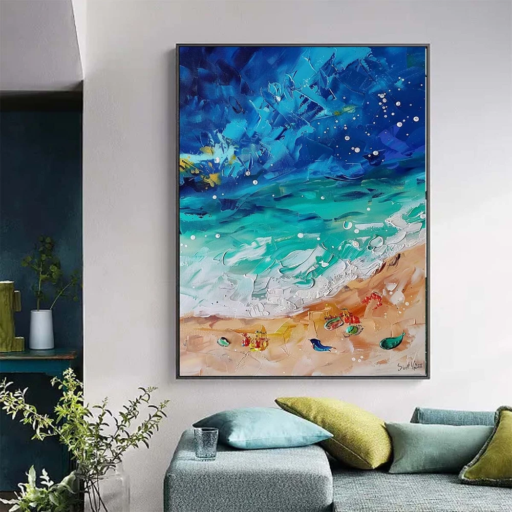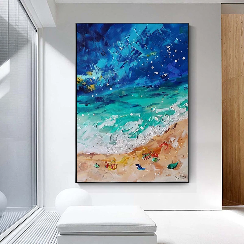Modern Handpainted abstract oil painting on canvas Blue beach Livline Room Decor