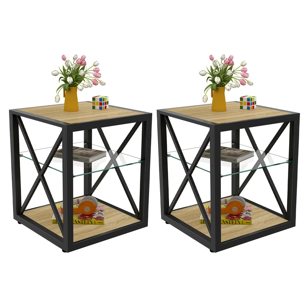 Set of 2 Modern End Table Nightstand Industrial Style Side Table for Bedroom Features 1. Stable Structure & Modern Aesthetics:Crafted from premium MDF and a sturdy metal frame, this piece features a tempered glass layer that is smooth, scratch-resistant, and effortless to clean. The innovative X-frame structure not only adds visual depth but also reinforces structural stability, delivering exceptional load-bearing capacity and long-lasting durability. 2. Space-Saving Compact DesignDimensions: 17.72"L × 17.72"W × 21.07"H.Load-bearing capacity: 110lbs. Its compact form adapts seamlessly to corners in living rooms, bedrooms, or home offices, maximizing space efficiency without sacrificing style or functionality. 3. Smart Tiered Storage System:With its practical 3-tier design, this organizer stores books, remotes, and stationery efficiently – keeping daily essentials at hand without compromising your tidy space. 4. Vintage Industrial Charm with Versatility:The fusion of Natural Wood MDF and industrial metal piping offers warmth and rugged elegance. It blends harmoniously while serving as a striking accent piece. 5. Hassle-Free Assembly:All hardwares and accessories are provided. It comes with easy-to-follow instructions.