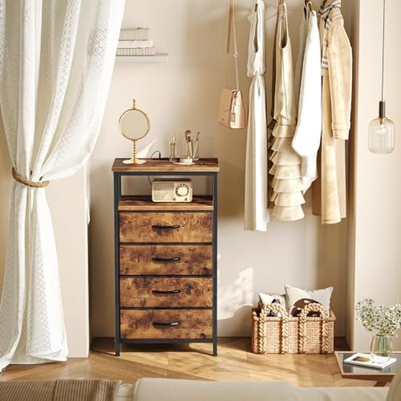 About this item 【Nightstand with Charger Station】More close charging spots, more handy uses. Equipped with 2 USB ports and 2 AC outlets on the tabletop, this fabric dresser allows you to effortlessly charge your devices or lamps overnight, ensuring you wake up worry-free with no low battery concerns. Plus: Contain patent pending drawer slide 【4 Drawer Night Stand】Size: 10. 2''D x 14''W x 5. 6''H. With 4 roomy fabric drawers, this chest of drawers offers plenty of space to stow away your books, clothing, toys, and more. Collapsible, breathable and sturdy, these fabric drawers ensure your belongings are well-preserved and easy accsess. You'll find extra space on the open shelf and tabletop for added storage 【Versatile Placement】This tall dresser utilizes vertical storage. Whether place it in your walk-in closet for growing clothes, set 2 in the entryway as a console cabinet, or in the living room, or bedroom for storage, this end storage table keeps your space clutter-free with style. This kid dresser is also a great addition to a child's room for organizing toys and essentials 【Sturdy and Safe】Crafted with particle board and a robust metal frame, this bedroom dresser with drawers ensures durability and longevity. Secure it to the wall with anti-tip device to prevent items from falling or protect kids when in use. Also, the adjustable feet ensure more stability on the floor and protect against floor scratches 【Quick and Easy Setup】With numbered components, included tools, and clear instructions, this closet storage organizer can be ready in no time, no need to waste your time on tedious assembly. This sleek nightstand with smooth lines and drawer will easily add state in your home space › product details Brand:Huuger Product Dimensions:11. 8"D x 15. 7"W x 33. 9"H Color:Rustic Brown Product Care Instructions:Wipe with Damp Cloth Shape:Rectangular Frame Material:Metal Top Material Type:Engineered Wood You may also like Airtight Stackable Pet Food Storage Container Heavy Duty Dry Dog Food Lockable 35.05 USD 36.89 USD Free shipping 5% off Freeze Dried Emergency Food Raspberries Camping Meals All Natural 10 Can 8 oz US 44.64 USD 46.99 USD Free shipping 5% off Pistol Grip Handgun Sprayer Wand Adjustable Nozzle ATV Spot Trailer 300 psi New 27.78 USD 29.24 USD Free shipping 5% off Crystal Cat Litter Tray Refills 3 Pack Odor Control Leak Protection Durable Home 86.3 USD 90.84 USD Free shipping 5% off Turf Saver Lawn Garden Tire 18X9.50 8 Load Range A Traction All Season Black New 85.95 USD 90.47 USD Free shipping 5% off Dogg Catcher 2 Electronic Predator Call Remote Coyote Fox Sounds 3851,Multi New 74.63 USD 78.56 USD Free shipping 5% off 30 Cans 24 L Electric Cooler Thermoelectric Car Cooler Portable Car Travel Grey 95.53 USD 100.56 USD Free shipping 5% off Mobile Tool Storage Stack System Tool Box W/ Dividers Organizer Durable Plastic 32.78 USD 34.51 USD Free shipping 5% off Polyethylene Shrink Wrap 7mil 14ft X 50ft Boat Film Heat Gun Use Storage Durable 180.21 USD 189.69 USD Free shipping 5% off Locking 4-Bike Hitch Rack 2 Inch Receiver Quick Install Secure Carrier 140lbs US 291.55 USD 306.9 USD Free shipping 5% off Kettle Cooked Potato Chips Variety Pack 40 Single Serve Bags Snacks On-the-Go US 27.61 USD 29.06 USD Free shipping 5% off 8Ft Extendable Tailgate Table Foldable Camping Outdoor Canopy Not Included White 82.46 USD 86.8 USD Free shipping 5% off