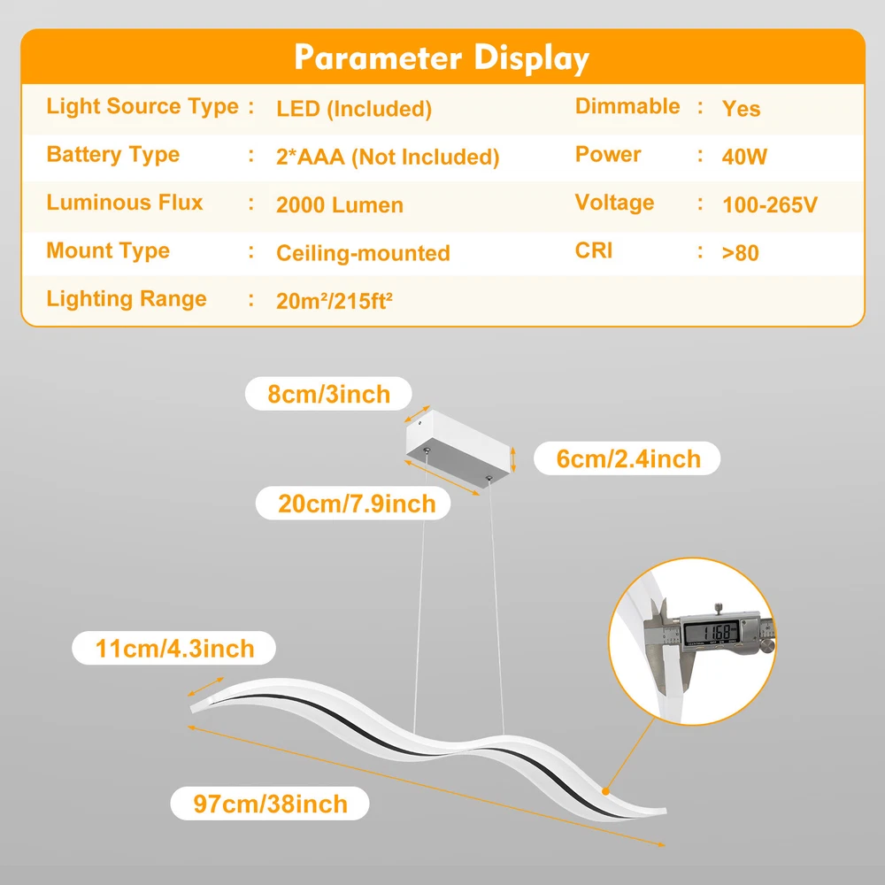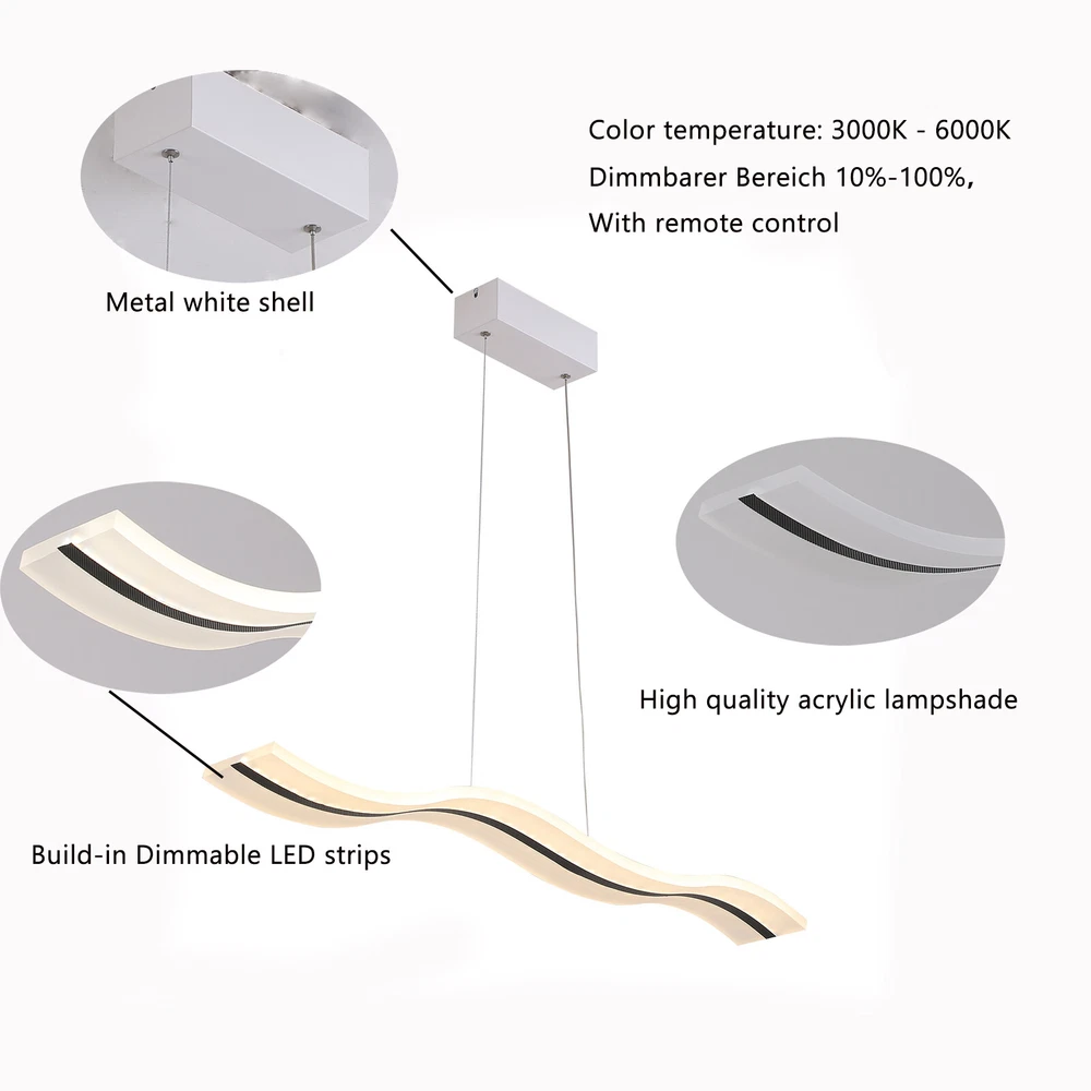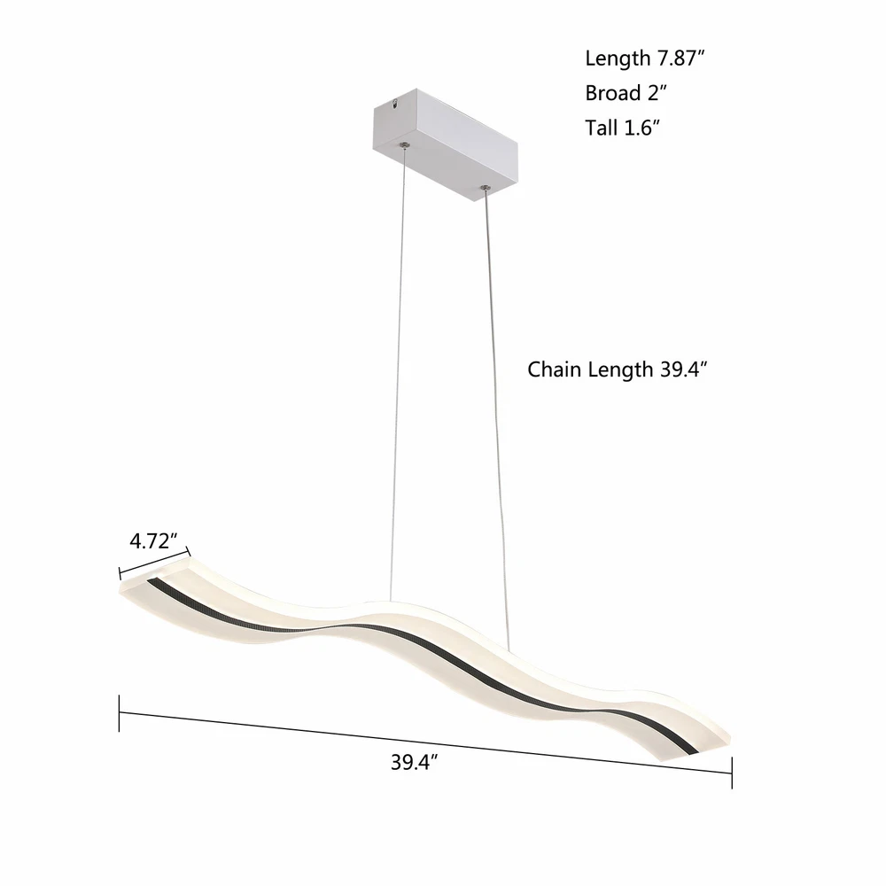 Modern Acrylic LED Chandelier Linear Belt Wavy Drop Pendant Lamp Light Fixtures Specification: Material: Advanced Aluminum Casting and Acrylic Length: 1000mm(39.37 inch) Width: 120mm(4.72 inch) Wire lenght: 1200mm(47.24 inch/ adjustable) Dimmable: (come with remote control) Light source: LED Wattage: 38W Suitable Voltage: 100V-240V Base size: 26cm*5cm*4cm Installation Type: Pendant light Shape: Wave Area: 8-10㎡ Pattern: Stepless Dimming-With remote control (3000K-6500K) Size:100X12cm/39.37"X4.72"(appr.) Description 1. Application : Perfectly suitable for Dining Room, Bedroom, Living Room , Kids Room, Hallway, Hotel,Restaurant,and Company Reception and so on .It is bright,safe and dimmable .High standard High-end ,luxury, it will make your room more elegant. 2. Superior Design : Mod Modern Pendant Lamp LED Linear Wave Acrylic Chandelier Ceiling Light Dimmable Modern Acrylic LED Chandelier Linear Belt Wavy Drop Pendant Lamp Light Fixtures Specification: Material: Advanced Aluminum Casting and Acrylic Length: 1000mm(39.37 inch) Width: 120mm(4.72 inch) Wire lenght: 1200mm(47.24 inch/ adjustable) Dimmable: (come with remote control) Light source: LED Wattage: 38W Suitable Voltage: 100V-240V Base size: 26cm*5cm*4cm Installation Type: Pendant light Shape: Wave Area: 8-10㎡ Pattern: Stepless Dimming-With remote control (3000K-6500K) Size:100X12cm/39.37"X4.72"(appr.) Description 1. Application : Perfectly suitable for Dining Room, Bedroom, Living Room , Kids Room, Hallway, Hotel,Restaurant,and Company Reception and so on .It is bright,safe and dimmable .High standard High-end ,luxury, it will make your room more elegant. 2. Superior Design : Modern luxurious Wave design ,Like the ocean waves, brings more brilliance to your life,highlights your taste.It is dimmable and has remote control .You can dim the pendant light freely , 3000K-6500K, Warm White , Neutral White , Cool White , you can choose the light temperature whatever you want , Easy to enhance the atmosphere of the room. 3. High Quality Material: Made of Advanced Aluminum Casting and Acrylic . Robust, Secure, Good vibration resistance and Perfect Finishing Color.The sling is made of sturdy steel wire, which is firm, weighed, good vibration resistance and won't break.Acrylic is light transmissive and does not change color. 4. Easy to installation: Suitable for US junction box standard.Just connect to the reserved wire directly and fully compatible to 100v-240v. No switch or cord on the light. 5. Energy Saving And Ultra Bright Chips : More durable and refraction effect is good. 36W Dimmable Payment Delivery details Terms of sales About us Contact us Payment We accept ebay payment 。 Fees such as import duties, taxes are not included in the item price or shipping costs. These charges are the buyer's responsibility. Delivery details Shipping: 2-9 working days to: USA Terms of sales We maintain high standards of excellence and strive for hundred percent customer satisfaction. Feedback is very important to us. We hope that you contact us immediately before you give neutral or negative feedback, so that we can address your concerns. It is impossible to address issues if we do not know about them! About us Your satis faction is our ultimate goal. We work hard to earn your trust and future business. Our certified technicians have tested each item before shipping. The unit comes with 1 year limited warranty on all manufacturing defects. a) If you receive a defective item, you may return it or ask for a discount. Please contact us within 14 days after you receive the package. b) What you returned must be intact and in its original packaging as re? u. Customer is responsible for shipping costs of the returned item. c) We will cover the cost of shipping back t with the shipping rate indicated in the registration page. We will send you a new unit or refund the full payment you paid. Thank you. Contact us Business Hour Business Hour: Monday To Friday: 8:30 AM to 5:00 PM (Beijing China time) Due to time zones, our reply to your questions may not be immediately. But within above working time, we will reply your email within 24 hours. If it's non-workdays, please kindly be patient and wait till Monday. Please contact us with ebay message. Please feel free to contact us if you have any questions. Monday To Friday: 8:30 AM to 5:00 PM (Beijing China time) Due to time zones, our reply to your questions may not be immediately. But within above working time, we will reply your email within 24 hours. If it's non-workdays, please kindly be patient and wait till Monday. Please contact us with ebay message. Please feel free to contact us if you have any questions. On Nov 12, 2024 at 03:18:15 PST, seller added the following information: