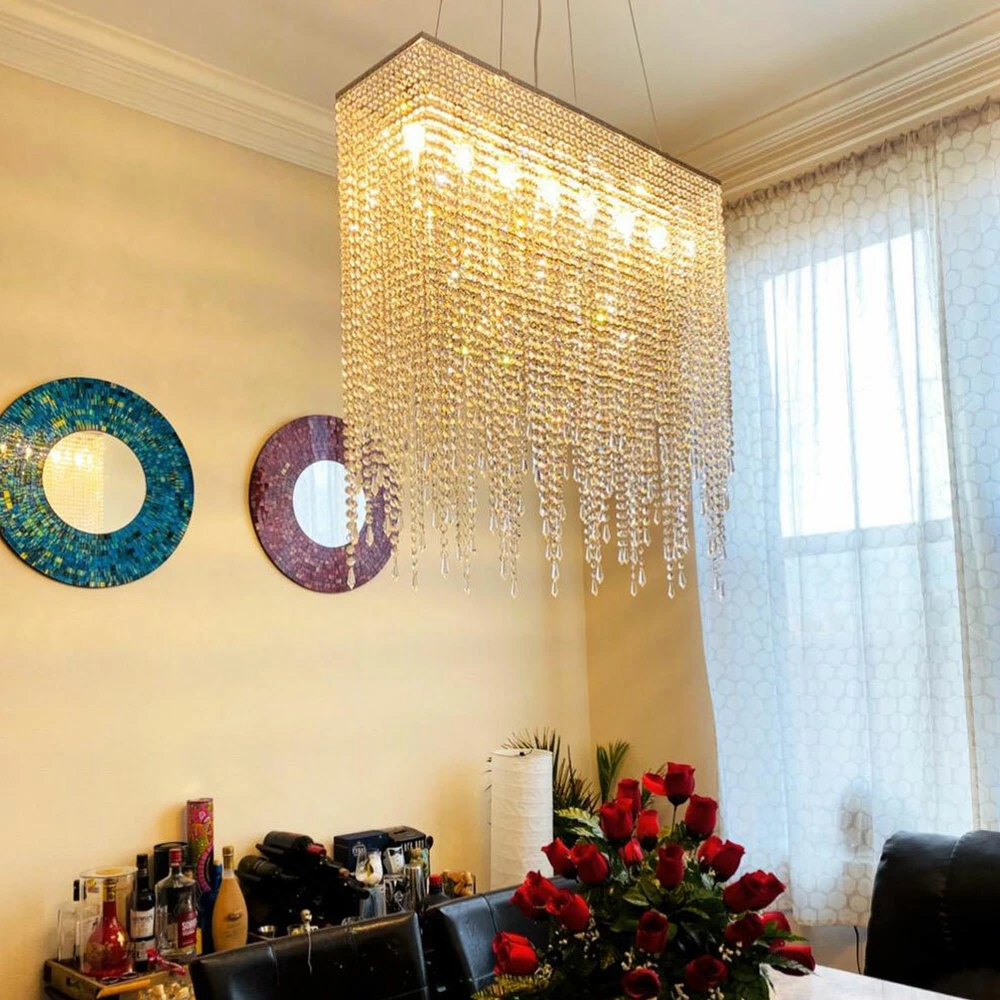 Description: Rain drop collection, sparkles from every angle. Full Assembly Required with time and effort. Feature: Material: Polished chrome stainless steel canopy and frame, top K9 clear crystal Dimension: Length 32" (80cm), Width 8" (20cm), Height 16" (40cm). Pendant wire: adjustable 59"(150cm) Light Source:E12 x 7 Bulbs Required (Max 40W each, NOT included). Works with incandescent, LED, CFL, halogen or color changing bulbs up to 40W. Fully dimmable when used with dimmable bulbs and a compatible dimmer switch (not included). Application: Ideal for living room, dining room, kitchen island, bedroom, foyer, indoor, farmhouse, sloped ceiling, bar, restaurants, galleries, exhibition room, hotel, coffee shop, office. Modern Rectangular Raindrop Crystal Chandelier Light Ceiling Light Pendant Lamp Description: Rain drop collection, sparkles from every angle. Full Assembly Required with time and effort. Feature: Material : Polished chrome stainless steel canopy and frame, top K9 clear crystal Dimension : Length 32" (80cm), Width 8" (20cm), Height 16" (40cm). Pendant wire: adjustable 59"(150cm) Light Source : E12 x 7 Bulbs Required (Max 40W each, NOT included) . Works with incandescent, LED, CFL, halogen or color changing bulbs up to 40W. Fully dimmable when used with dimmable bulbs and a compatible dimmer switch ( not included) . Application: Ideal for living room, dining room, kitchen island, bedroom, foyer, indoor, farmhouse, sloped ceiling, bar, restaurants, galleries, exhibition room, hotel, coffee shop, office. Payment Delivery details Terms of sales About us Contact us Payment We accept ebay payment 。 Fees such as import duties, taxes are not included in the item price or shipping costs. These charges are the buyer's responsibility. Delivery details Shipping: 2-9 working days to: USA Terms of sales We maintain high standards of excellence and strive for hundred percent customer satisfaction. Feedback is very important to us. We hope that you contact us immediately before you give neutral or negative feedback, so that we can address your concerns. It is impossible to address issues if we do not know about them! About us Your satis faction is our ultimate goal. We work hard to earn your trust and future business. Our certified technicians have tested each item before shipping. The unit comes with 1 year limited warranty on all manufacturing defects. a) If you receive a defective item, you may return it or ask for a discount. Please contact us within 14 days after you receive the package. b) What you returned must be intact and in its original packaging as re? u. Customer is responsible for shipping costs of the returned item. c) We will cover the cost of shipping back t with the shipping rate indicated in the registration page. We will send you a new unit or refund the full payment you paid. Thank you. Contact us Business Hour Business Hour: Monday To Friday: 8:30 AM to 5:00 PM (Beijing China time) Due to time zones, our reply to your questions may not be immediately. But within above working time, we will reply your email within 24 hours. If it's non-workdays, please kindly be patient and wait till Monday. Please contact us with ebay message. Please feel free to contact us if you have any questions. Monday To Friday: 8:30 AM to 5:00 PM (Beijing China time) Due to time zones, our reply to your questions may not be immediately. But within above working time, we will reply your email within 24 hours. If it's non-workdays, please kindly be patient and wait till Monday. Please contact us with ebay message. Please feel free to contact us if you have any questions. Features Durable Category Lighting Number of Bulbs 7 E12 Bulbs ( Not Included) Material Aluminum, K9 Crystal Item Length 80cm/31.5inch Pendant Wire Adjustable 150cm/59inch Voltage 110-120V Item Height 35cm/13.77inch Style Crystal, Modern Item Width 20cm/7.87inch Recommended Room Size 15-20㎡/161-215sq. ft Ceiling Chassis Size 17.5*8.89cm/6.89*3.5inch * Feature * Creative Design,Durable Material,Beautiful Appearance Note: Do not send to Brazil Bundle Description: No Feature 1 *Stable characteristic*, *high reliability* shipping notice Can not ship to Puerto Rico,Alaska/Hawaii Item location: CA /NJ /Austell Transportation does not include: canarias Power Source Hardwired MPN Does Not Apply Shade Shape Rain Drop Power Consumption Max 40W each, NOT included Room Bedroom, Dining Room, Home Office/Study, Living Room, Porch Lighting Technology LED Installation Area Indoor Manufacturer Warranty 2 years Department Adults Light Color Warm White Finish Polished Brand Unbranded Color Clear Item Diameter 16 in Type Chandelier