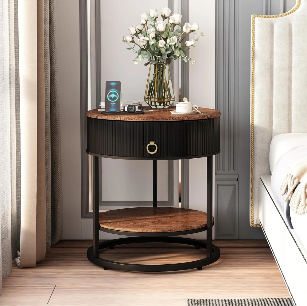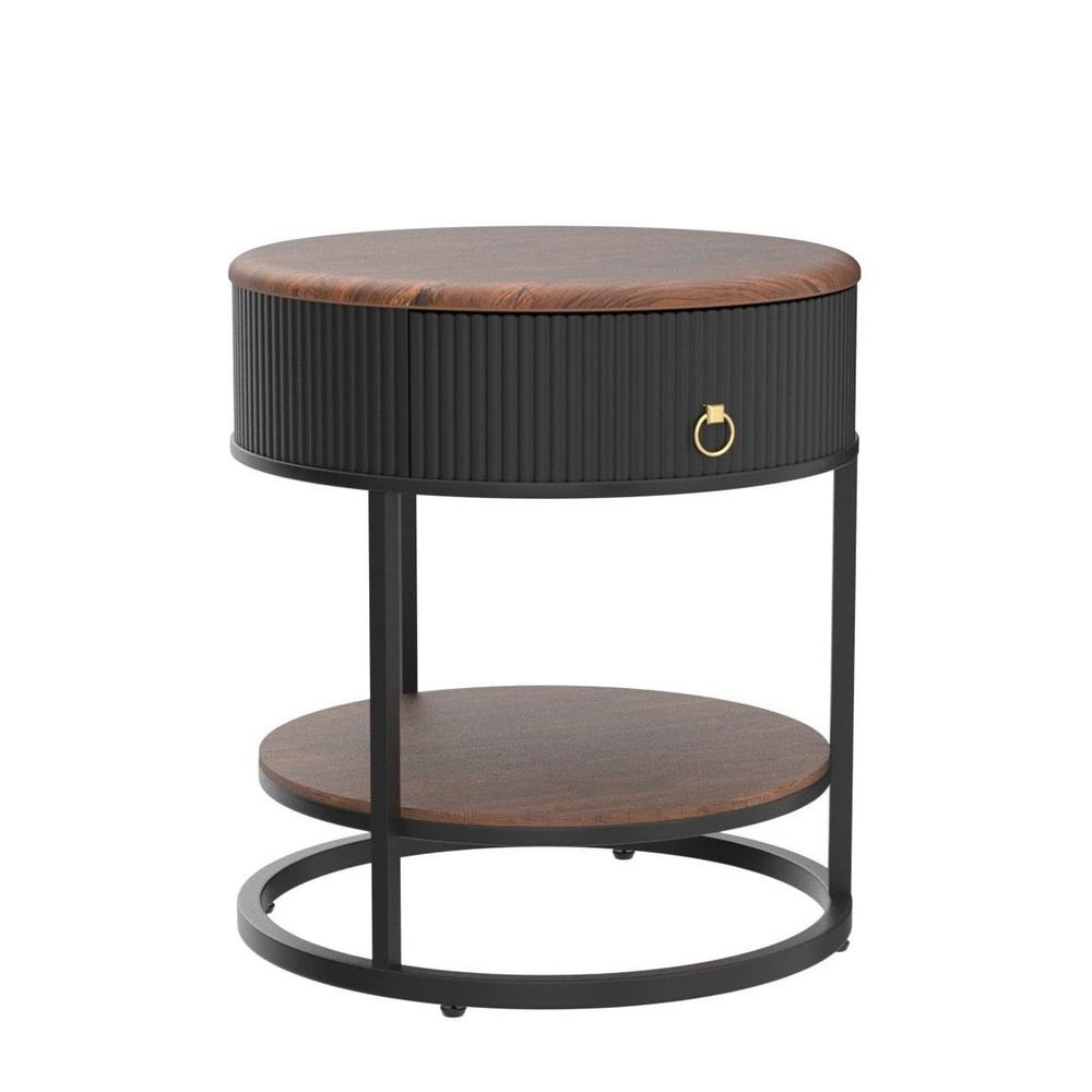 Ideal for tight spaces, this black nightstand can display lamps, phones, books and more, while the drawer and open shelf provide additional storage space that blends seamlessly with your existing decoration. And, the modern round nightstand has metal legs and adjustable feet for added stability and solidity. Sophisticated Side Table:With the table top and shelf made of PVC, this nightstand is the perfect addition to your home. The curved bottom provides durability and stability, and the patterned accent on the side of the drawer adds a sense of class and elegance to this side table Ample Storage:Measures 19.69 "L x 19.69 "W x 21.85 "H. The round bedside table has a spacious table top, a drawer and an open storage shelf, plenty of space for storage.The table top and bottom shelf can easily hold cups, lamps, books, decorations and more, and the drawer can hold small items, which meet all your storage needs High Quality Material:This nightstand tabletop is made of good quality PVC, which is durable and wear-resistant, the MDF material of the draw side is both beautiful and easy to clean, and the drawer's ring knob is made of aluminum alloy. The black metal legs are strong and thick enough to support the side table Simple and Elegant Design:The modern round end table with drawer has a simple design, classic color, brown wood grain pattern, compatible with different room styles and decorations, suitable for indoors, you can put it in your bedroom, living room, guest room, office, any other place you want Easy to Assemble and Clean:This brown side table has detailed instructions and necessary accessories to assemble it, which will allow you to assemble it quickly and efficiently. The closed drawers keep your stuff neat and organized. In addition, you can easily clean the surface of the nightstand with a damp cloth to keep it shiny