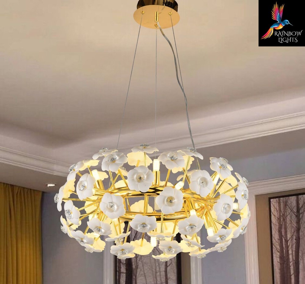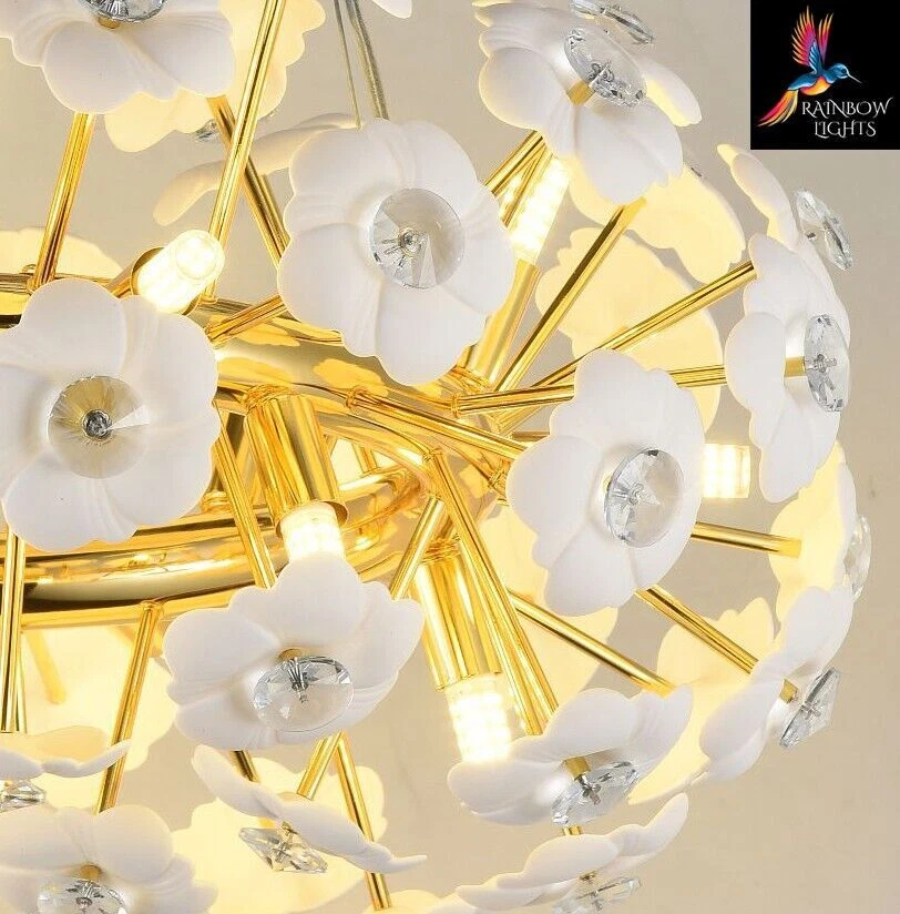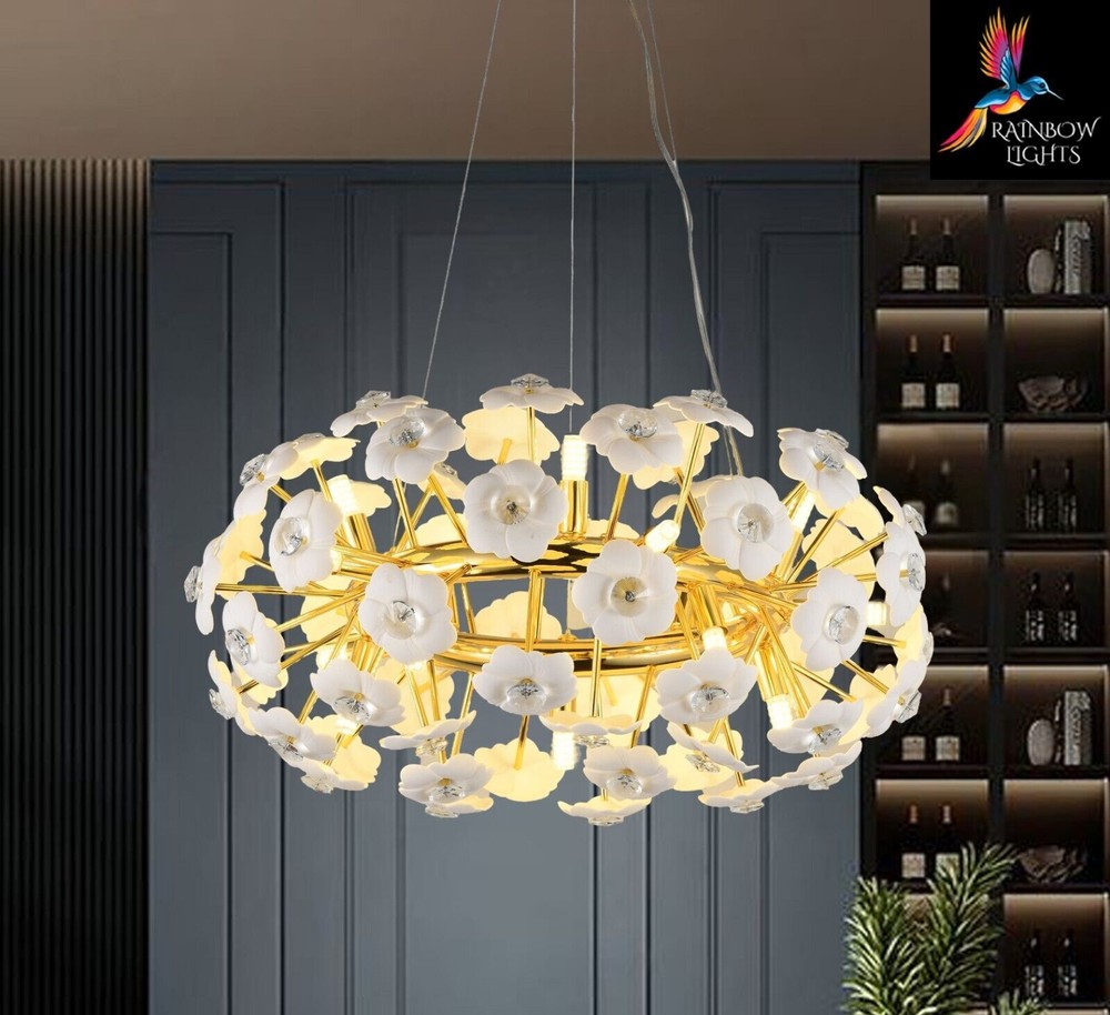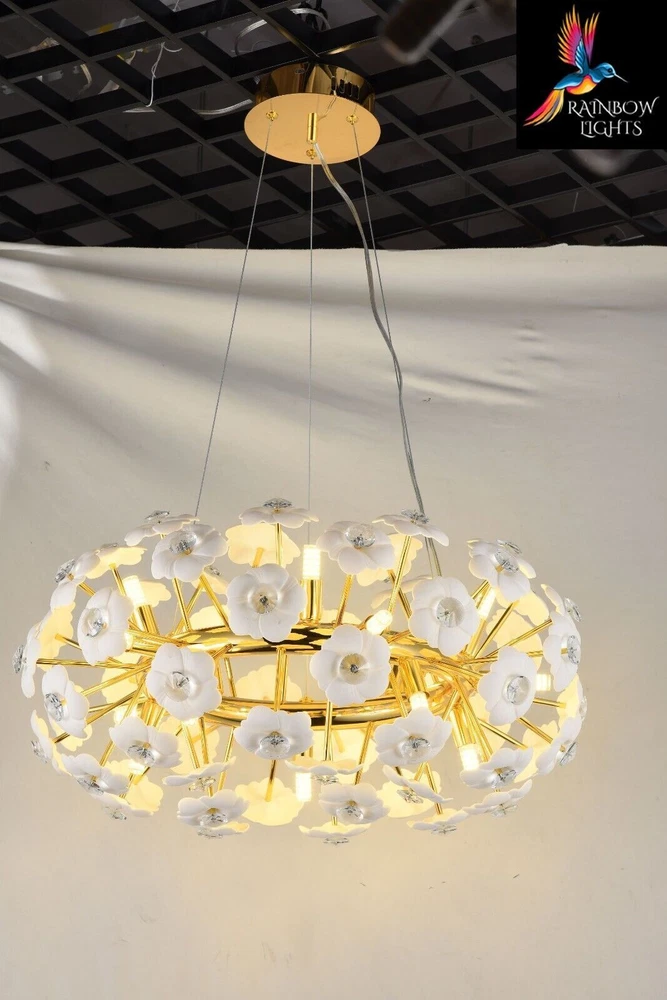 Introducing the latest addition: the Starburst Round Shaped Ceramic Flowers Sputnik Style Chandelier. Enhance your home with these exquisite luxury lighting fixtures from Rainbow Lights. Product Details: Condition NEW Material Ceramic + Crystal + metal Width/Diameter 60 cm Height Adjustable Product Type Starburst sputnik Light Style Contemporary Shape Round Number Of Bulbs 15 Bulb Type G9 Lamp Wattage 40 Voltage AC110-240V - 50/60Hz Lumens 80-100 CCT 3000K(Warm White) Light Source LED Shade Clear Specific Uses Indoor Weight 6.5 kg Modern Chandelier, Crystal Chandelier, Light Fixtures, Hanging Lights, Farmhouse Chandelier, Antique Chandelier, Vintage Chandelier, Round Chandelier, Ceiling Lights, Luxury Chandelier, Pendant Light, Modern Lights, glass chandelier, Sputnik Lights. Crystal Chandelier Lighting - Crystal Pendant Lighting - Kitchen island Hanging Light - Dining room Pendant Light - Foyer Chandelier lighting - Bedroom Pendant light Listing and template services provided by inkFrog
