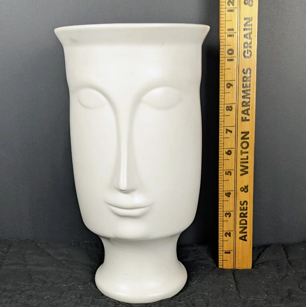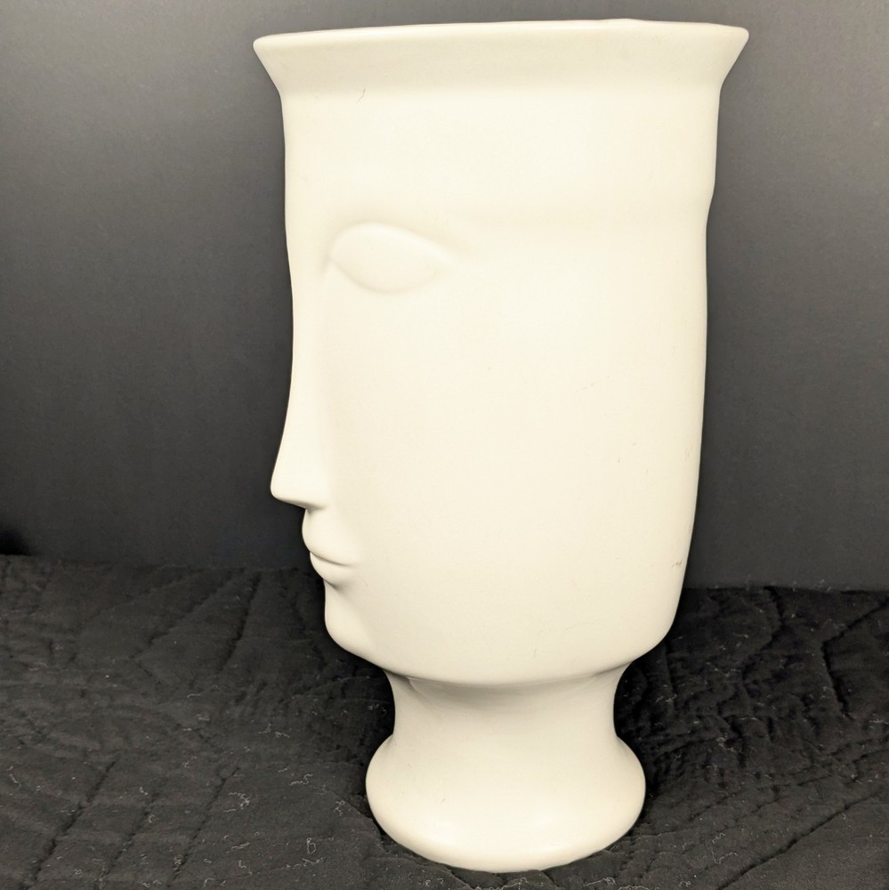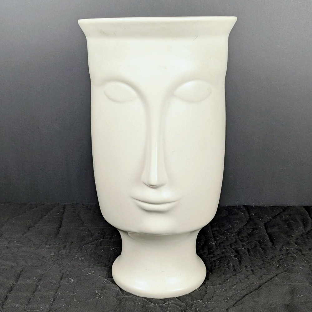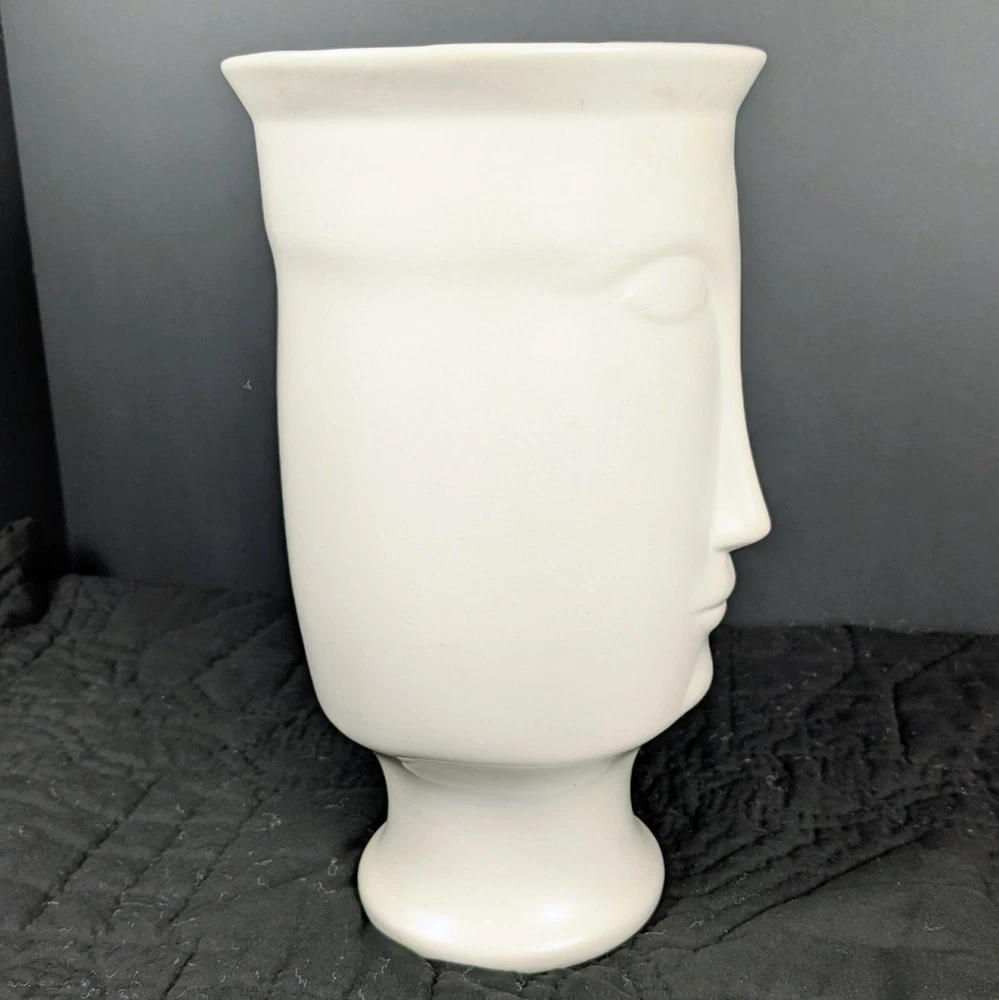 Striking 11-inch modern white face vase in the style of Jonathan Adler. Features elongated minimalist facial design with smooth matte white ceramic finish. Works beautifully as a planter, floral vase, or sculptural decor piece. • Approx. 11" tall • Approx. 6" opening • No drainage hole • Matte white ceramic Excellent condition with minor light surface wear. No cracks or chips. Perfect for modern, boho, mid-century, or contemporary interiors. Ships securely packed.