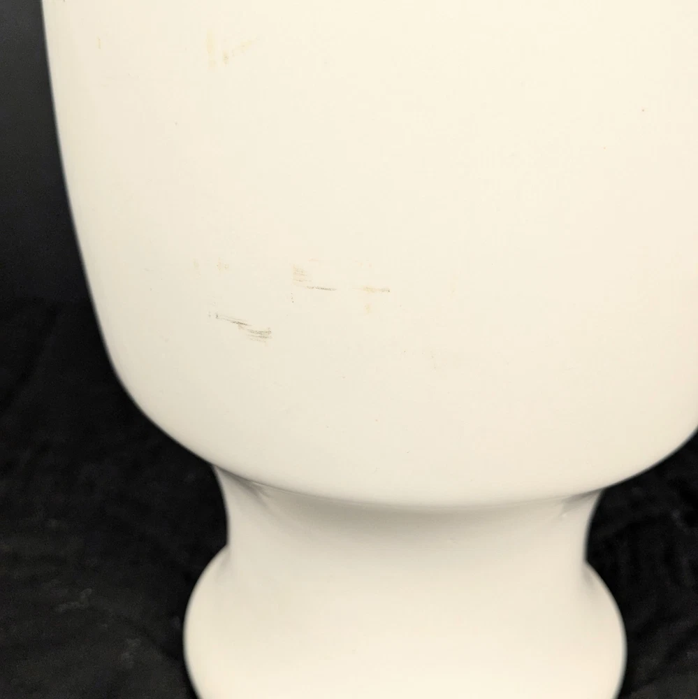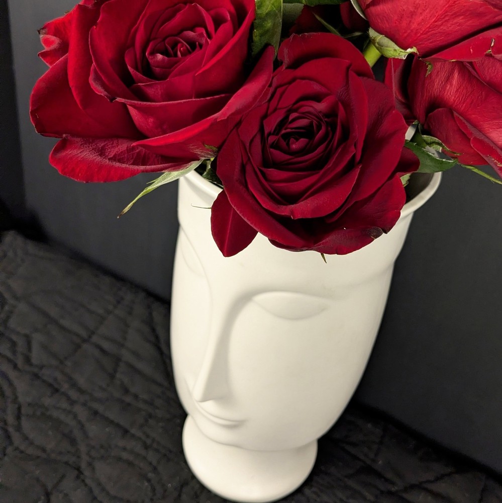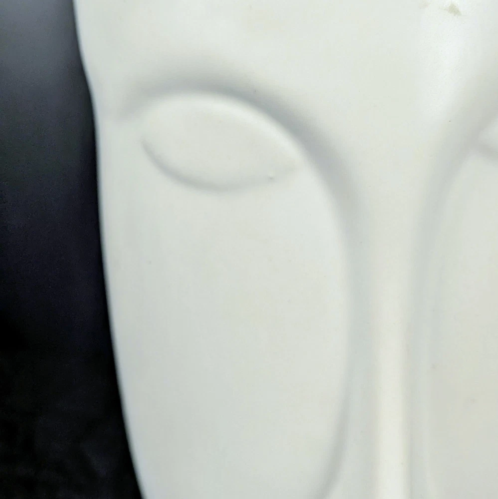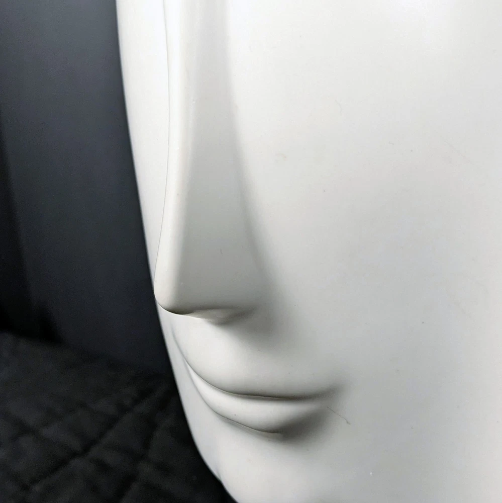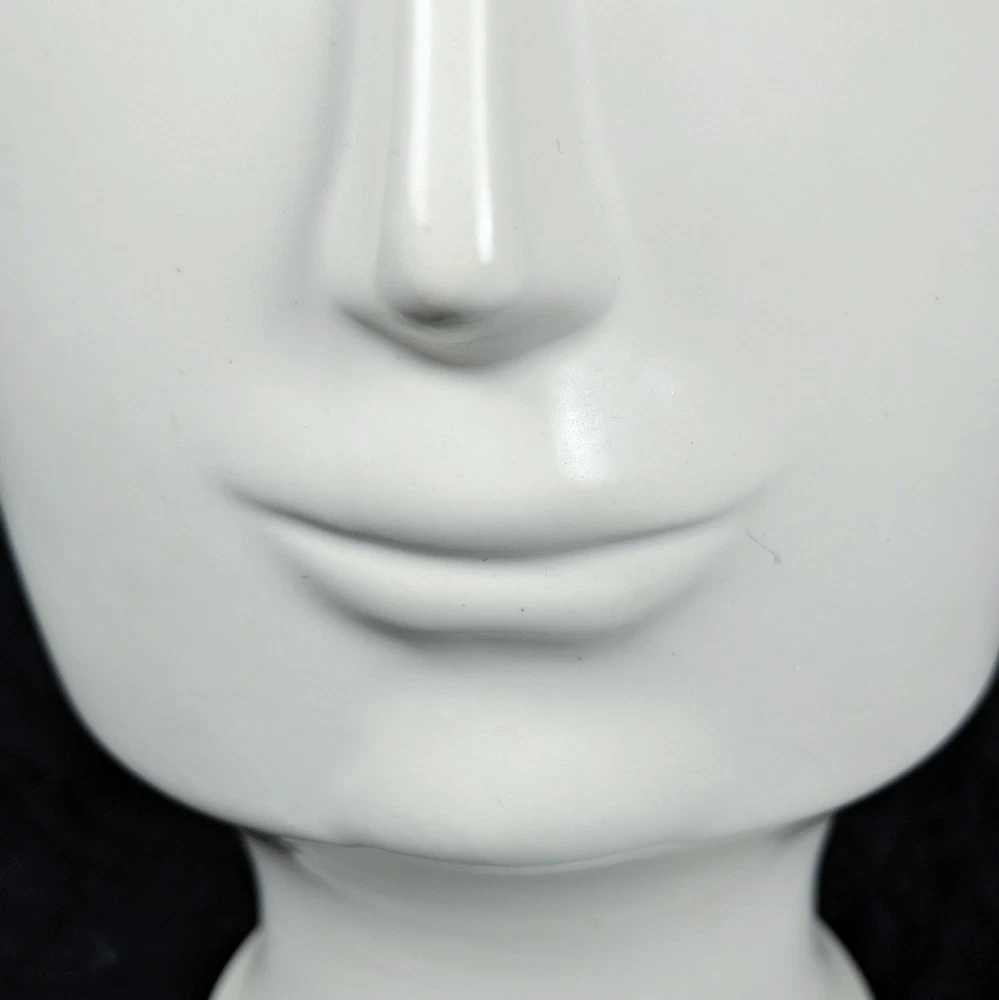 Striking 11-inch modern white face vase in the style of Jonathan Adler. Features elongated minimalist facial design with smooth matte white ceramic finish. Works beautifully as a planter, floral vase, or sculptural decor piece. • Approx. 11" tall • Approx. 6" opening • No drainage hole • Matte white ceramic Excellent condition with minor light surface wear. No cracks or chips. Perfect for modern, boho, mid-century, or contemporary interiors. Ships securely packed.