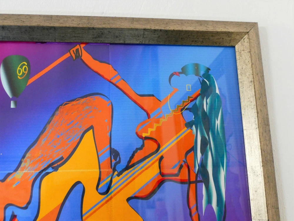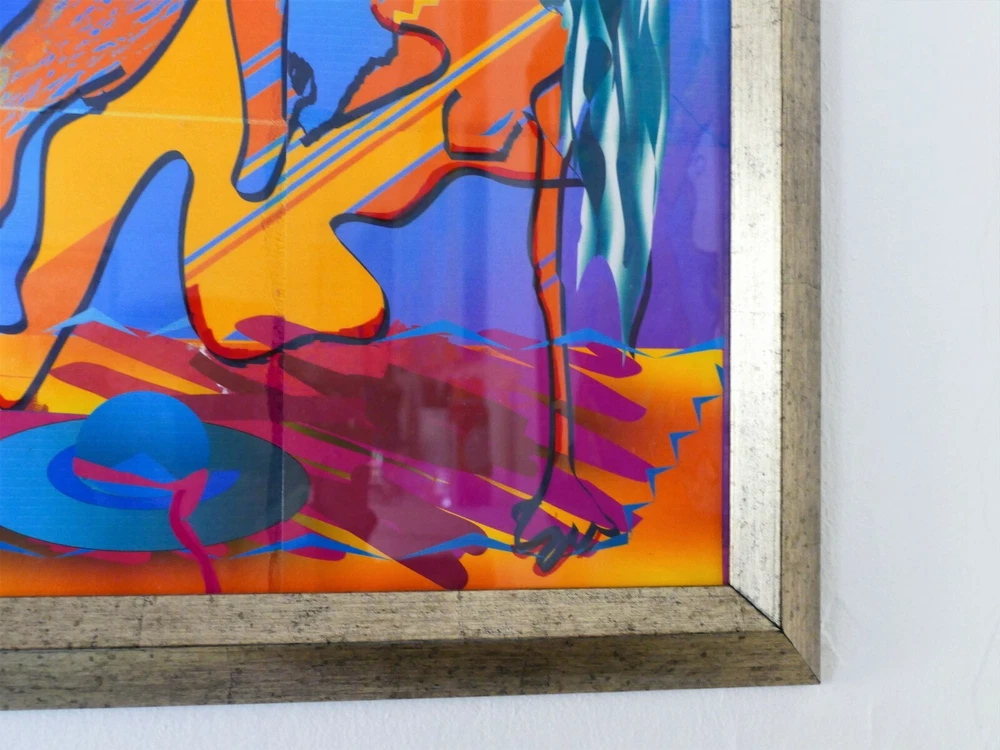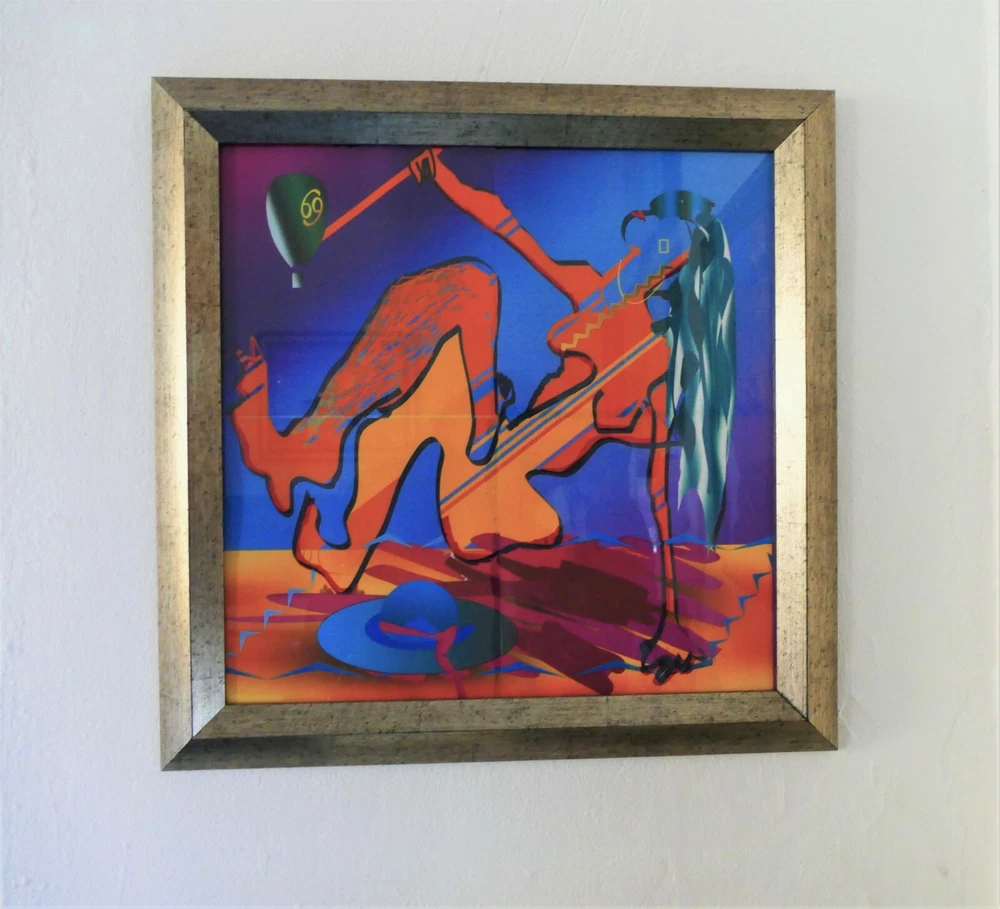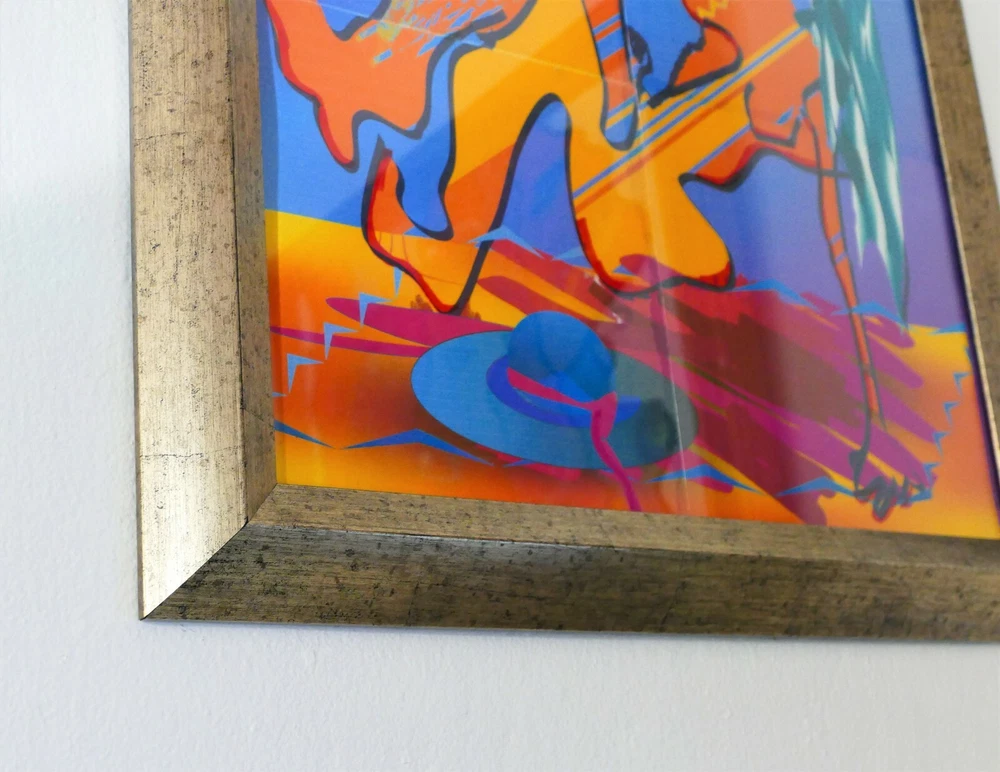 Original acrylic, modern abstract art signed. Gold metallic frame size 20"X20" Paint surface Heavy paper size: 16"x16". Acrylic on print paper.