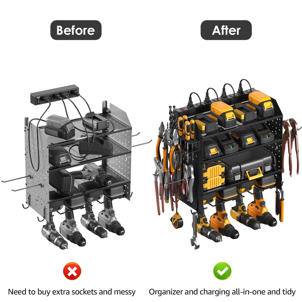 Black wall mount power tools organizer with power strip, pegboard design, 4 slots, 4 hooks, 4 pegboard hooks and side tools organizer, 4 layer structure shelf and one layer adjustable for actual needs, can keep rechargeable tools organized in the work area and save your bench space. Power tool organizer with charging station, come with 8 outlets. If you have a lot of rechargeable tools and cordless drills batteries, you can charge everything right in the rack and avoid searching for sockets. 6ft 14AWG power cord included. The tools in the picture are for demonstration purposes only and are not included. Very convenient for charging your tool batteries, All-in-one design and the metal power strip with surge protection of 1200J, Able to protect your device to a certain extent, output: 125V/15A/1875W. Utility rack size: L:16.5in * W:8.7in * H:16.57in. Can be mounted on pegboard. Add a tool box on the side to store multiple types of gadgets - Commonly used drill bits, tweezers, screwdrivers. Side panels are 0.25" pegboard design, come with four 5.4" long hooks and 4 hooks to hang tools, Strong enough and can hang heavy machines. to increase the diversity of storage. Easy to assemble and mount on a peg board, If you need more storage space, you can connect the two shelves (or more) by screws (Same height). Each layer of the grid can support a maximum weight of 33IB. Made from heavy gauge steel. Amazing christmas or father's day gift for men.