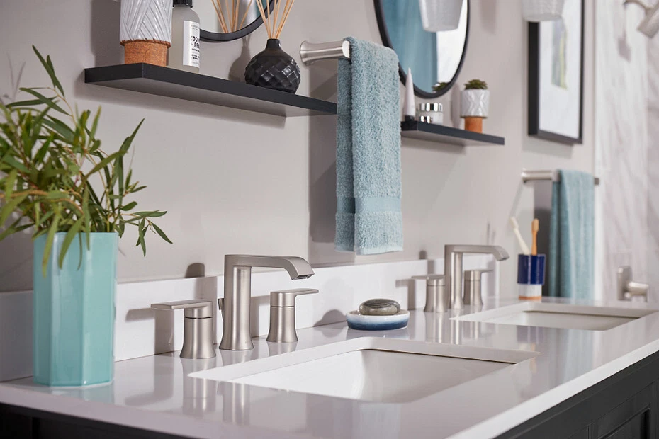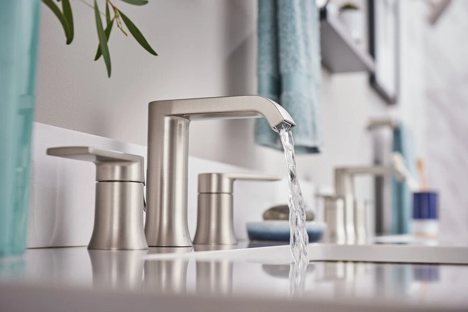 Moen 84763SRN Spot Resist Brushed Nickel Genta 2 Handle Bathroom Faucet Moen 84763SRN Spot Resist Brushed Nickel Genta 2 Handle Bathroom Faucet The Genta bath suite boasts contemporary, curved edges for an appealing, yet substantial style that brings a sleek feeling to the Bath. Spot Resist™ brushed nickel finish resists fingerprints and water spots for a cleaner looking bath two-handle lever handle makes it easy to adjust the water faucet handles can be installed between 8" to 16" for a more customized widespread installation complies with Americans with Disabilities Act (ADA) specifications features Duralock™ quick connect system for easy installation aerated flow is ideal for everyday bathroom tasks, like brushing teeth and washing hands meets current legislation, including ab1953 (california) and s152 (vermont) Listing and template services provided by inkFrog