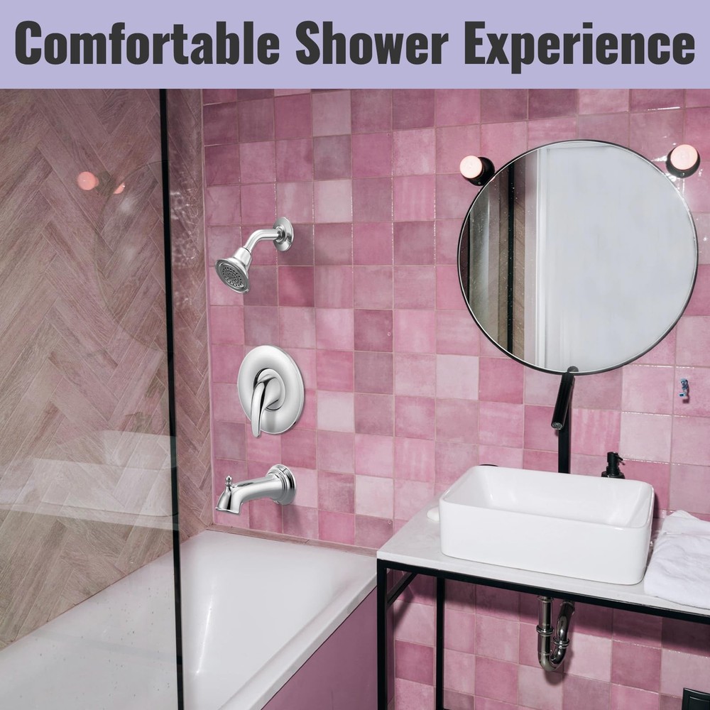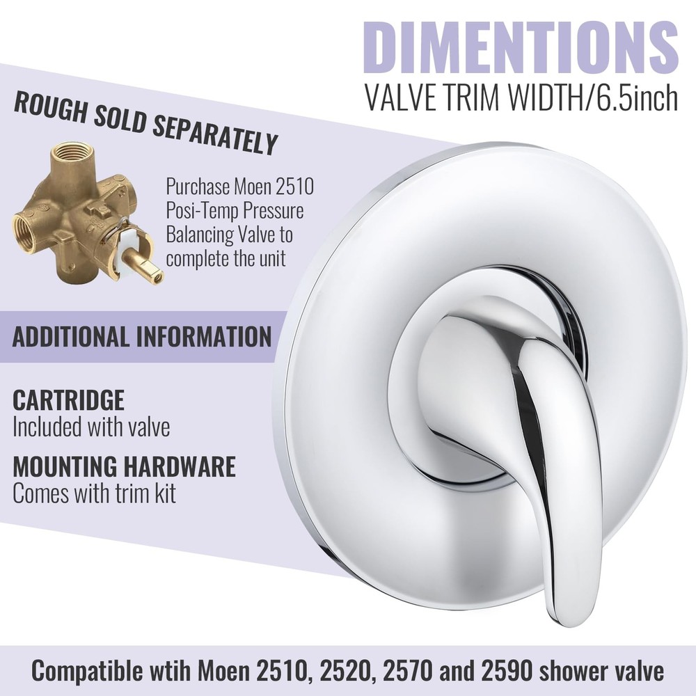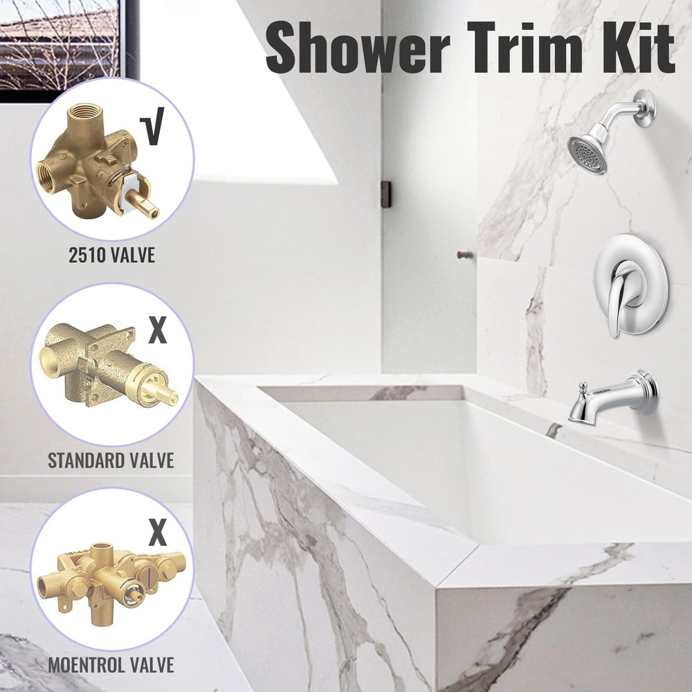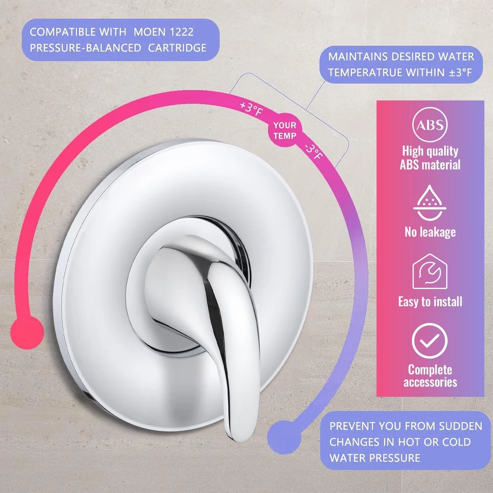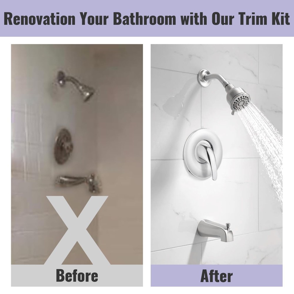 Upgrade your bathroom with our Single Handle Shower Valve Trim Kit, perfect for Moen tub and shower faucets. This universal kit is compatible with Moentrol and Posi-Temp cartridge-style faucets, including models with and without diverters. It replaces for moen chateau series, compatible with Moen T470 or Posi-Temp shower valve with and without diverters (Replaces existing moen shower trim kits 28951, 28951, 28961, 89273 and 89275). The kit includes a transparent acrylic handle, a metal handle, a faceplate trim, screws, adapters, and a hex wrench, ensuring you have everything needed for a seamless installation. Made from high-quality materials, this trim kit offers durability and reliable performance. Installation is straightforward with clear instructions provided. To properly install, you need a minimum of a 3-1/2 inch opening in the wall for the offset portion of the trim plate to set flush against the wall. This design ensures a secure and professional fit. With the single handle design, adjusting the water temperature is easy and precise, providing a comfortable and enjoyable shower experience. The kit is available in three elegant finishes: Chrome, Brushed Nickel, and Matte Black. For the Matte Black variant, the sleek black shower handle and trim kit add a touch of modern sophistication to your bathroom. This variant is perfect for those seeking a contemporary and stylish upgrade, combining functionality with aesthetics. Enhance your bathroom with our Single Handle Shower Valve Trim Kit, offering a complete replacement solution with universal compatibility, durable construction, and easy installation. Transform your shower experience with precise temperature control and a stylish design today. 【Universal Compatibility】This single handle shower valve trim kit is compatible with moen chateau series, compatible with Moen T470 or Posi-Temp shower valve with and without diverters (Replaces existing moen shower trim kits 28951, 28951, 28961, 89273 and 89275) 【Complete Replacement Kit】Compatible wtih Moen 2510, 2520, 2570, and 2590 valve, fits for Moen 1222(B) Cartridge, includes a transparent acrylic handle, metal handle, faceplate trim, screws, adapters, and allen wrench for a comprehensive shower control valve kit 【Durability Construction】Made from high-quality ABS materials, this shower valve trim kit ensures long-lasting durability and performance, making it a reliable choice for your bathroom 【Easy Installation】To install this shower handle replacement trim kit, ensure a minimum 3-1/2 inch wall opening for the trim plate to sit flush against the wall 【Simple Temperature Control】The shower single lever handle design allows for easy and accurate adjustment of water temperature, providing a comfortable and customizable shower experience