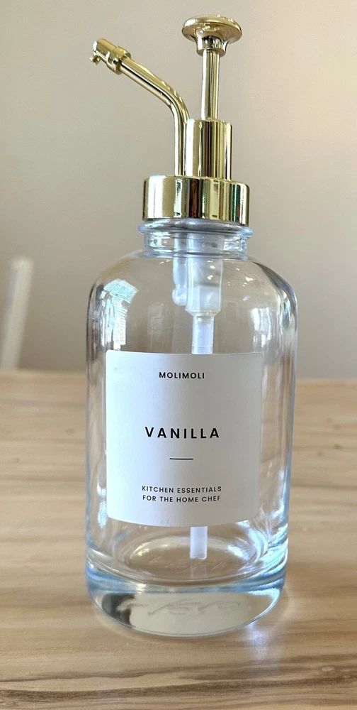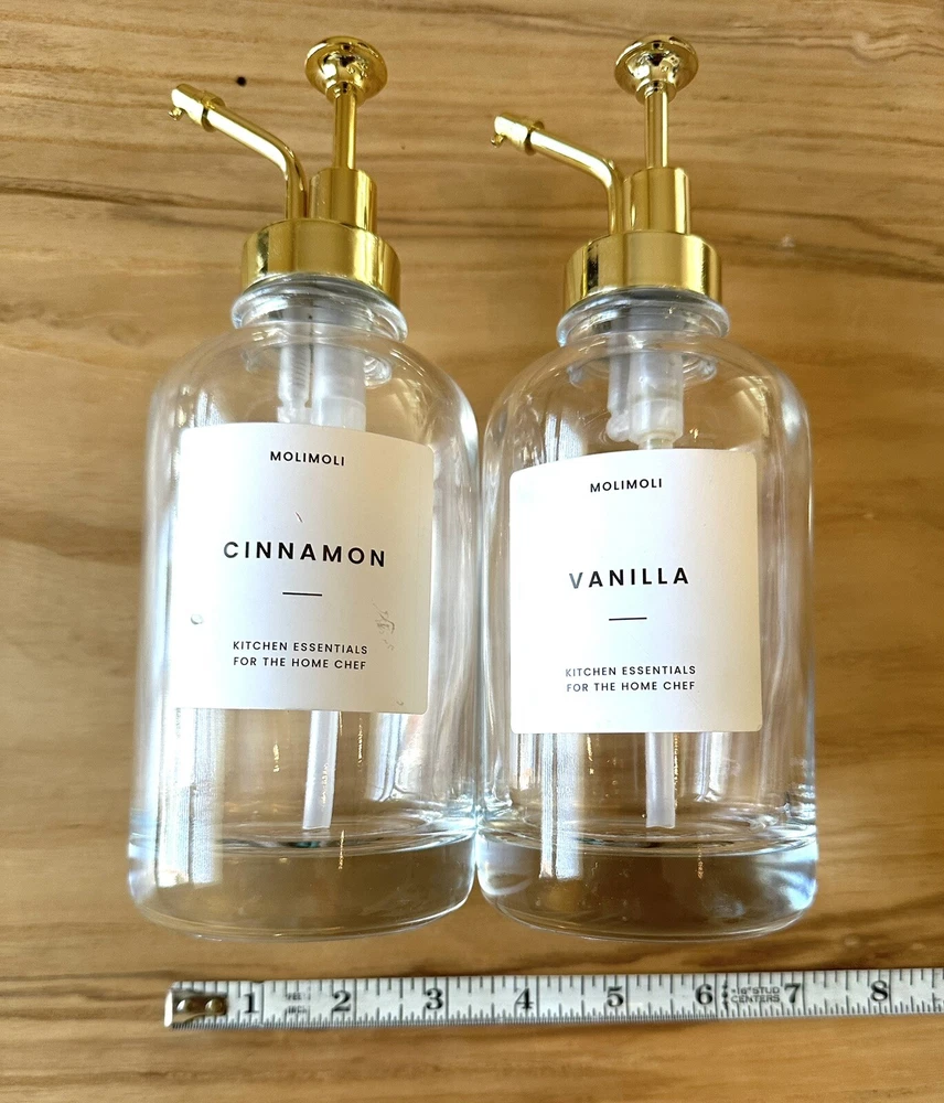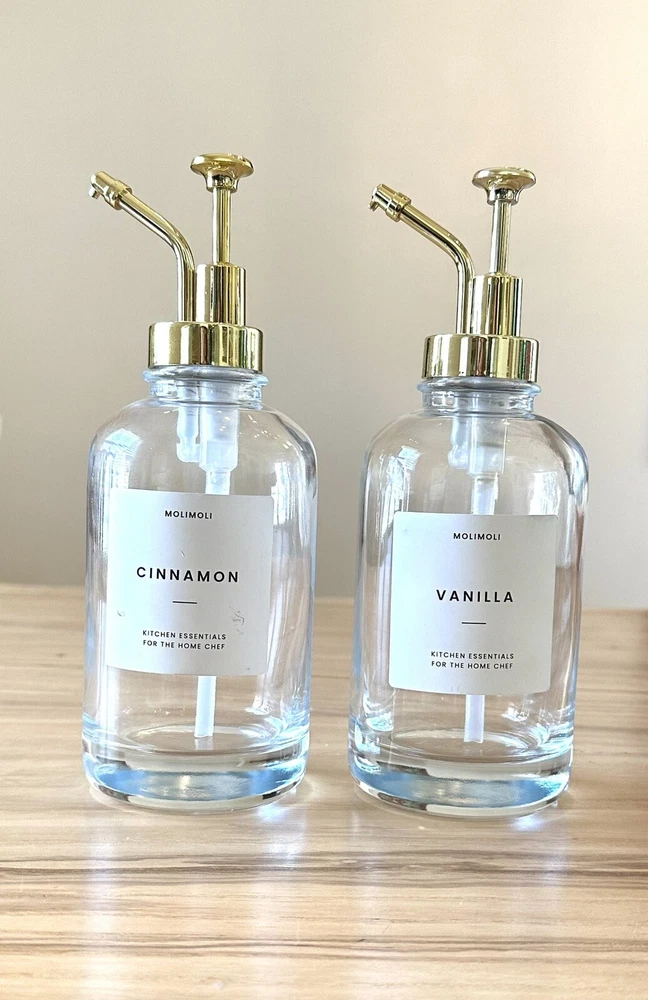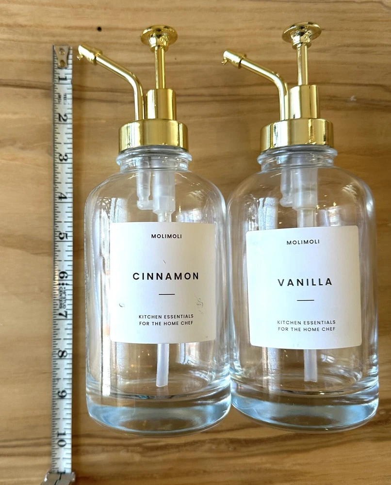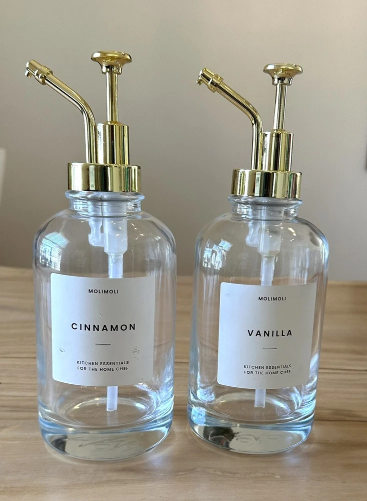 Molimoli Coffee Syrup Dispenser For Coffee Bar Bottles 2 Pack Gold 16.9 Oz. One bottle labeled cinnamon and the other item is labeled vanilla. These are brand new never used without box. Please see photos for details.