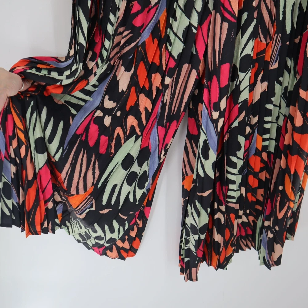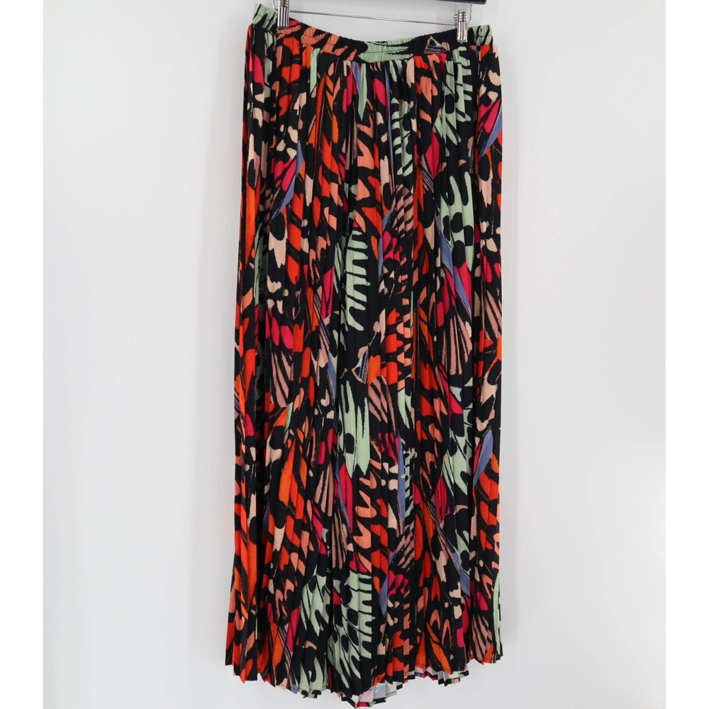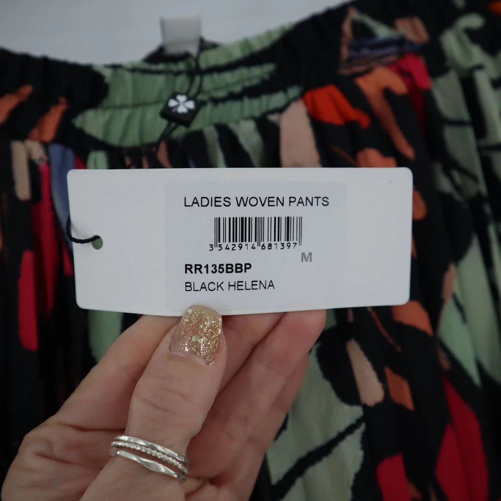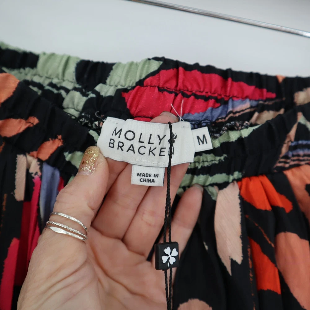 LISTING TITLE Molly Bracken Black Helena Palazzo Pants Colorful Abstract Pleated Office Career Add a pop of color to your wardrobe with these vibrant woven pants. Who knew comfort could look this good? • Elastic waistband • Abstract design • 100% polyester • Lightweight • Made in China Medium: Waist laid flat = 15 inches Rise = 14 inches Inseam = 28 inches Leg opening = 11 inches Condition: New With Tags