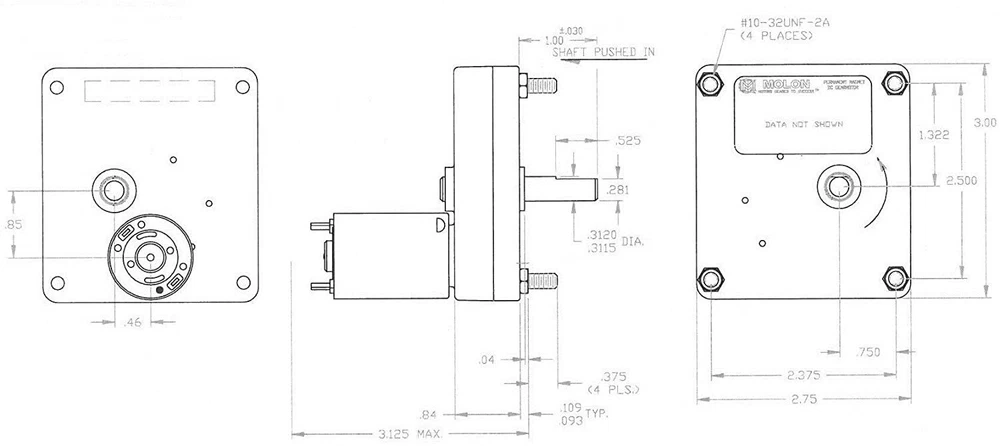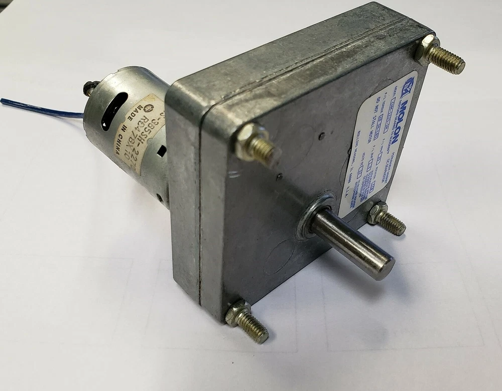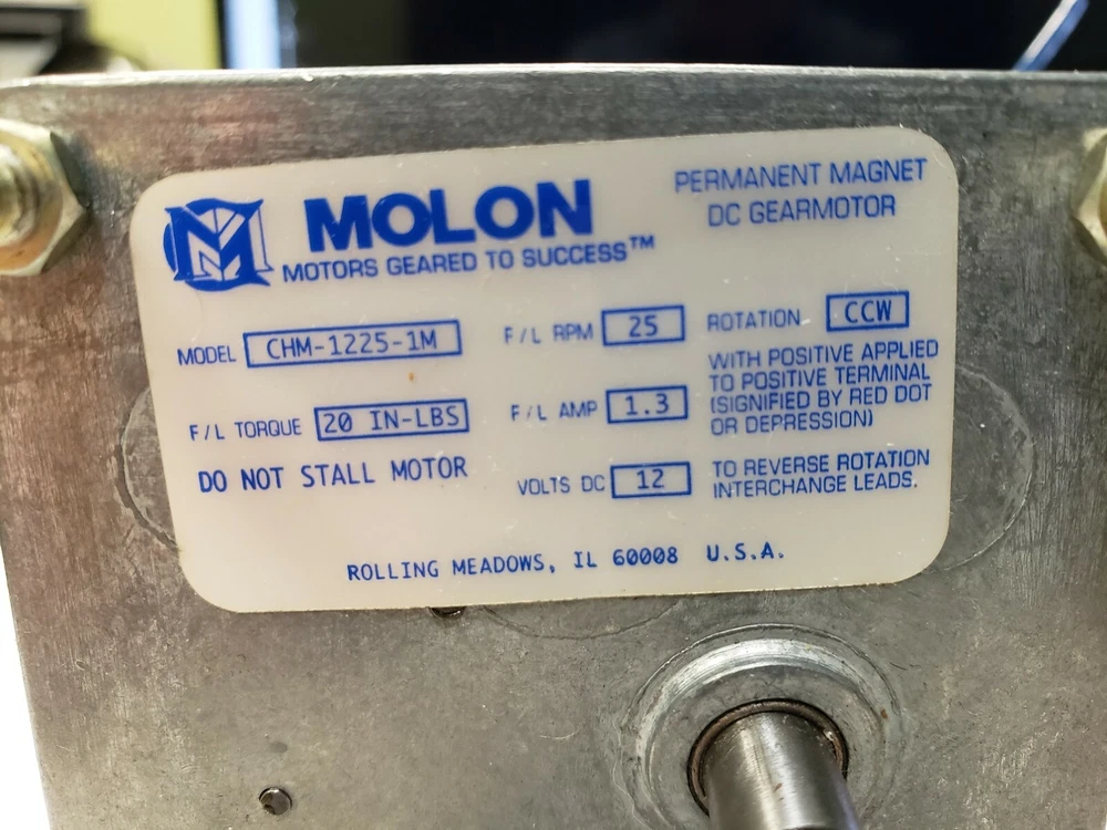 Molon Motors 12 Volt DC Gearmotor - 25 RPM 5/16” Shaft CW/CCW New, surplus and without packaging, gear motor from Molon Motors. Permanent magnet DC gearmotor Model – CHM-1225-1M Rated voltage – 12VDC RPM – 25 @ 12 volts F/L AMP – 1.3 amps F/L Torque – 20 IN-LBS Rotation – CW/CCW Shaft – 5/16” with a flat Dimensions – 3” x 2-3/4” x 3-3/4” Mounting dimensions – (4) 10-32 studs 3/8” long in a rectangular 2-3/8” x 2-1/2” pattern Weight – 16 oz
