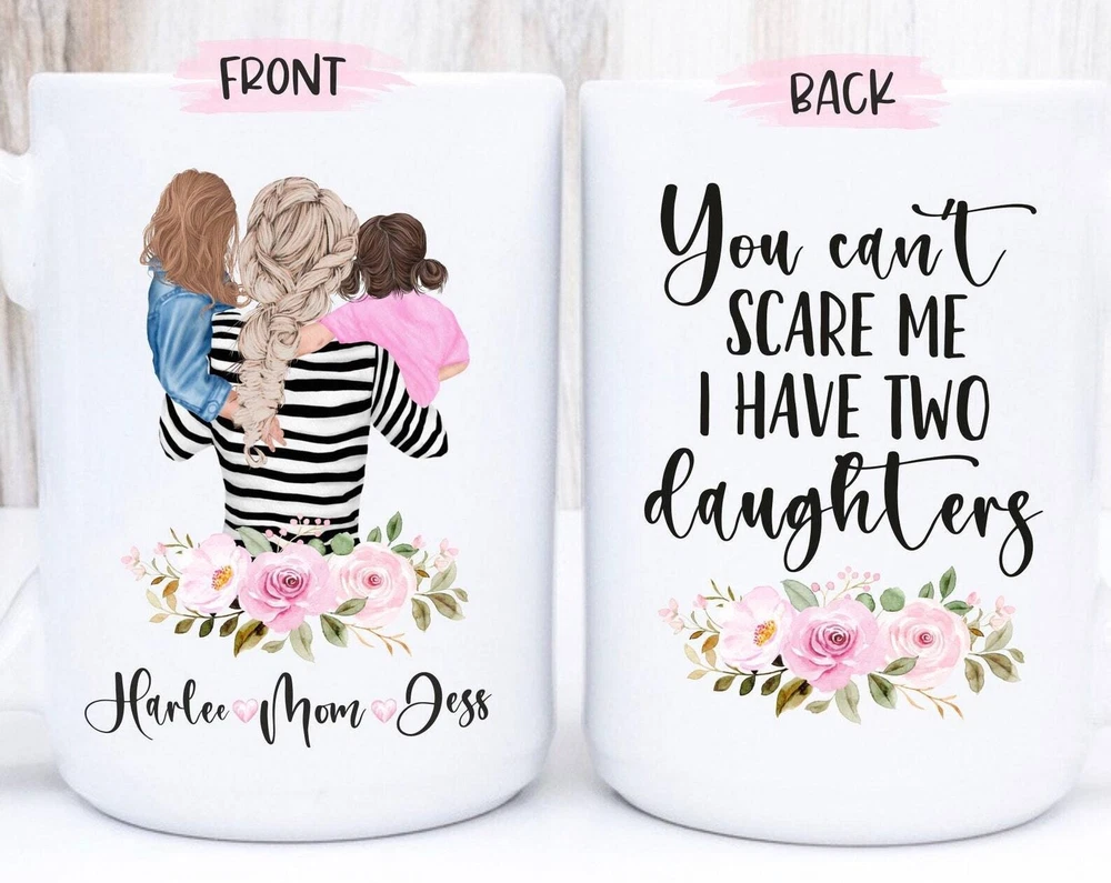 Mom And Daughter Mug Mom Of Girls Mug You Can't Scare Me I Have Daughters Gift Product Details.. This high quality 11oz. ceramic white mug has a premium hard coat that provides crisp and vibrant color reproduction sure to last for years. Perfect for all hot & cold beverages. The highest quality printing possible is used. It will never fade no matter how many times you wash it. Material: 100% Ceramic. Print both sides. Dishwasher and Microwave Safe. High Gloss + Premium White Finish. Printed in the U.S.A. Personalized & Custom. We support personalized and custom mug to add custom, when placing an order, you can add notes to the "order note" in shipping address section. Also you can contact us directly via message. Shipping Info. Ready to ship in 1 to 2 business days, All products are made-to-order and proudly printed in the United States. Shipped by USPS and DHL, You will receive your order in 5-7 days. Replace & Refund. All products are defective during shipping broken, chipped will be replaced free of charge. You are not satisfied with the product, we will refund 100% money to you. If any other issues arise, please do not hesitate to message, we would be more than happy to assist you.