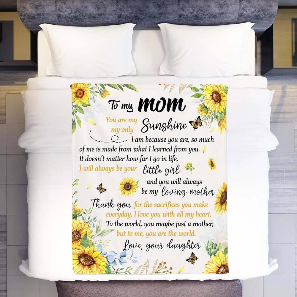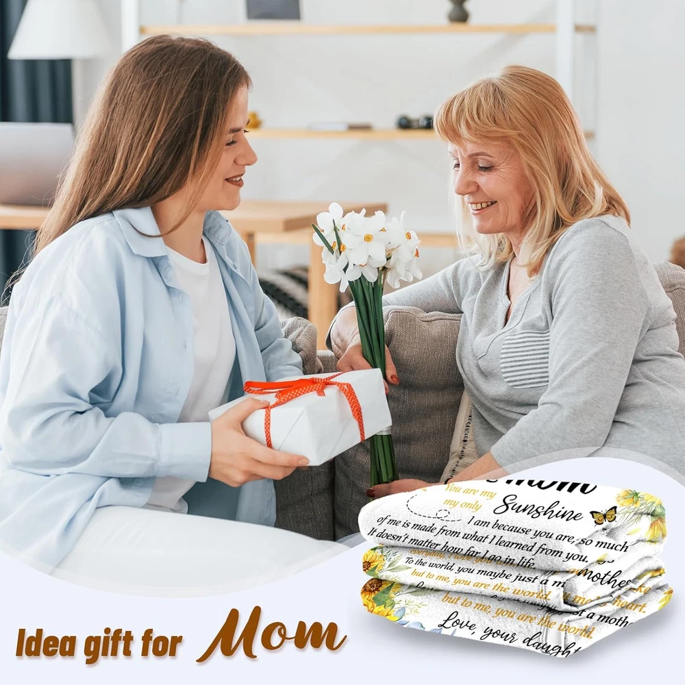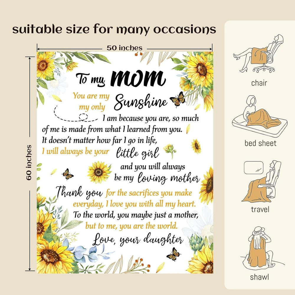 Store New Arrivals Add to Favorite View Feedback Contact Fast deliveries to the customer's home Quality customer service John Make the customers happy! Mom Blanket from Daughter on Christmas, Mom Birthday Gifts, Birthday Gifts for Mom Who Has Everything, to My Mom Soft Flannel Throw Blanket 50 X 60 Inch Description 【Perfect Mom Gifts from Daughter】- Give your mom the ultimate expression of love with our unique and practical mom blanket. Featuring a heartfelt message in a creative design, this blanket offers comfort and healing through all of life's challenges. 【Mom Birthday Gifts】- This mom blanket is more than just a gift, it's a warm hug from a loving daughter. Perfect for any occasion such as Mother's Day, Thanksgiving, or Christmas, this blanket is the perfect way to show your mom just how much you care. 【Soft and Premium Quality】- Our mom blanket is made from soft and fleecy material that feels great on both sides. It doesn't pill or pull, and the stitching is strong and reliable. 【Lightweight & Versatile Use】 - Whether it's a cold winter night or a summer nap on the couch, our mom blanket is perfect for any occasion. It's lightweight and easy to take with you wherever you go, and it can even be used as a children's crawling blanket. 【Easy To Care & Well-Packed】 - Our mom blanket is not only comfortable and convenient but also easy to care for. It's machine washable in cold water and won't lose its shape or color over time. Plus, our vacuum packing ensures that it stays clean and moisture-resistant until you're ready to use it. Product Description Age Range Description Adult Style mom Number of Items 1 Pattern Floral Material Type Flannel Blanket Form Throw Blanket Theme Love Fabric Type Polyester Material Flannel Model Name LHY001 Seasons All Additional Features Skin Friendly, Breathable Water Resistance Level Not Water Resistant Sport Type Camping Special Feature Skin Friendly, Breathable Item Dimensions L x W 60"L x 50"W Fabric Warmth Description Lightweight Color White Style Name mom Recommended Uses For Product Working, Travel, Reading, Napping Product Care Instructions Machine Wash Size 50 x 60 inch ABOUT US We offer the best prices around on high quality products. Our E-store includes media such as books, movies, music and games while offering electronics, toys, sporting apparel, clothing, tools, general home, garden items and more. SHIPPING We are always working hard to ensure your package arrives as soon as possible. Please understand that some factors like weather, high postal traffic, and the performance of shipping companies are outside of our control. We offer free shipping to the lower 48 states and ship within 2 business days of payment, usually sooner. We do not accept P.O. Boxes. Please provide a physical address. For shipping outside of the continental USA, we only use eBay's Global Shipping Program. The item is shipped to KY and then sent to the rest of the world. International customers are responsible for all duties and taxes. Continue to 'check out' to calculate costs for shipping the item to your country. Messages regarding eBay's Global Shipping Program MUST be directed at eBay EXCLUSIVELY. RETURNS We offer a 30-Day Return Policy on items in which you are not completely satisfied with. You have the option of a full-refund or an exchange of the item. No returns are available on items shipped outside of the USA PAYMENT We accept PayPal. CONTACT US This page content is yet to come Please ad us to your favorite seller and visit again later Thank You CUSTOMER SATISFACTION We try our very best to make sure every customer is completely satisfied. If there's a problem, message us! We're happy to help. WE ACCEPT