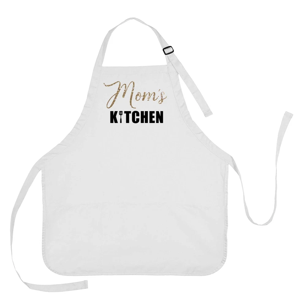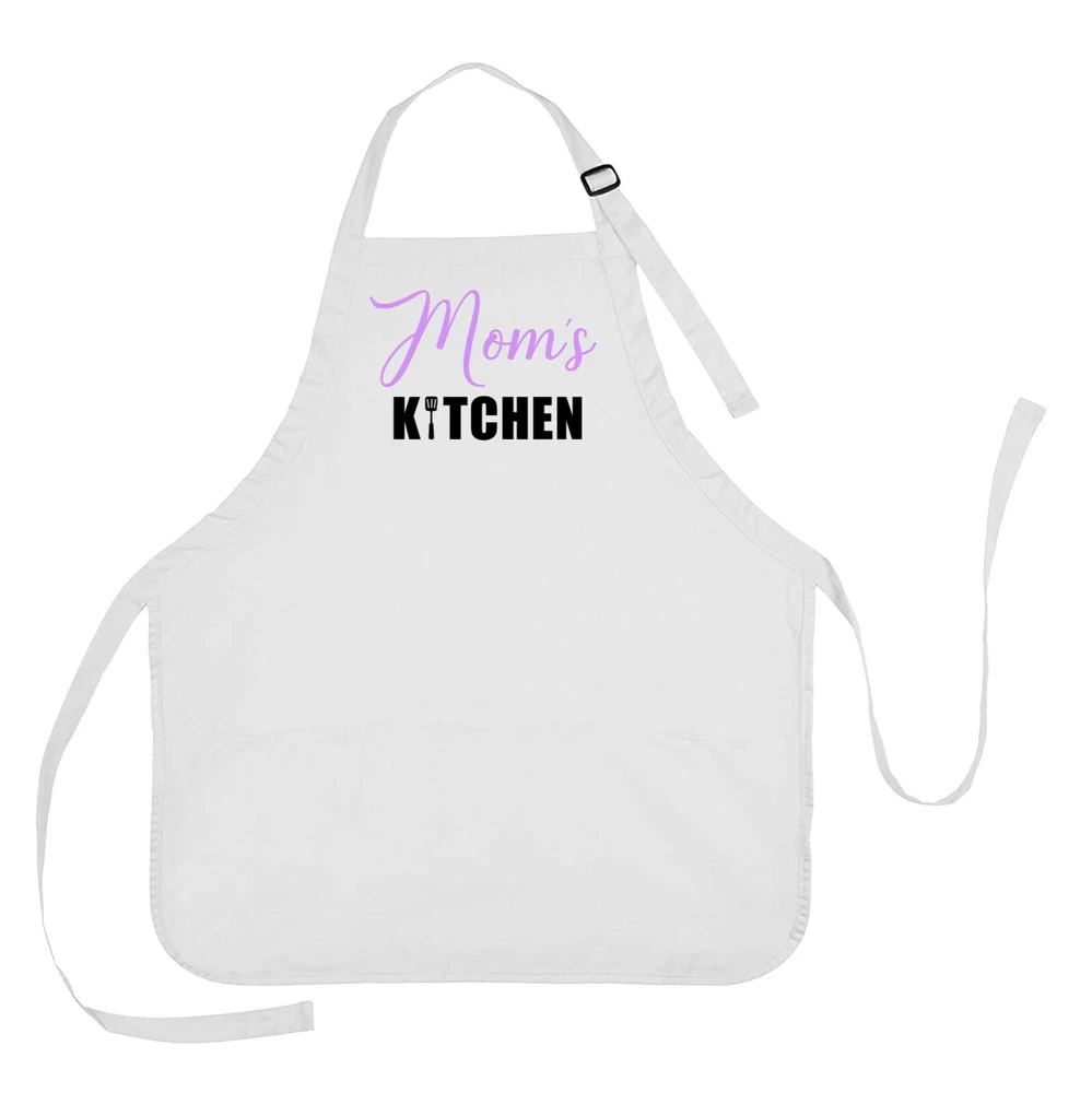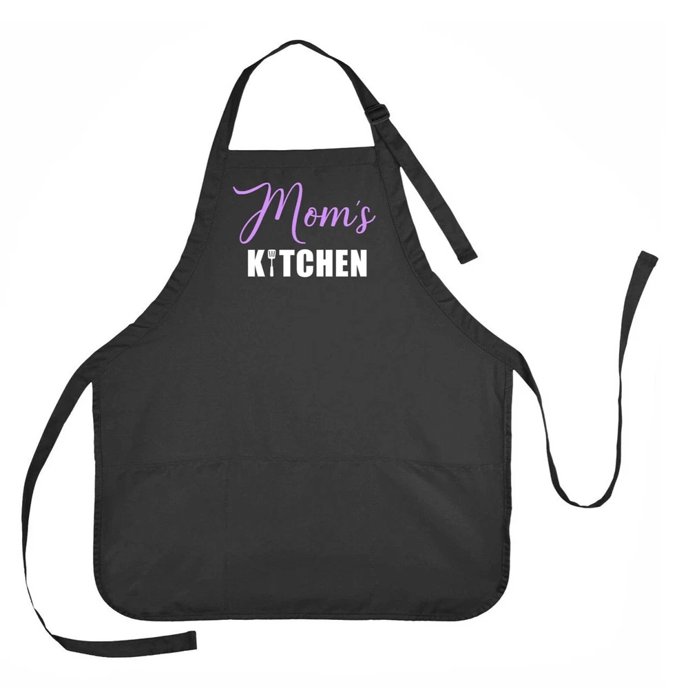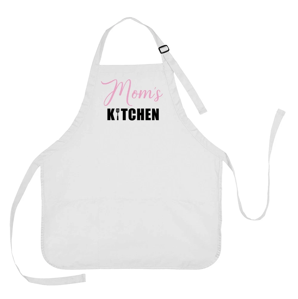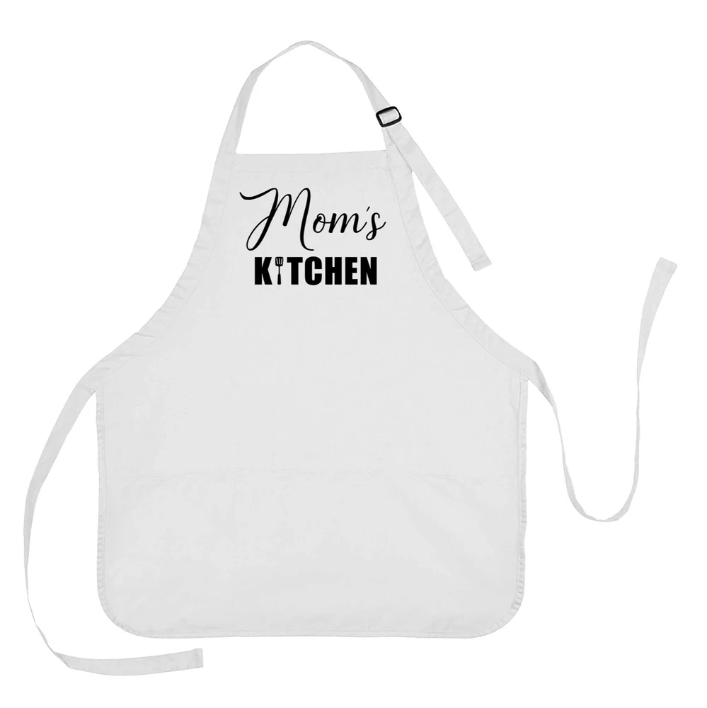 Looking for a great gift for those Mom's that love to cook.... look no further! Shop Personalized Gifts has created an apron that says " Mom 's Kitchen" using heat pressed vinyl. You can choose from either a white or black apron from the drop down menu provided. We offer a 22"x 24" apron with 3 front pouches, a 22" x 30" apron with 2 front pouches, and a 2-XL size which is 26.5" x 35.5" with 2 front pouches. The apron is made from a poly blend cotton and has an adjustable neck buckle. Care These aprons are machine washable. Machine wash with cold water on a gentle cycle with mild detergent. Tumble dry low. Shipping We ship via USPS. We offer first class shipping (2-5 business days) and priority mail (1-3 business days).