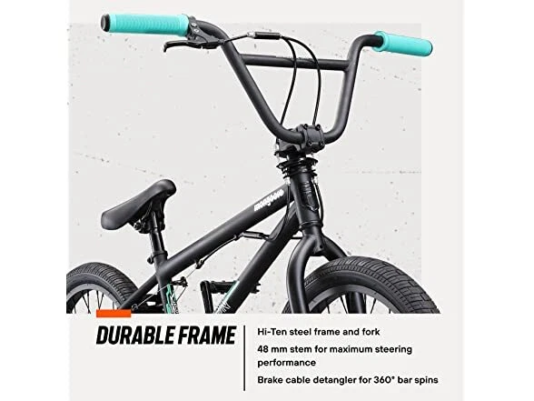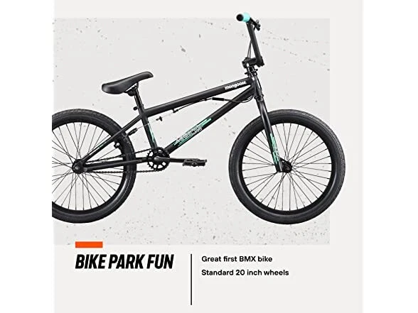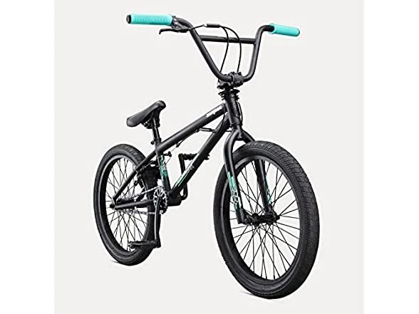 Mongoose Legion L10 Freestyle BMX Bike Line for Beginner-Level to Advanced Riders, Steel Frame, 20-Inch Wheels, Black/Teal Condition: New Color: Black/Teal Features A great first BMX bike that features the geometry and feel preferred by today’s riders. With 20-Inch wheels the suggested rider height is 52 to 60 inches The L10 features a durable Hi-Ten Steel frame and removeable brake mounts with a 20” top tube length Single speed drivetrain features 170 mm one-piece forged steel crank with a 25T steel chainring and American loose ball bottom bracket The wheelset features 20” x 2.25” tires mounted on aluminum single wall 36H rims with 3/8” female axle front hub and 9T cog sealed bearing cassette rear hub Steel U-brake and aluminum/resin brake levers provide precision speed control, while the Hi-Ten handlebar and fork are joined by a 48 mm stem and threadless sealed integrated headset for maximum steering performance Specs In the Box: (1) Mongoose Legion L10 Freestyle BMX Bike Line for Beginner-Level to Advanced Riders, Steel Frame, 20-Inch Wheels, Black/Teal