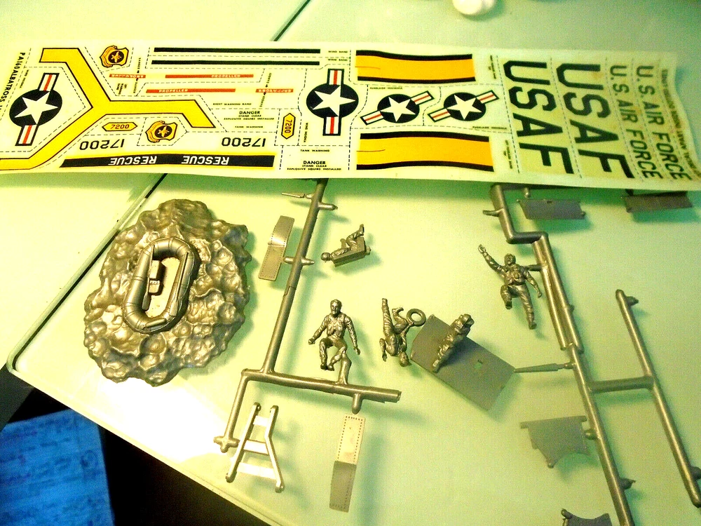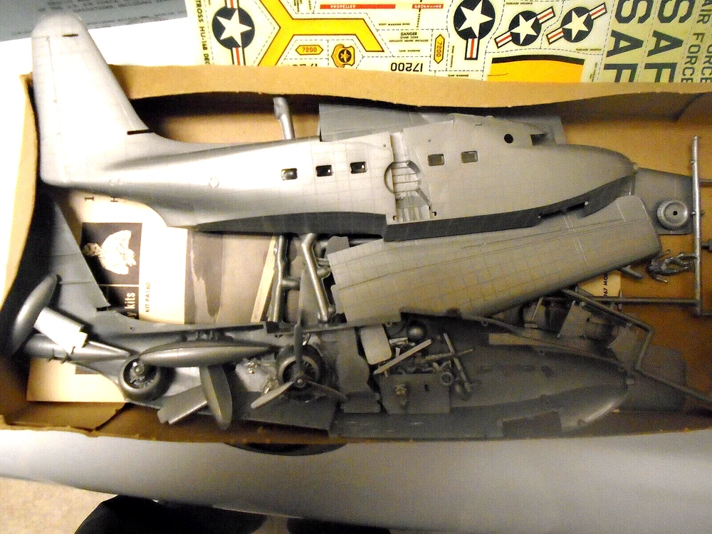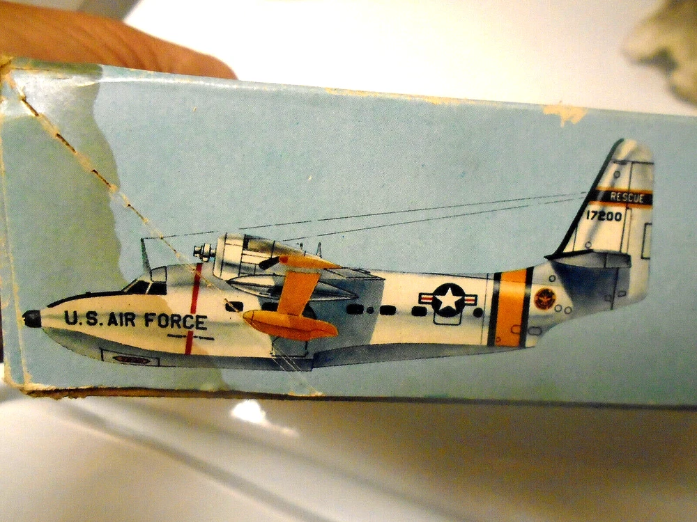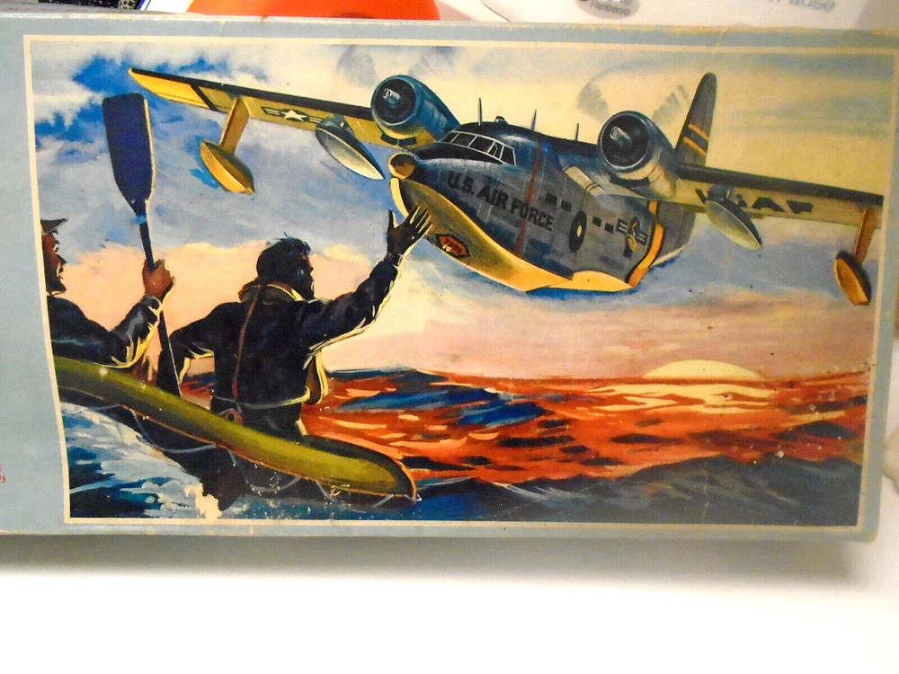 Here is a vintage 1967 released MONOGRAM manufactured plastic aircraft model kit. The awesome U.S.AIR FORCE ,GRUMMAN "HU-16B ALBATROSS Rescue plane" . Box has much 'shelf wear'. The kit is 1:72nd scale Personnel figures, operating landing gear and a Lifeboat plus untouched water slide decal sheet and instruction sheet ARE PRESENT. A pilot glued in position and a prop installed are the only parts 'started' that I see. No painting has been attempted. All said, perhaps you would like to add this classic kit to your WW 2 Military aircraft model collection. Thanks for looking !