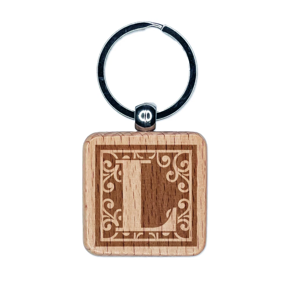 Monograma remolinos letra mayúscula L grabado madera cuadrado llavero etiqueta dije