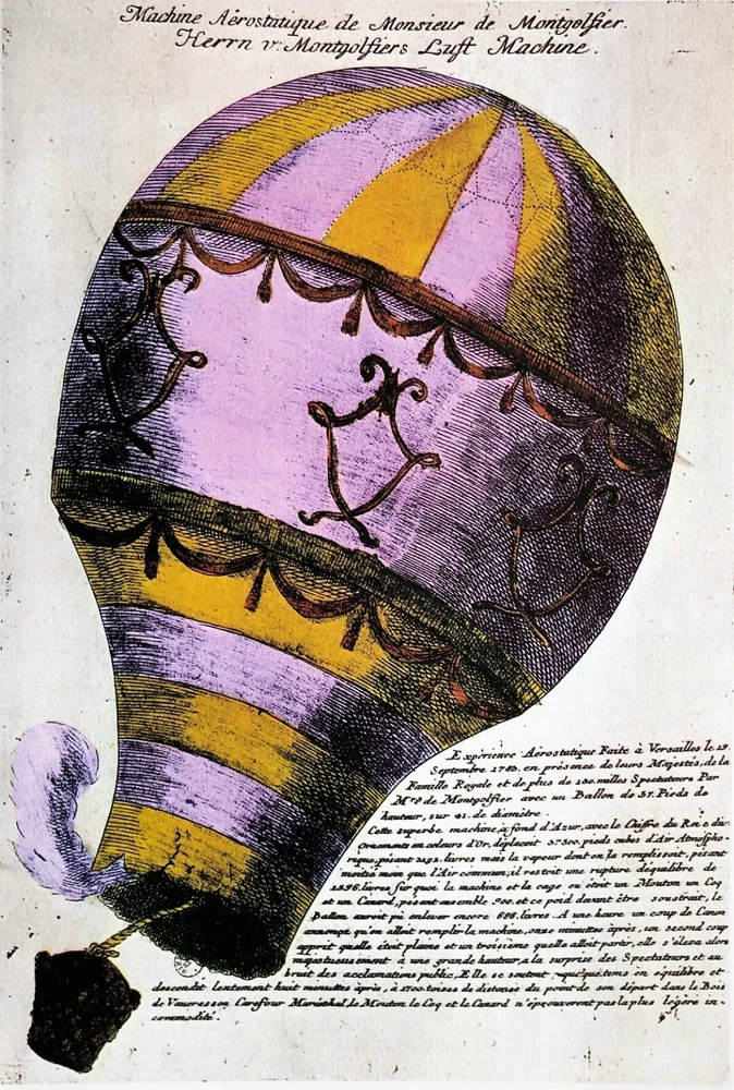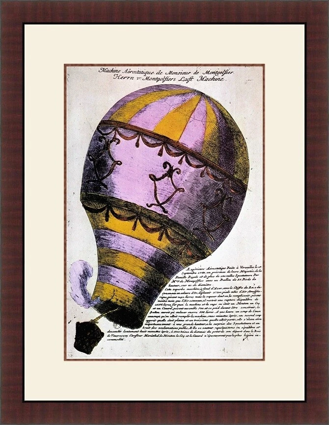 Aviation Art Title of Piece - Montgolfier's Hot Air Balloon Image Size 8" x 12" Custom Framed Size 15" x 19" Reproduction Print from 1978 Custom Framed in a 1 1/2" Cherry Frame Double Matted with Cream Outer Mat & Maroon Inner All of Our Framing Materials are 100% Acid Free to Museum Standards Enclosed in Glass, Dust Covered Backed, Wired Ready for Hanging These are Professionally Custom Framed Not Store Bought Ready Made Frames If You Have Any Questions About Any Of Our Items Please Email Us. 52-615