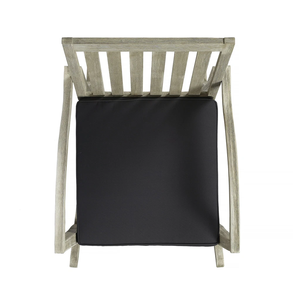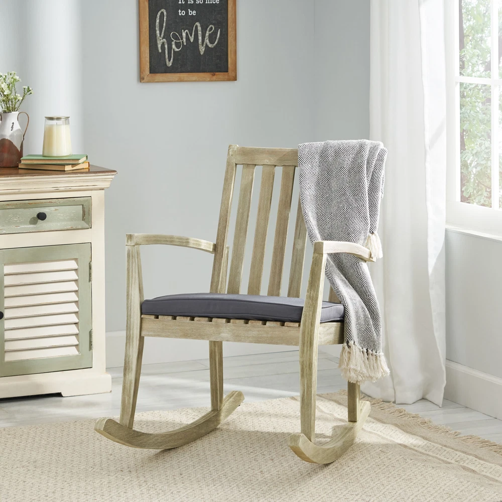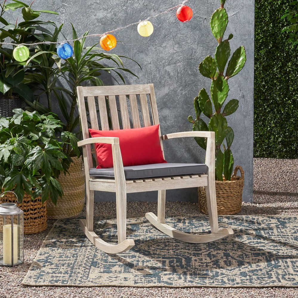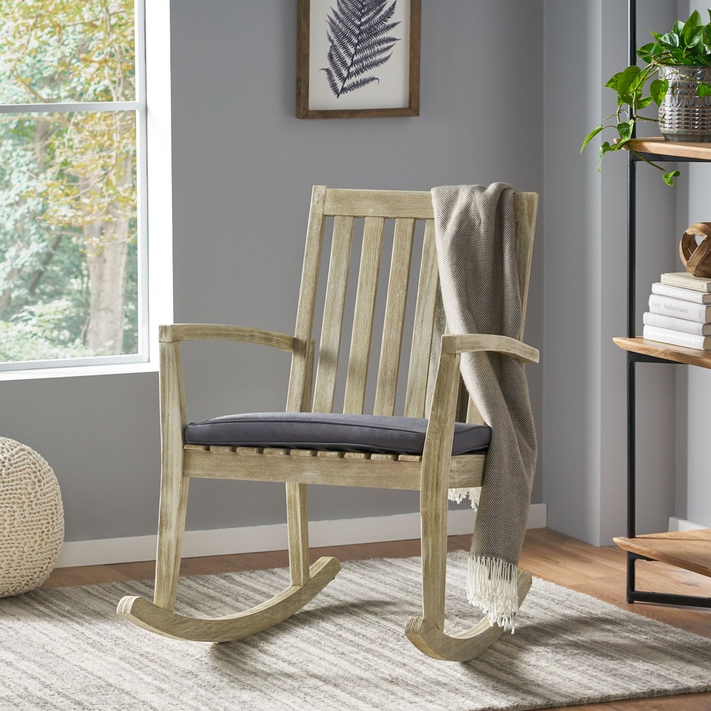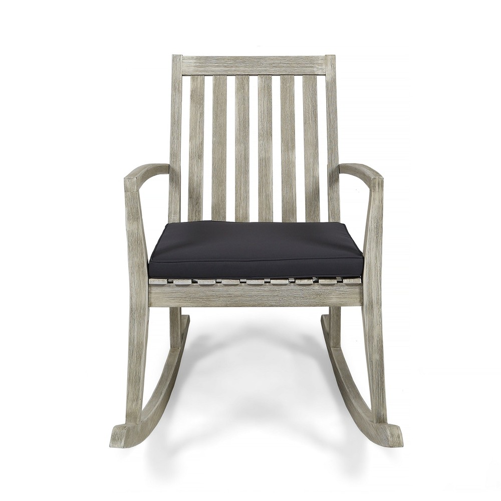 Specifications Place of Origin #originPlace# Main Color Grey Main Material Acacia Wood Dangerous Goods #dangerFlag# Dimensions & Weights Assembled Length (in.) 24.75 Assembled Width (in.) 36.50 Assembled Height (in.) 35.75 Weight (lbs) 23.15 Product Features Item Description: Put yourself at ease after the stress of the day on the comfort of your porch or patio area with the help of this cushioned, acacia wood rocking chair. Its versatile design and universally-flattering look make it an excellent way to round out your current outdoor furniture collection. ROCKING FUNCTIONALITY - Its smooth motion is soothing and great for families with small children. CONVENIENT SIZE - This piece is accommodating yet compact, making it suitable for porches and patios of all shapes and sizes. MID-CENTURY STYLE - Its solid, genuine acacia wood frame is polished to a rich sheen and sports a wire-brushed light gray finish; it features carved accents and slatted backing. WATER-RESISTANT CUSHION - A removable, dark gray, machine-washable cushion cover allows you to do away with spills and stains without breaking a sweat. EASY ASSEMBLY - This piece comes with all necessary tools and hardware included. Frame Material Details : Acacia Wood Leg Material Details : Acacia Wood Care Instructions : Spot Clean Description